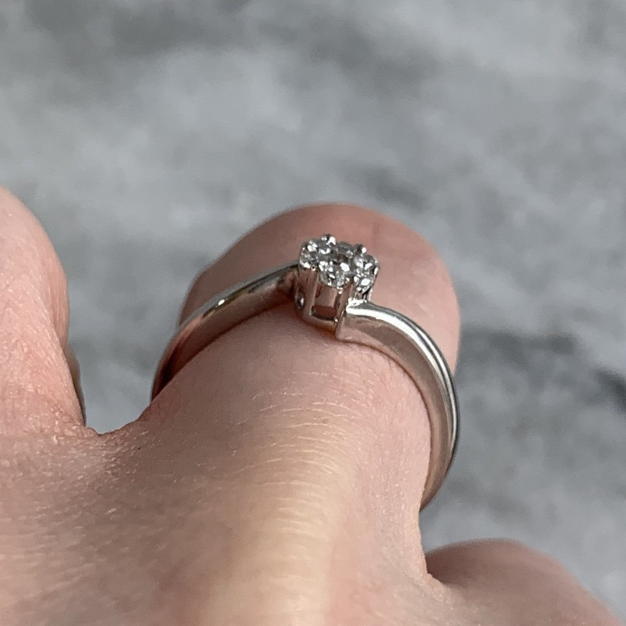 A lovely white gold bypass style ring showcasing a daisy flower style cluster of diamonds amounting to .15ct.