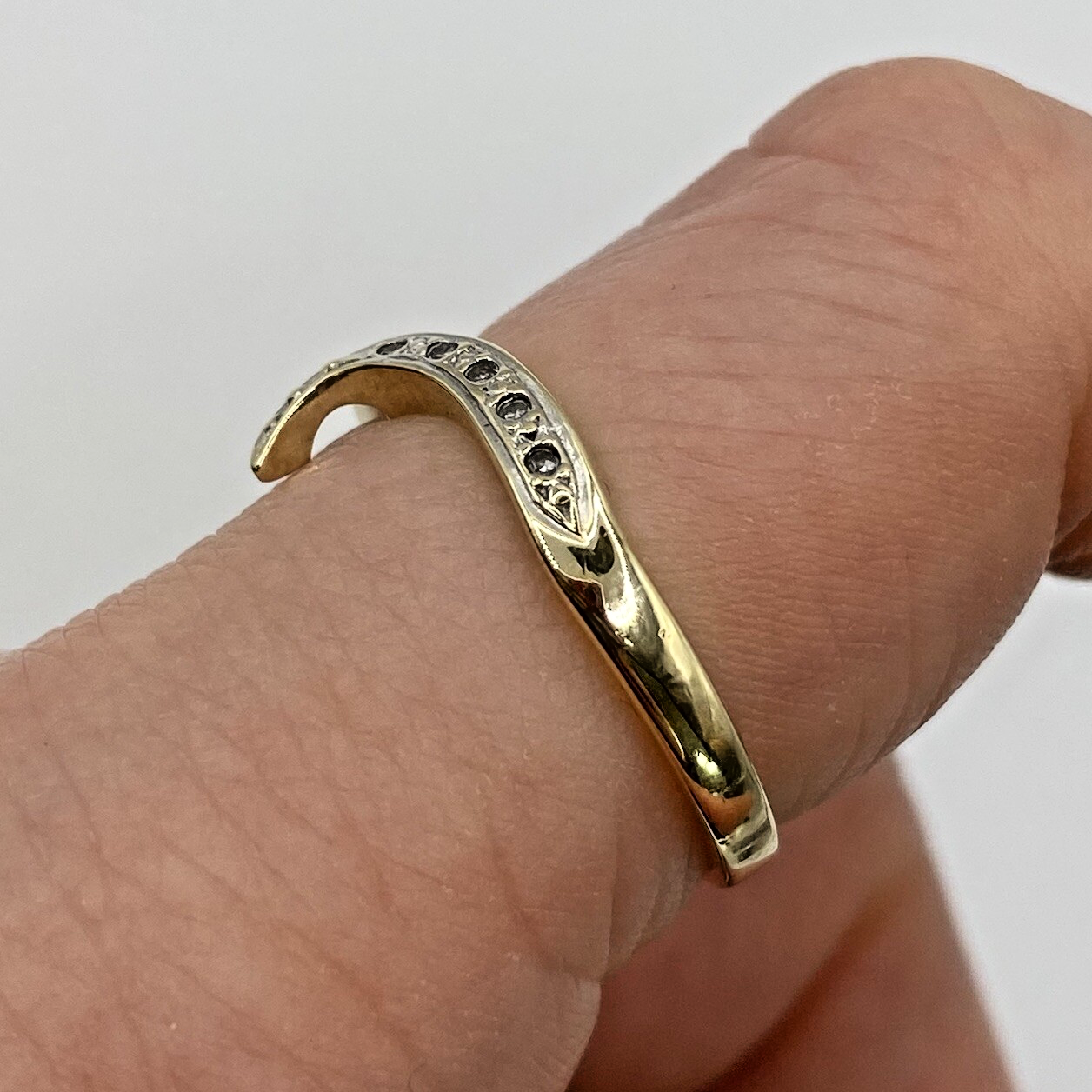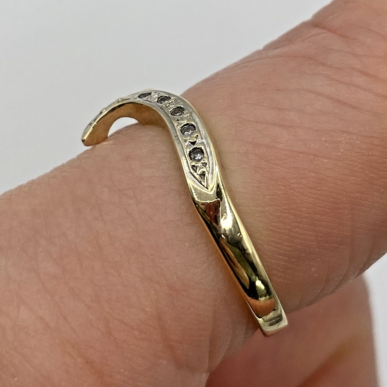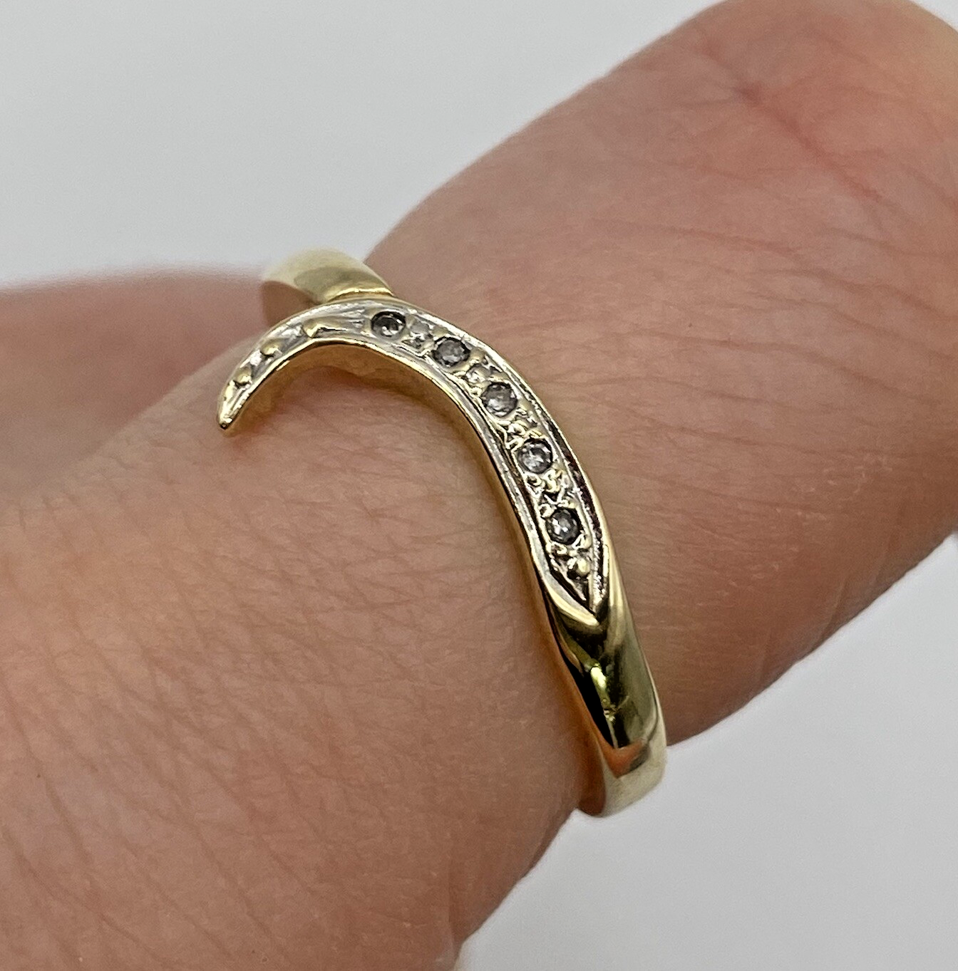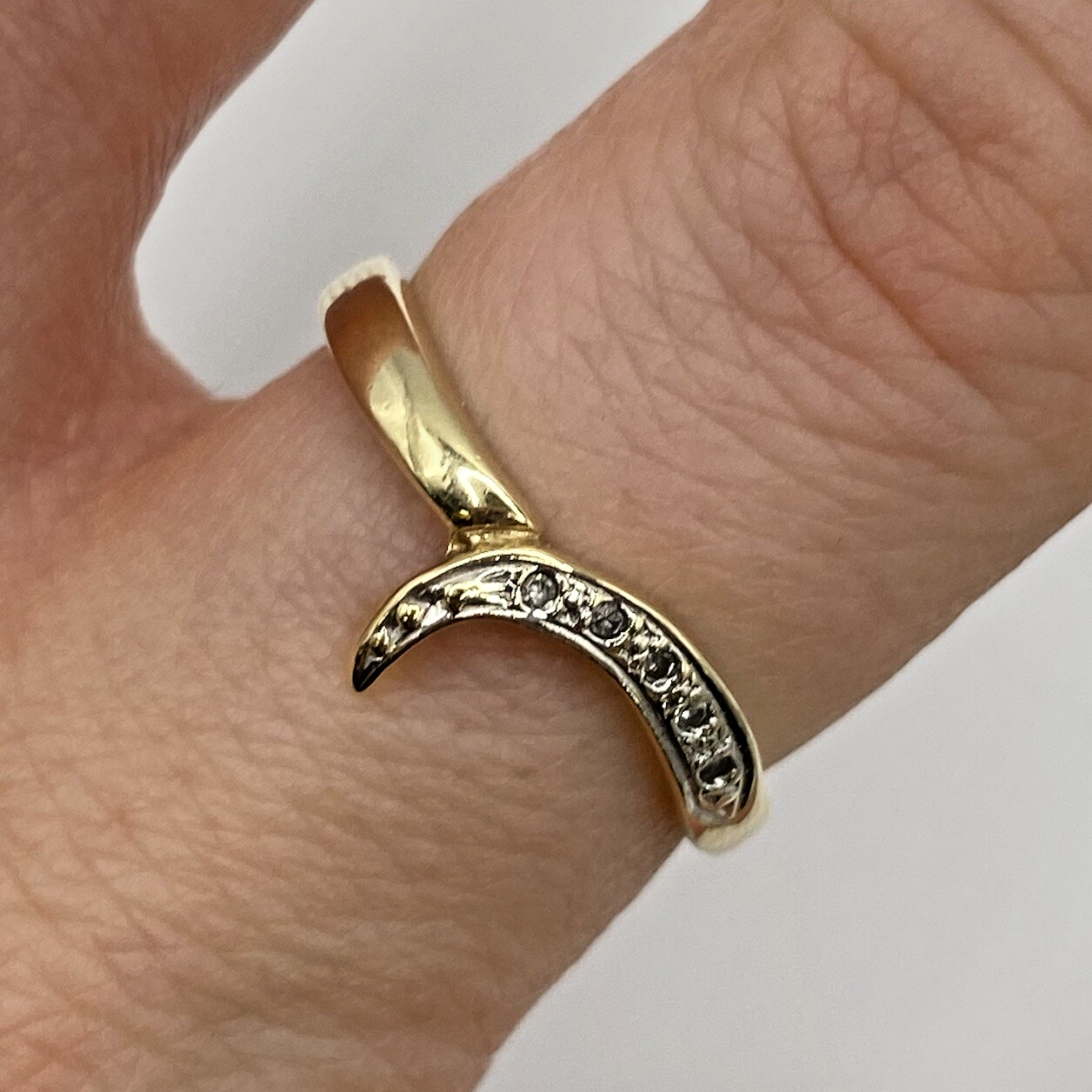 A charming gold fancy wishbone style ring featuring a quintet of petite pave set diamonds at .02ct.