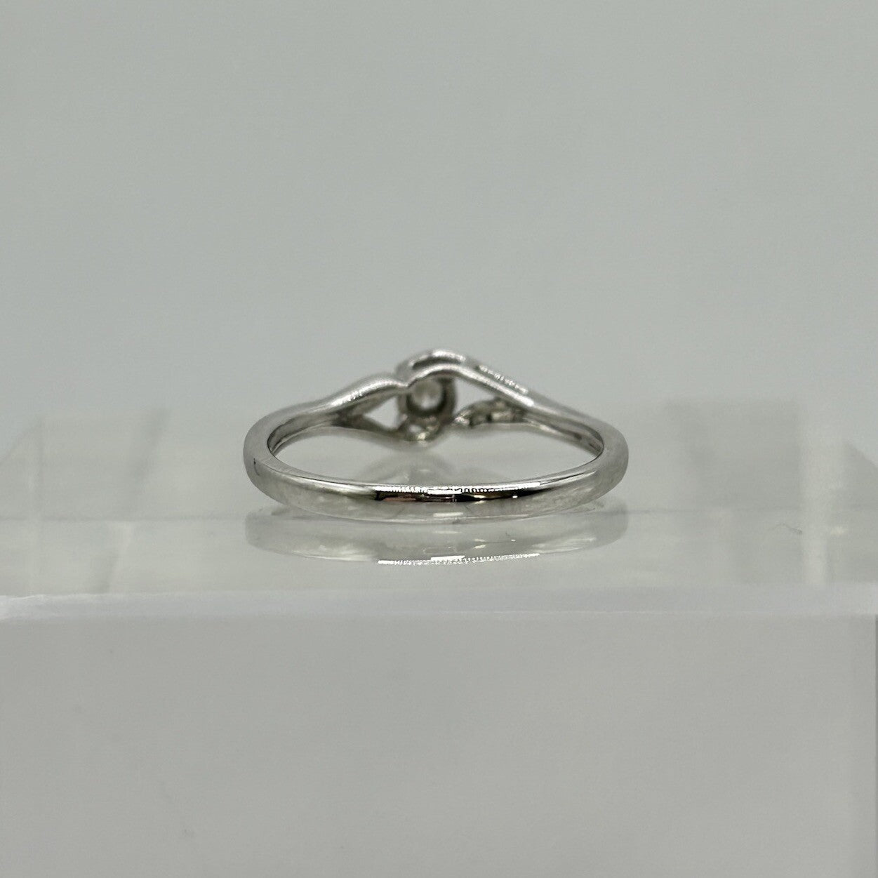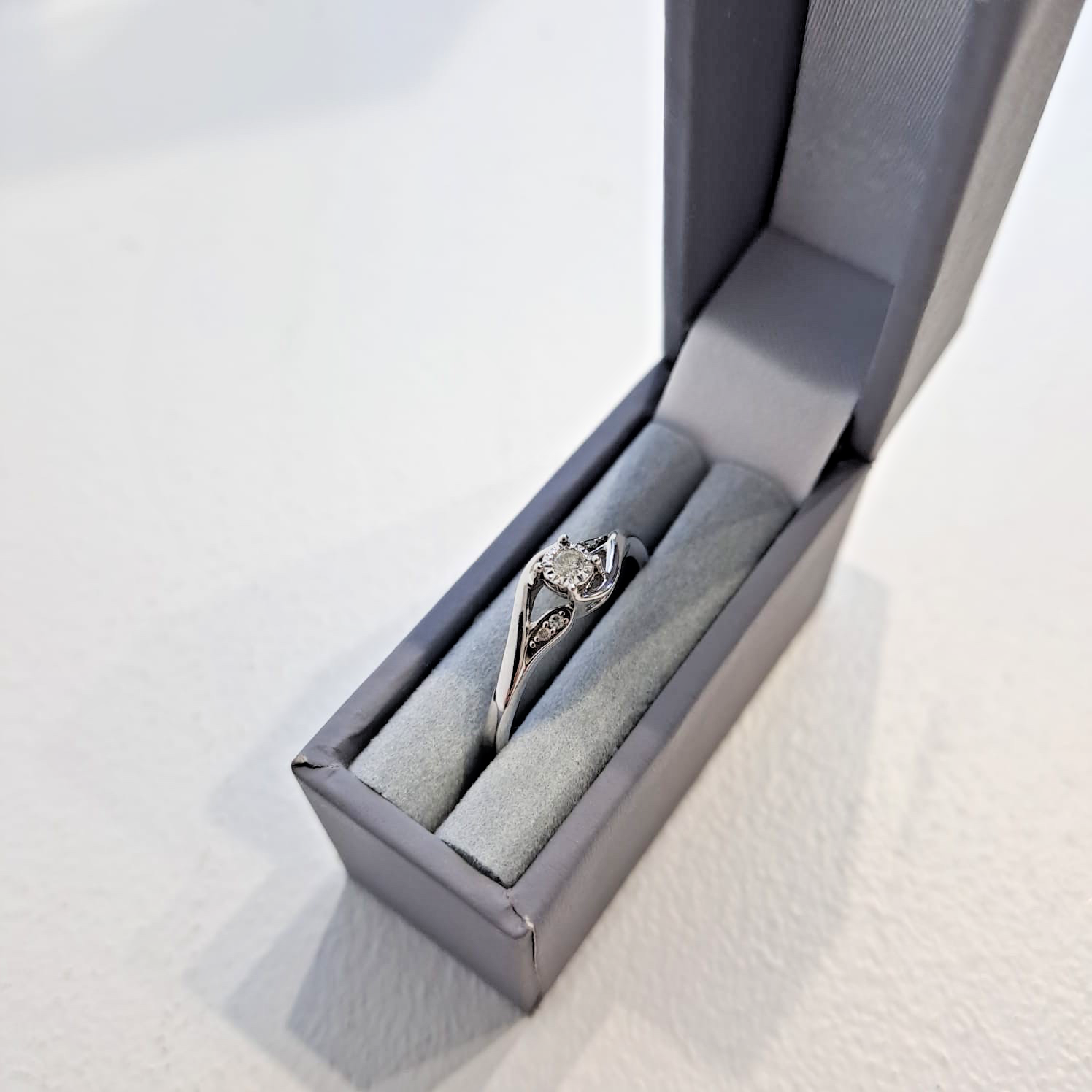 A beautiful white gold bypass twist style ring showcasing a solitaire diamond to centre, accented by additional petite diamonds.