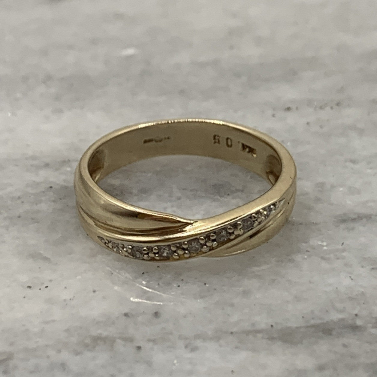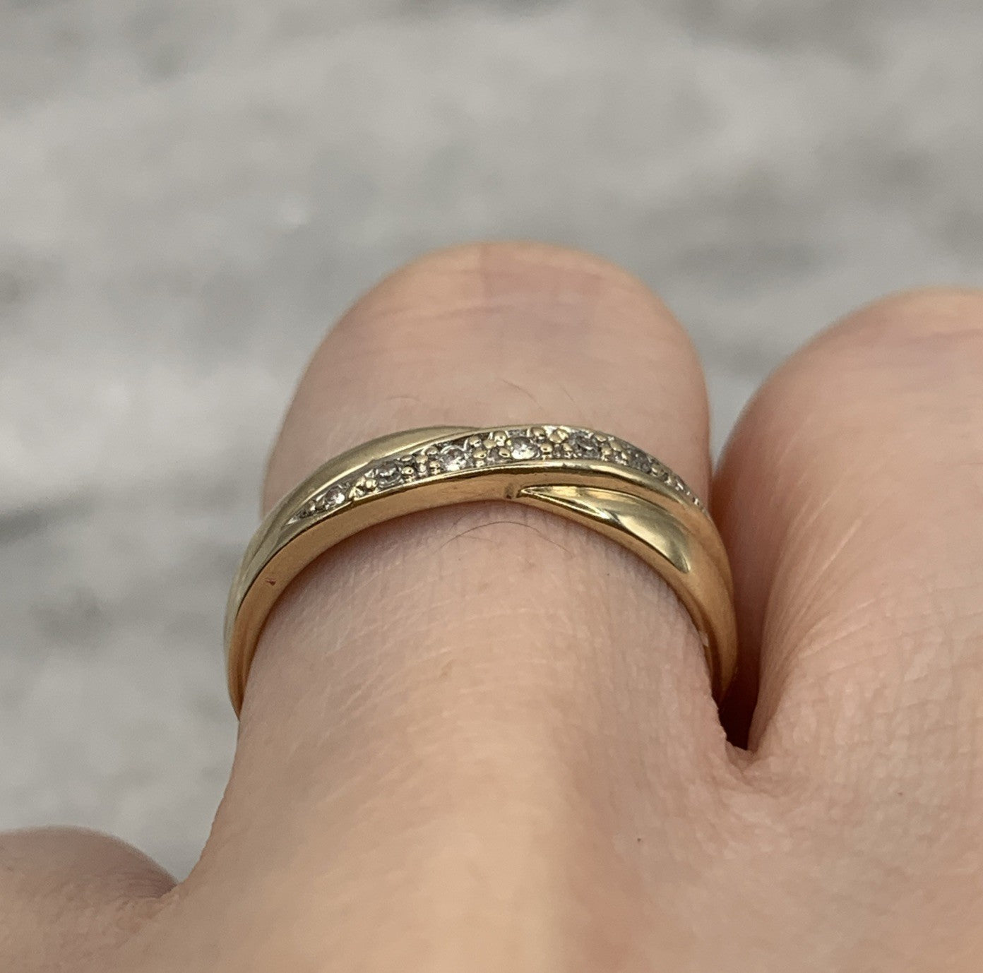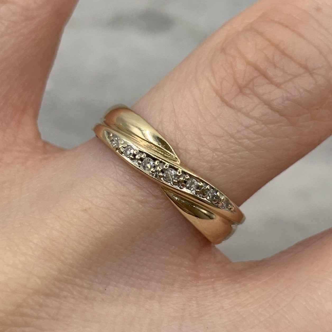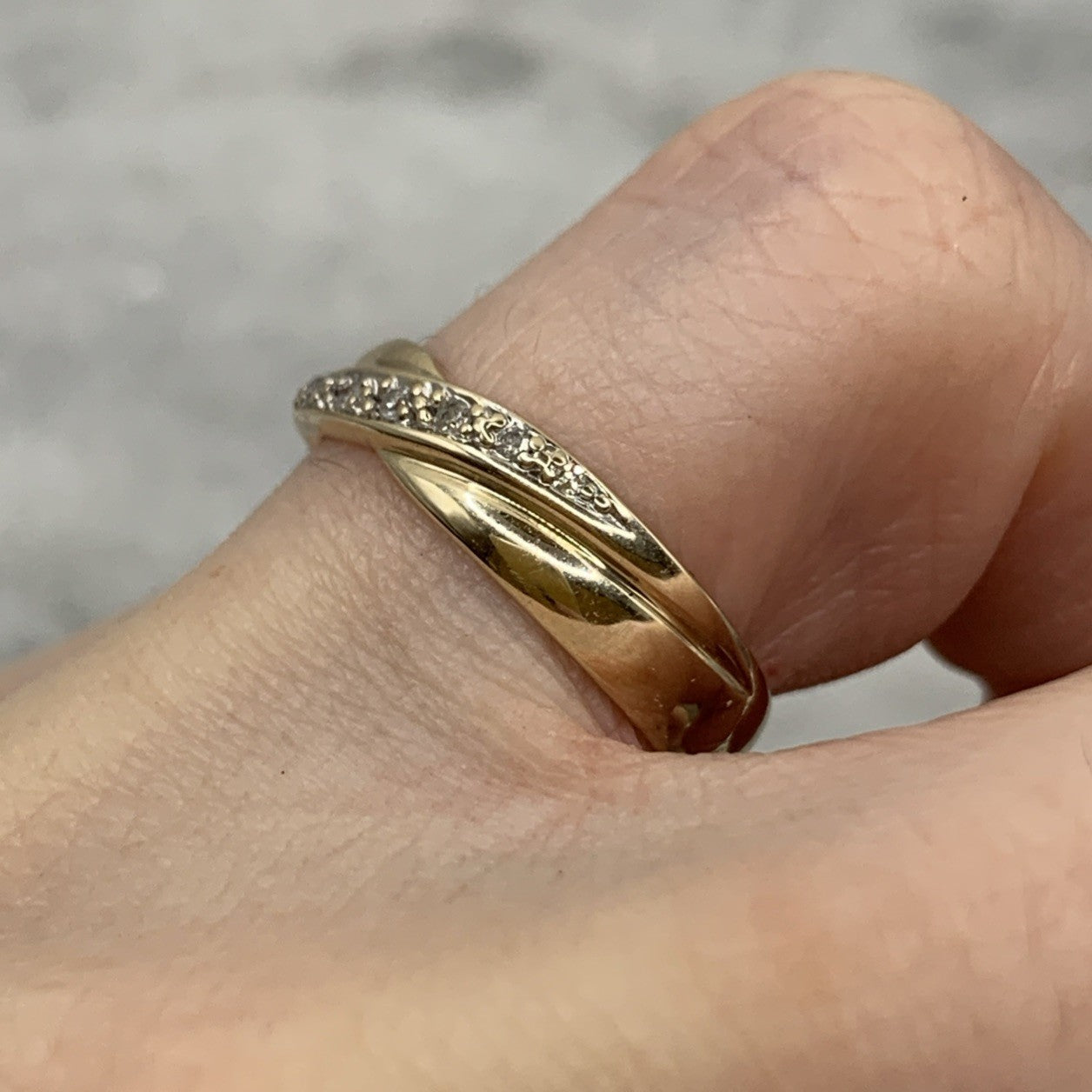 A stunning gold crossover style band ring featuring a row of petite diamonds.