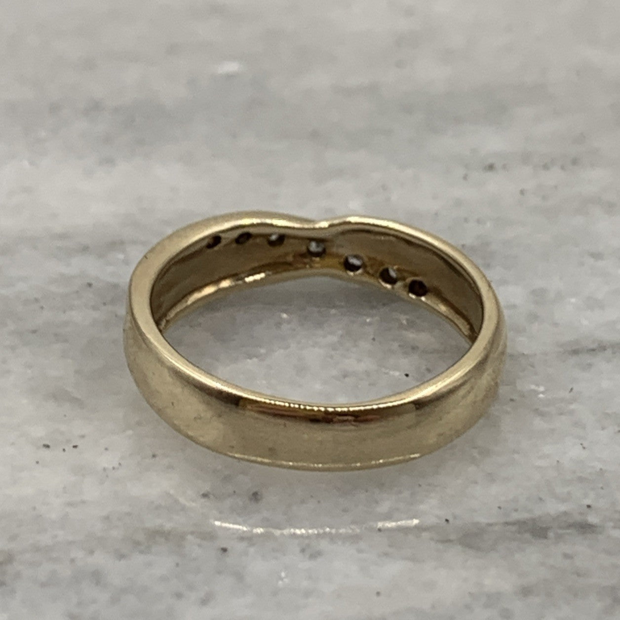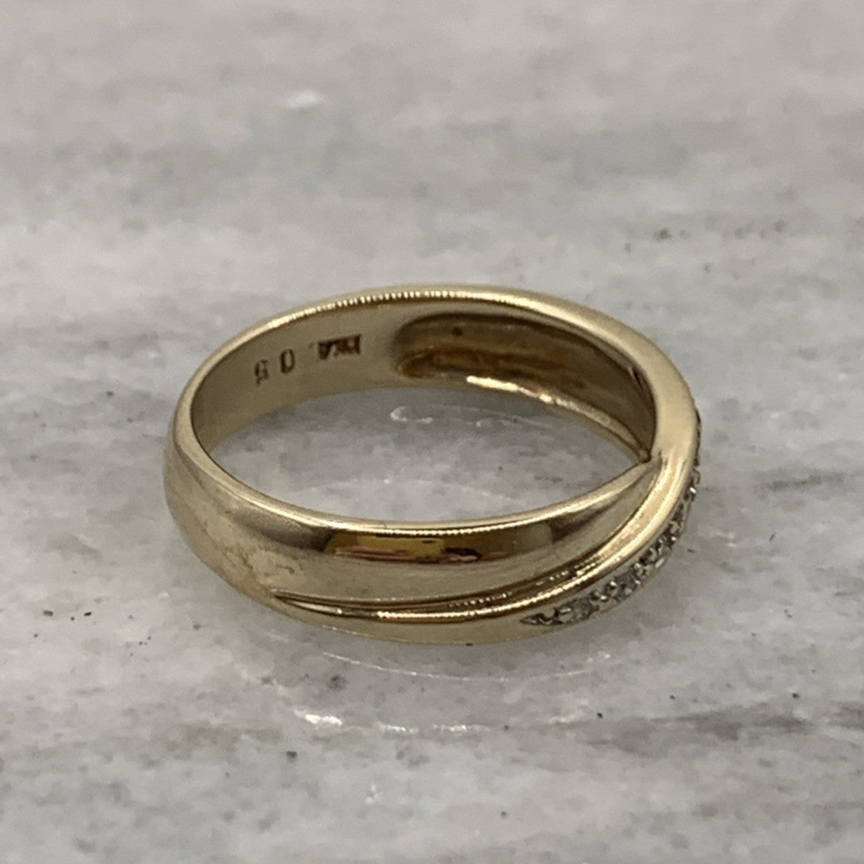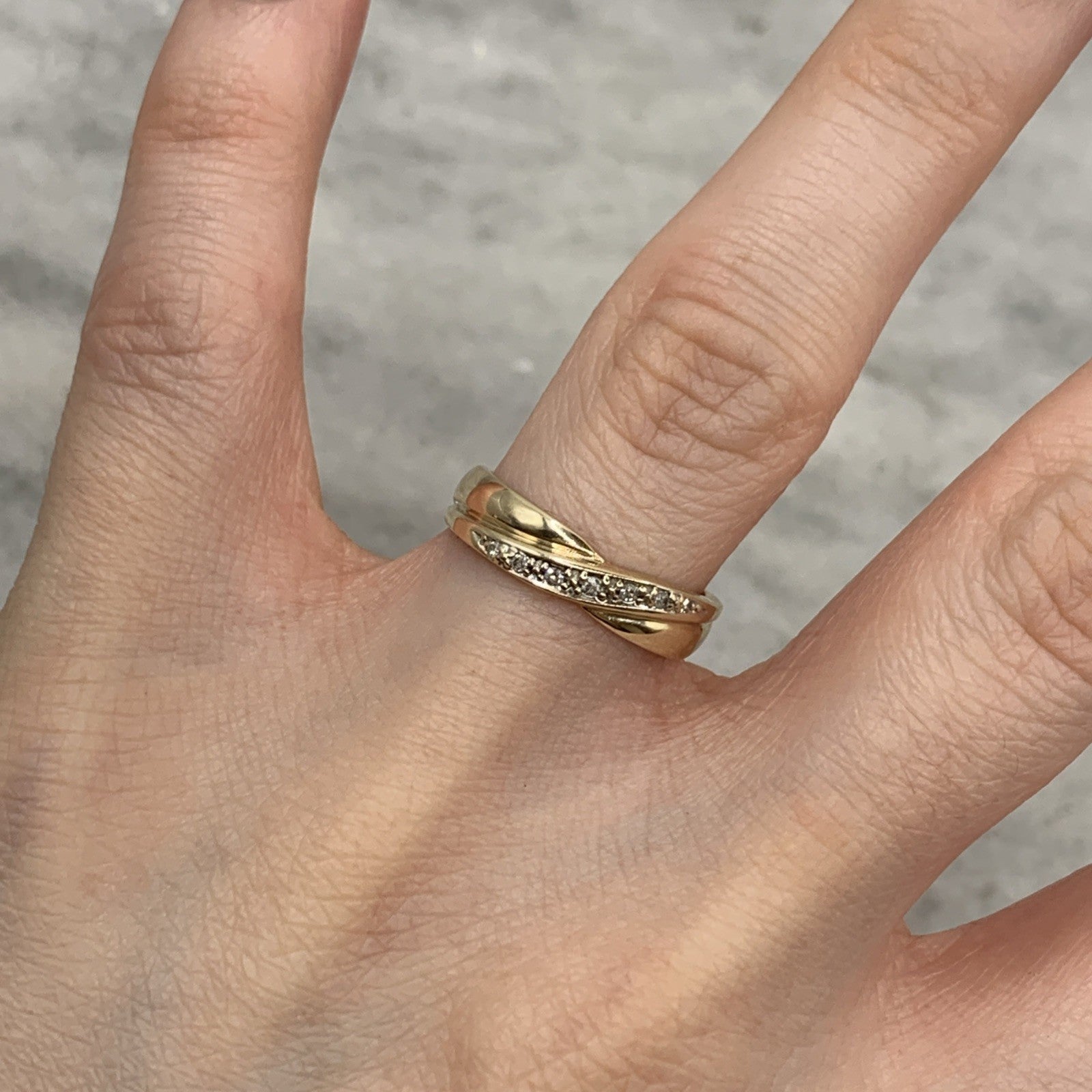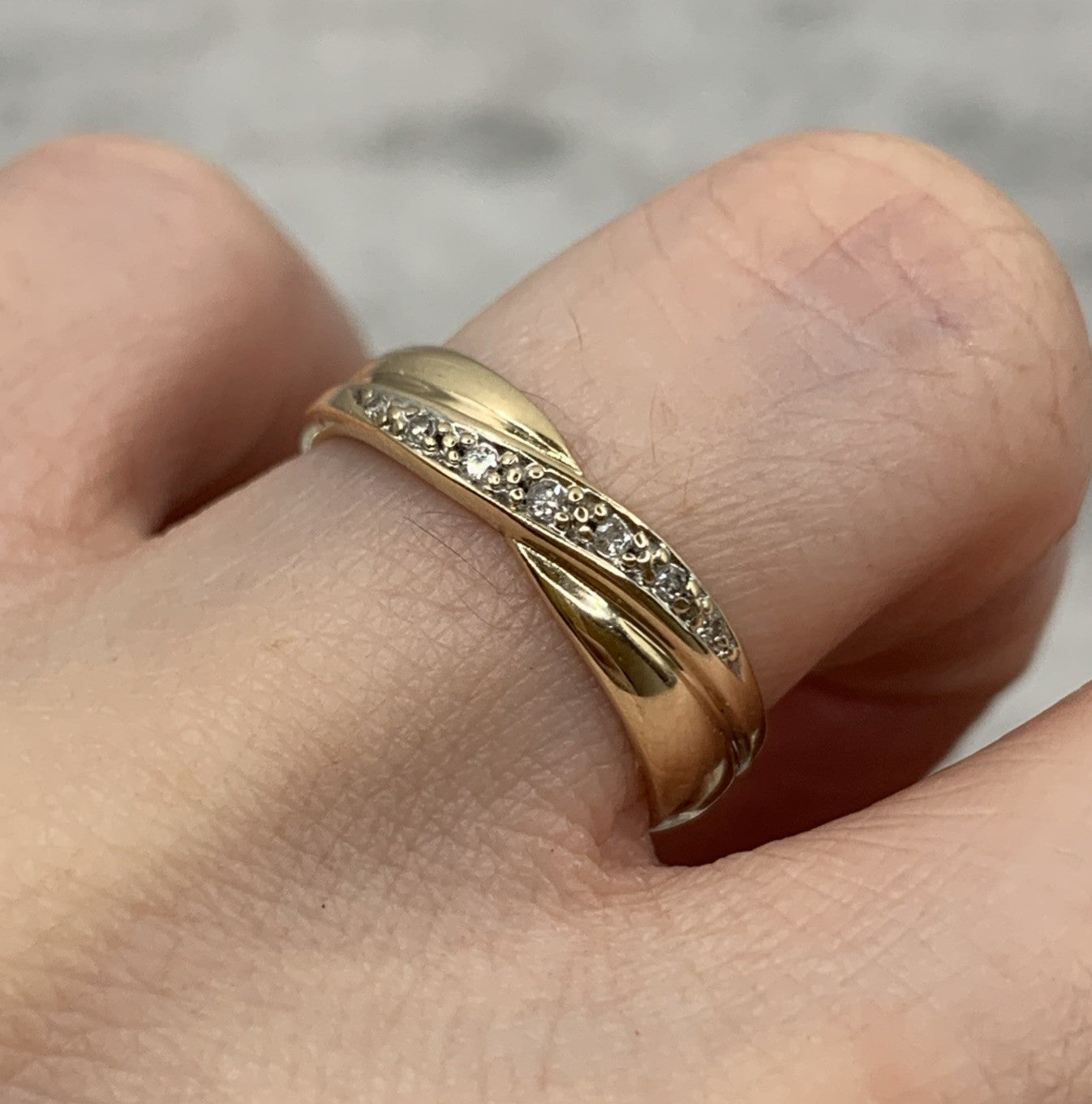 A stunning gold crossover style band ring featuring a row of petite diamonds.