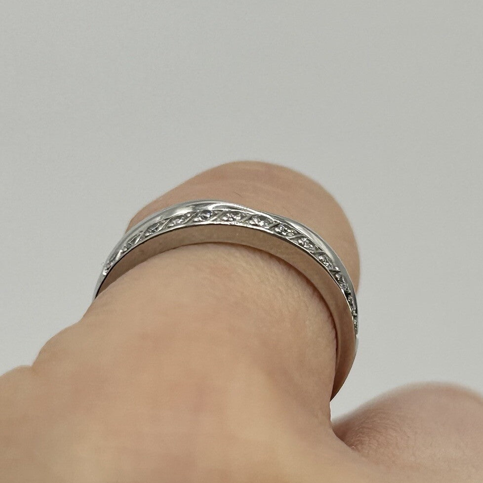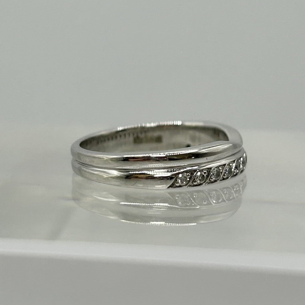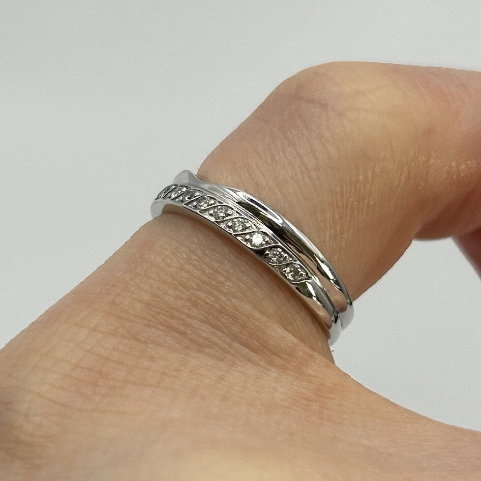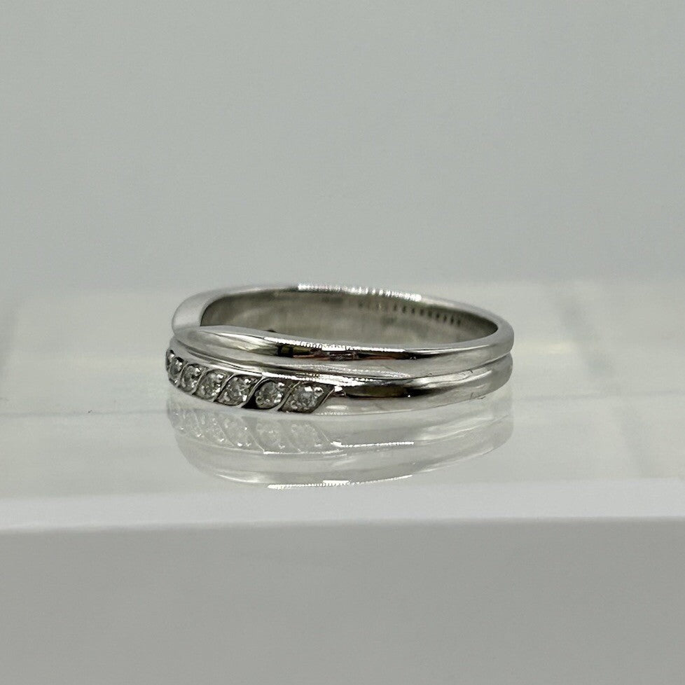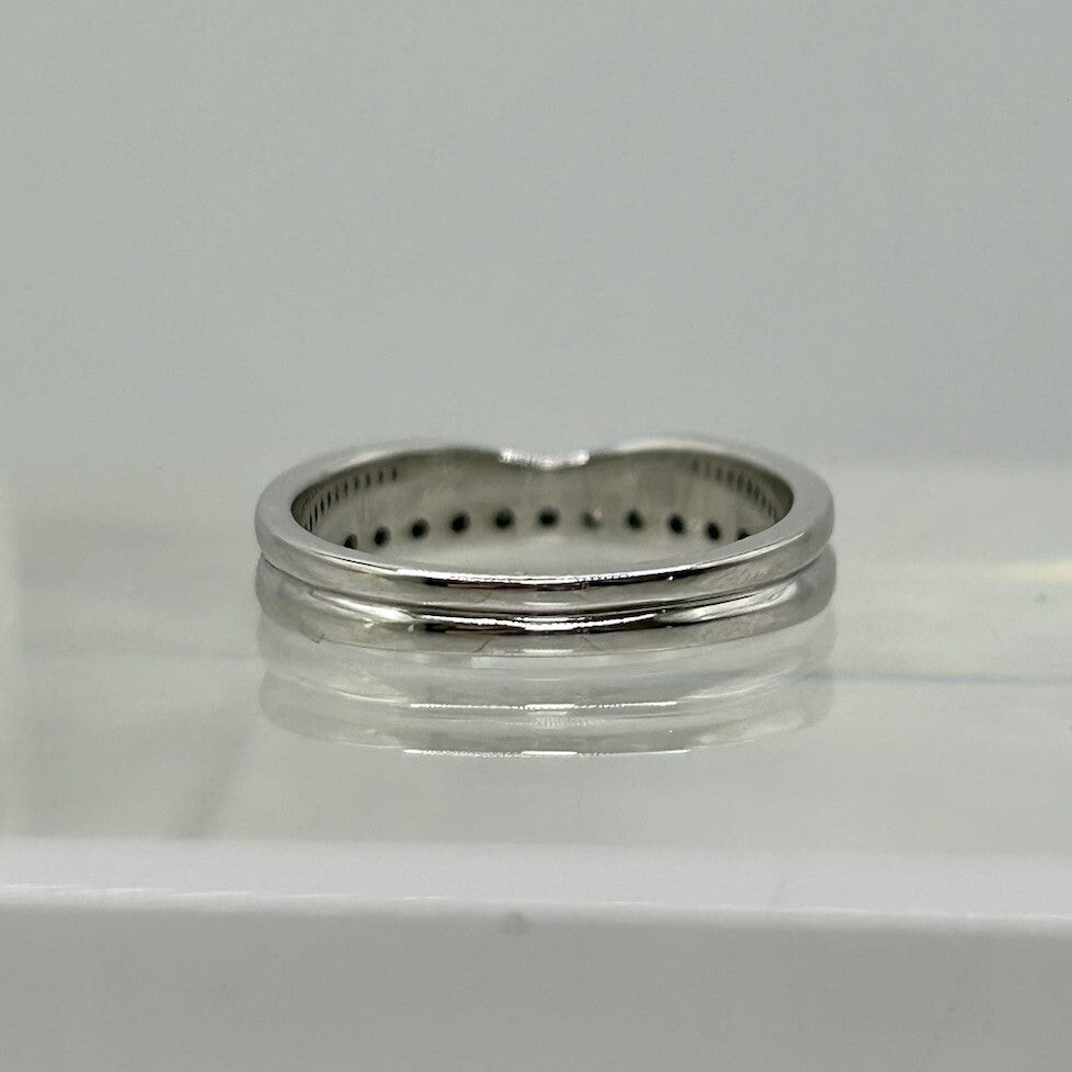 A charming white gold band ring crafted in a curved wishbone style, complete with a row of petite diamonds in a pave setting.