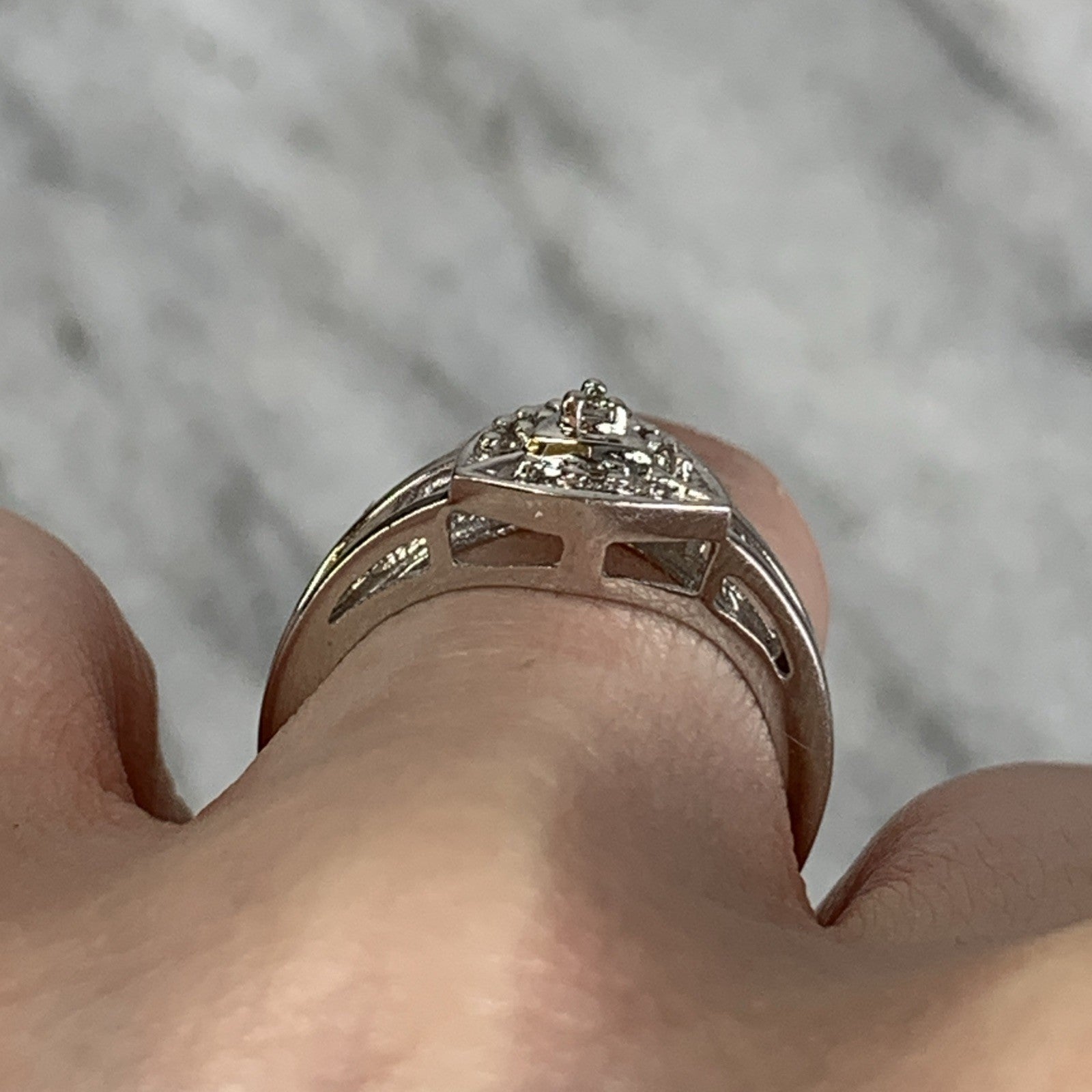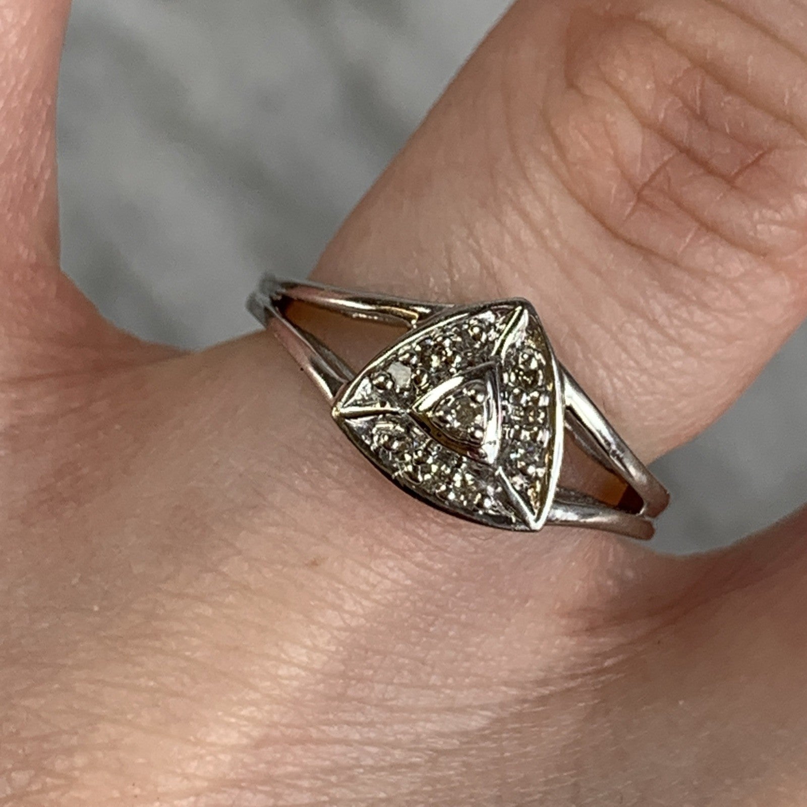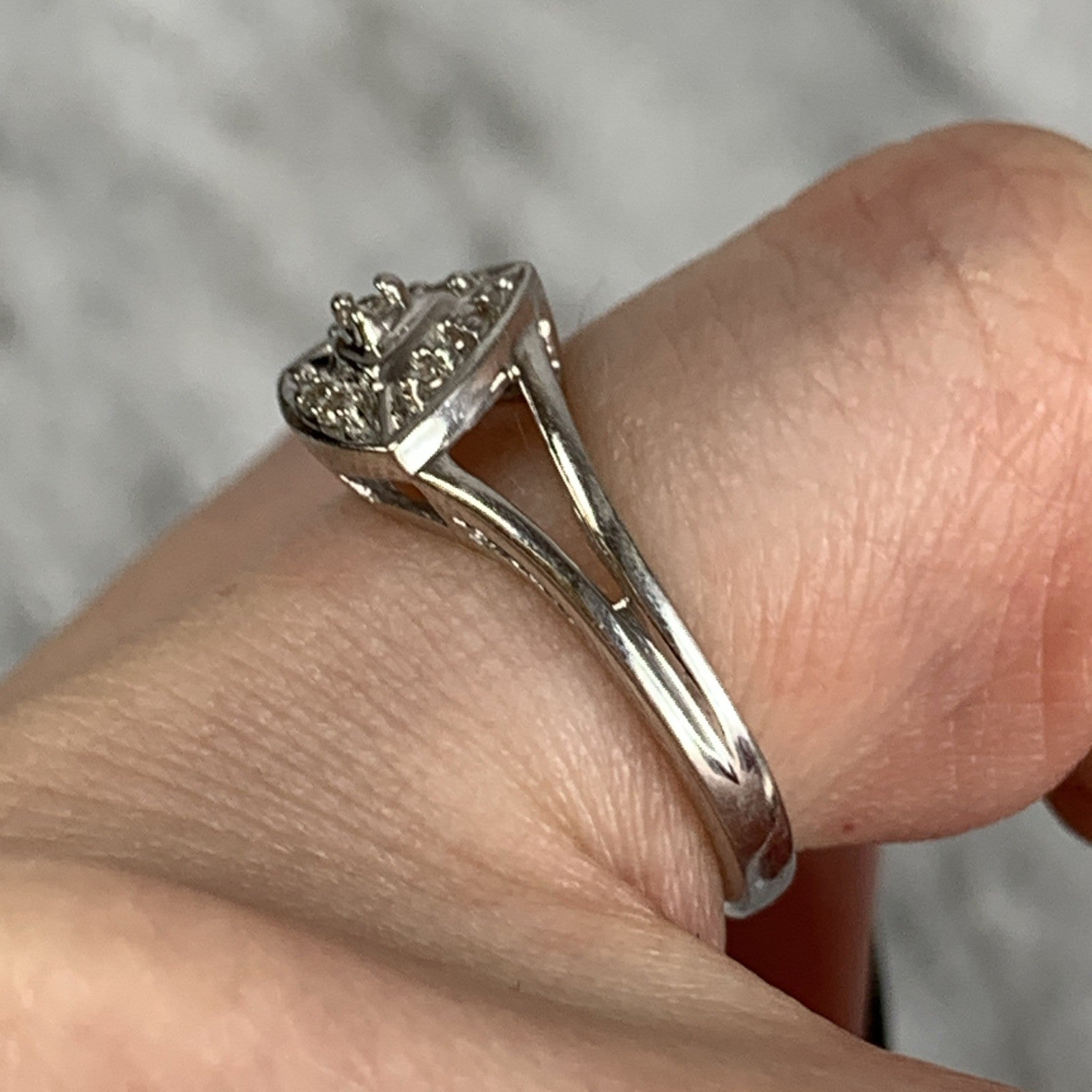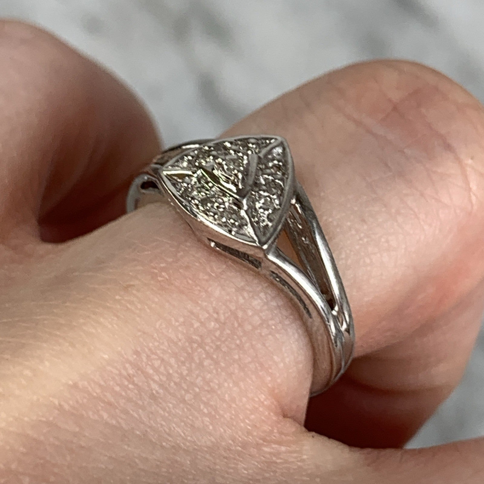 A beautiful white gold ring showcasing a trilliant shaped cluster of petite round cut diamonds.