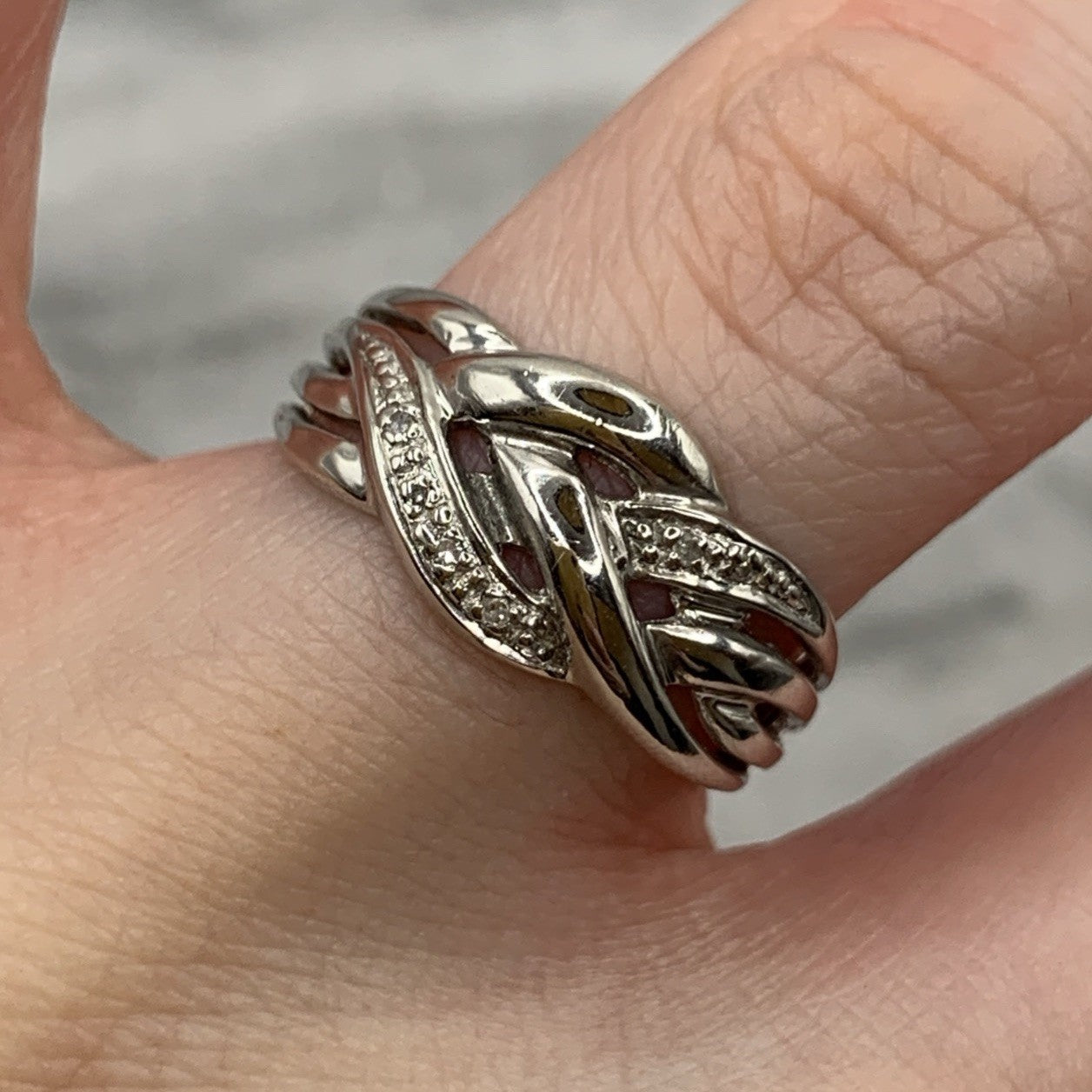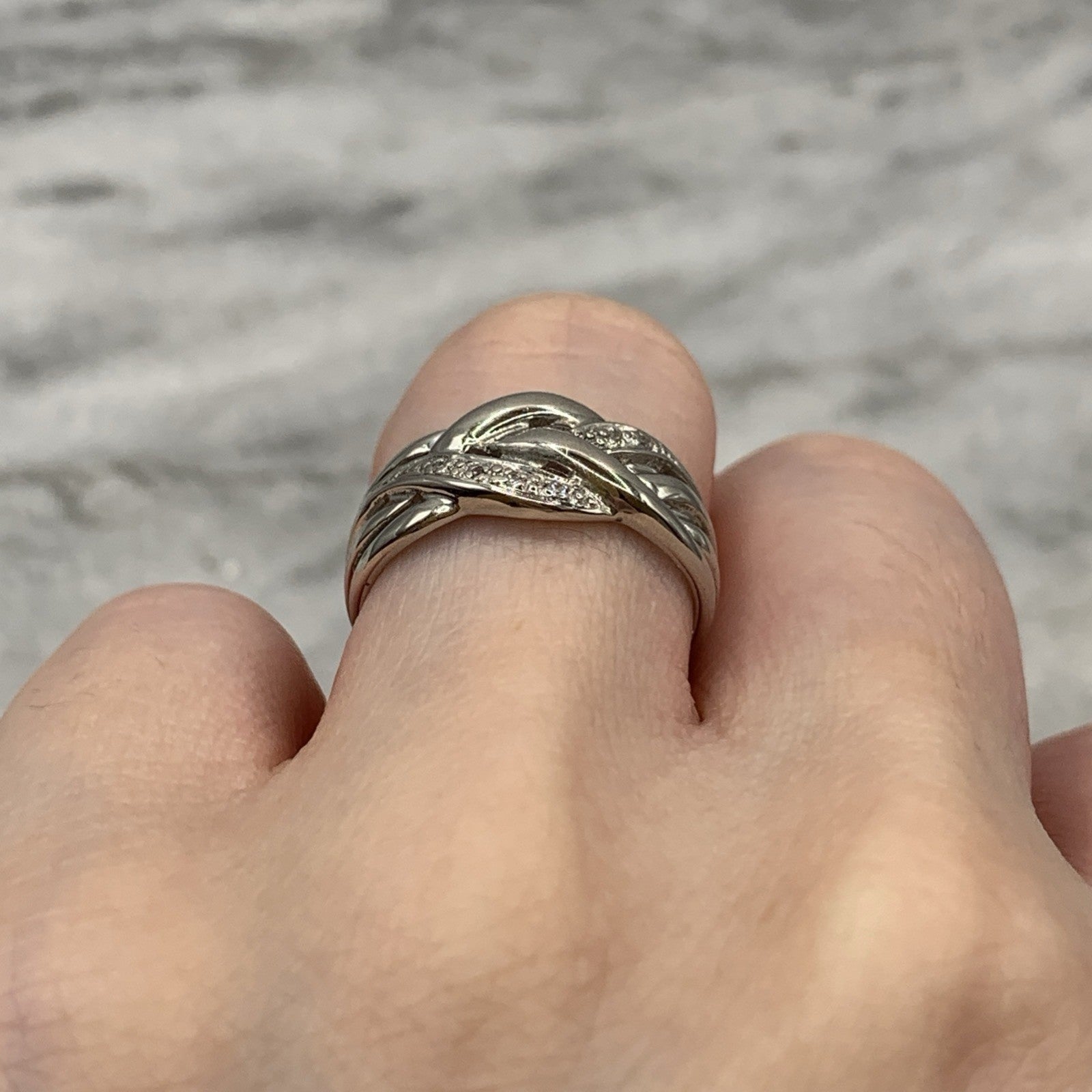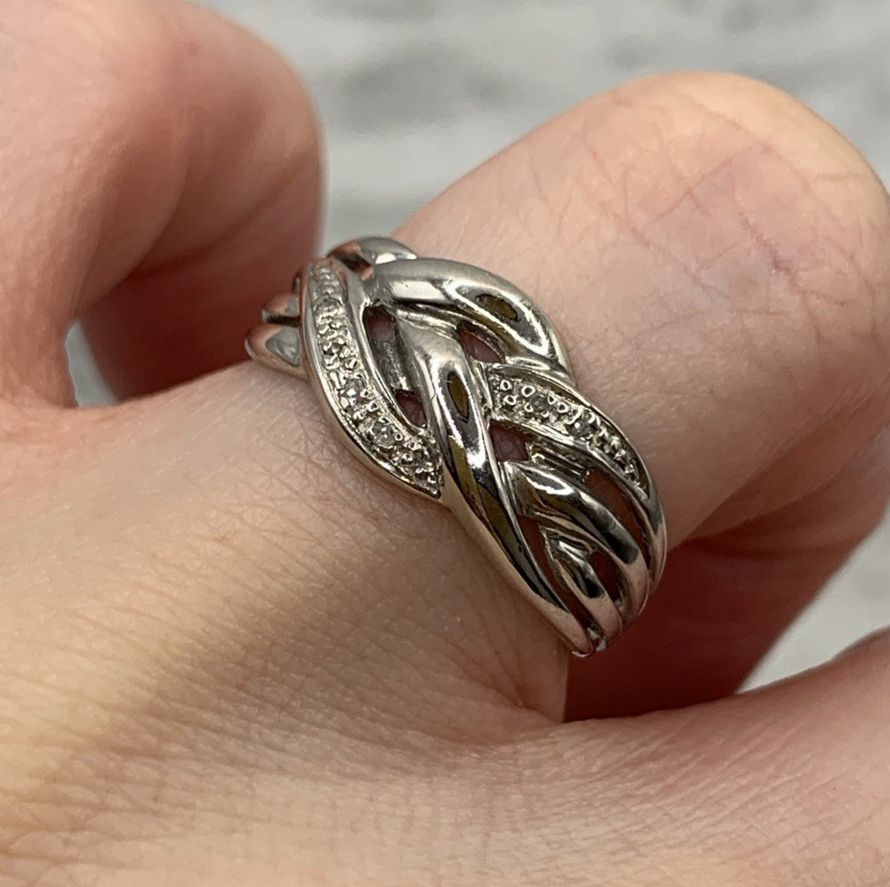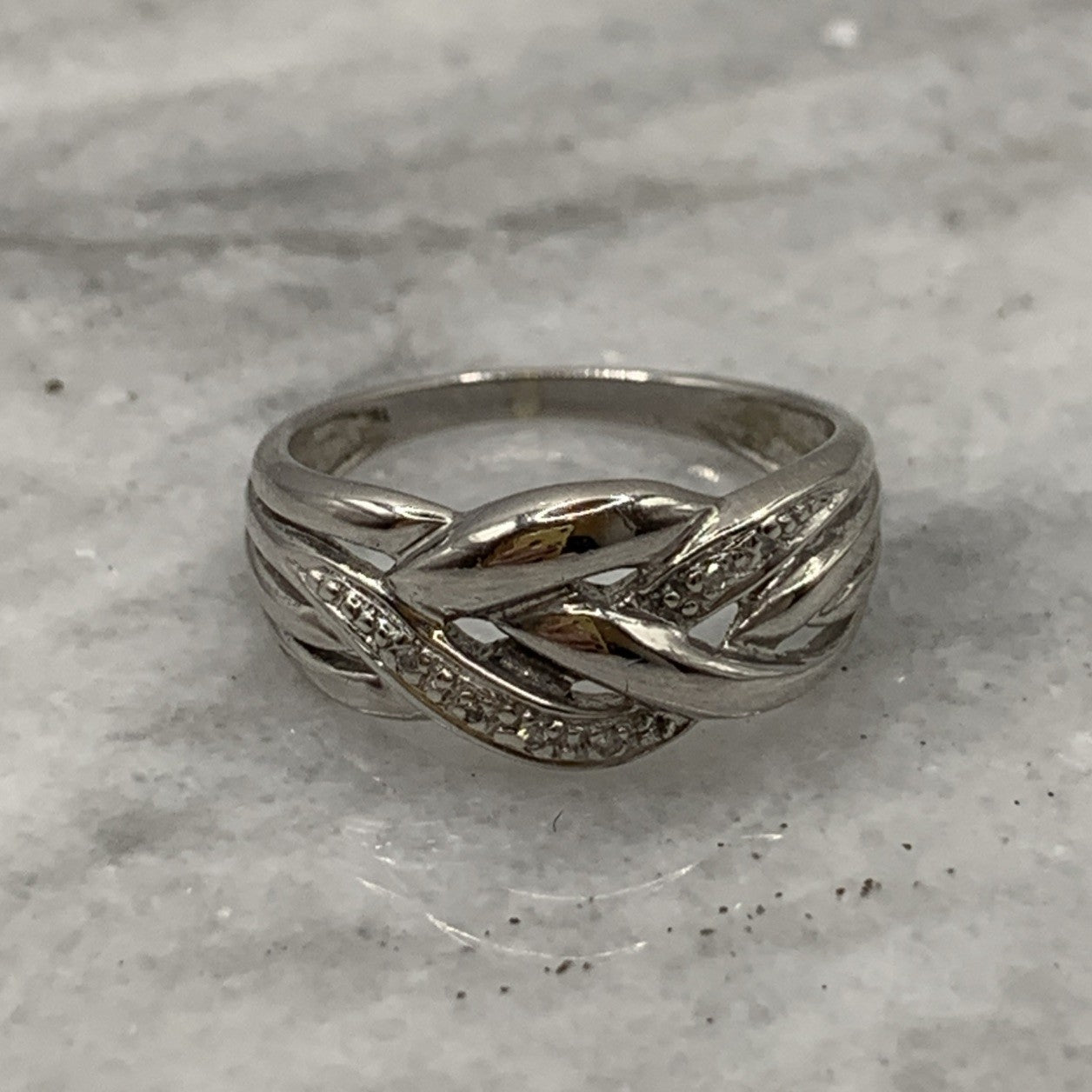 A beautifully crafted woven style white gold band ring complete with petite diamonds.
