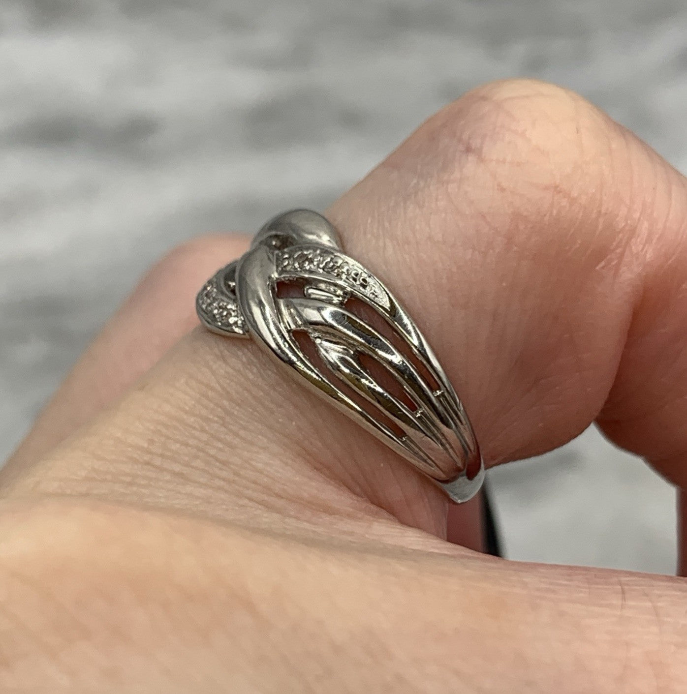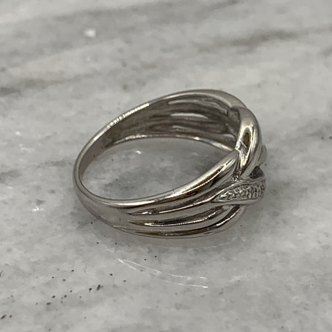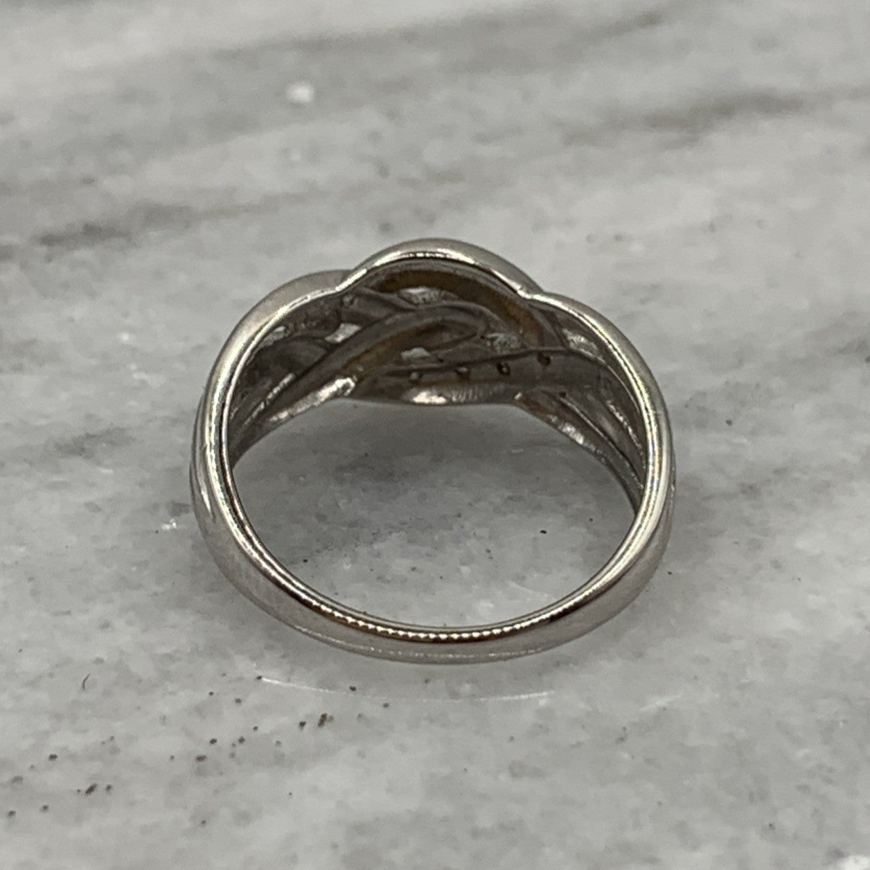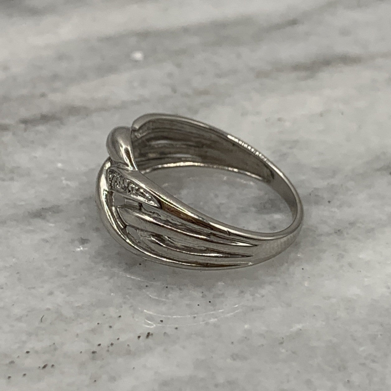 A beautifully crafted woven style white gold band ring complete with petite diamonds.