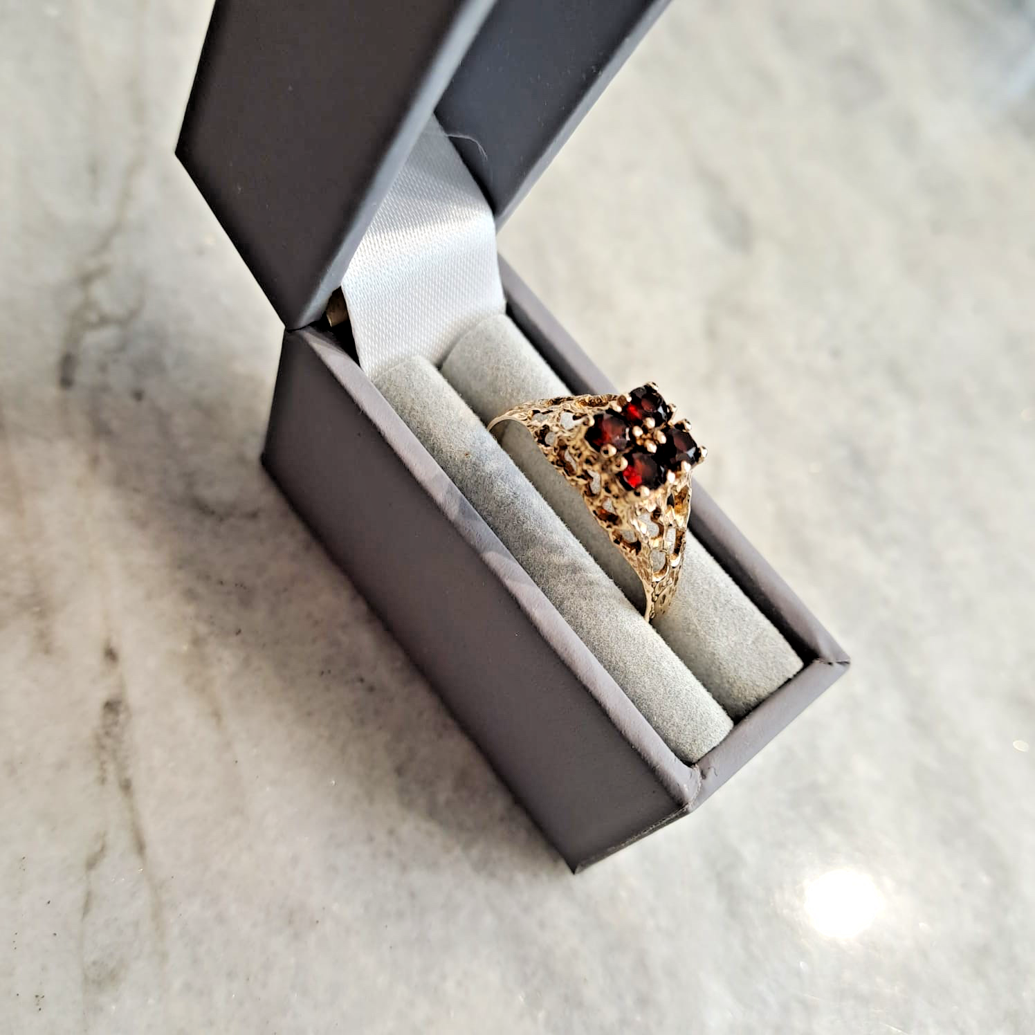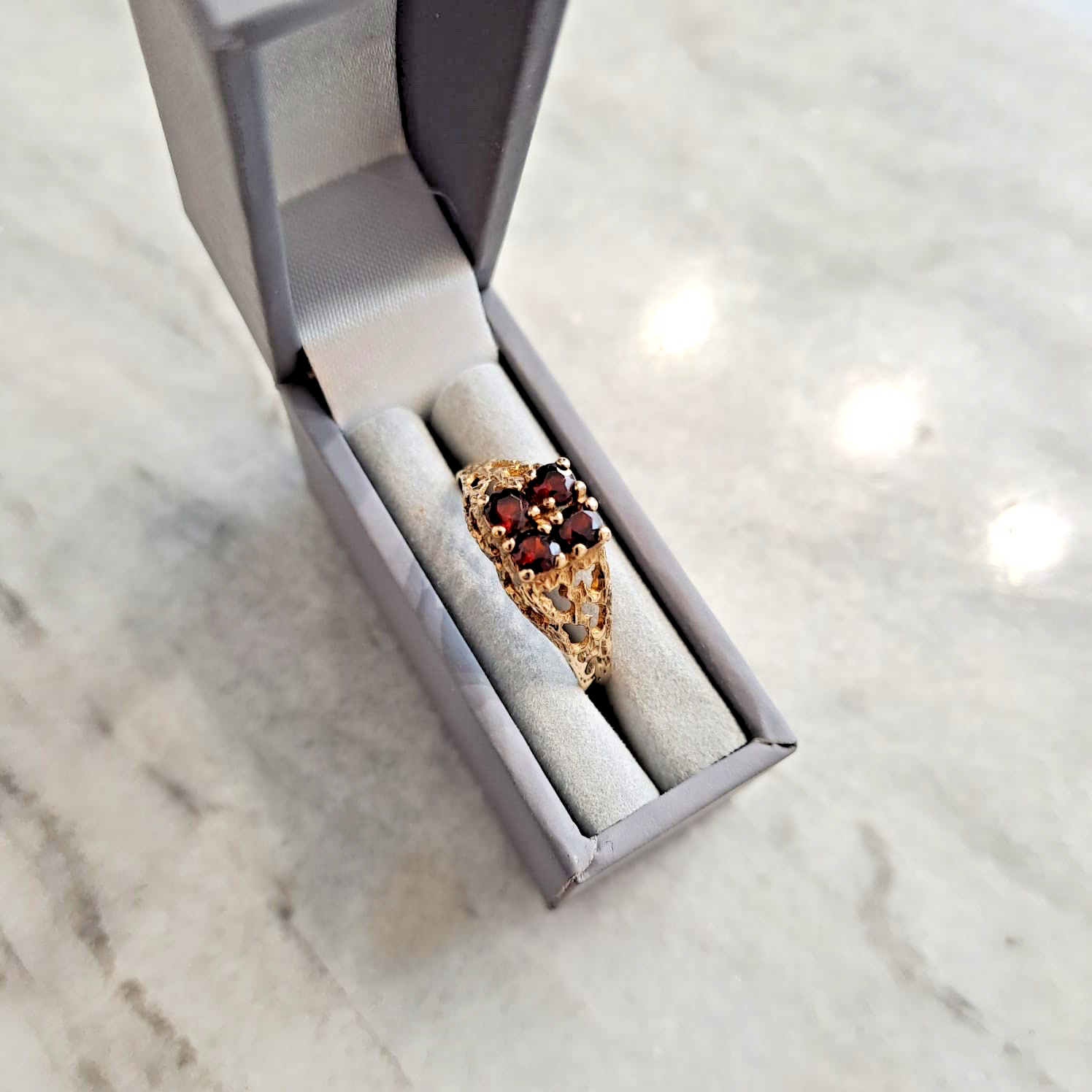 An eye catching ring with a raised textured setting that holds four round cut garnet gemstones.