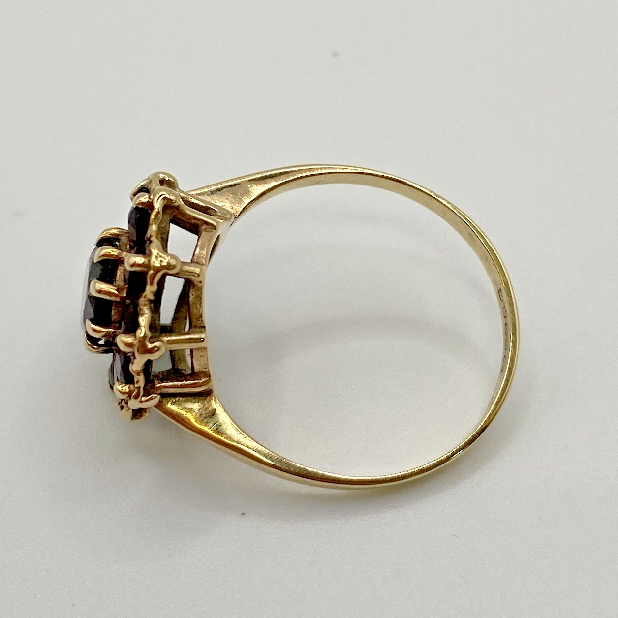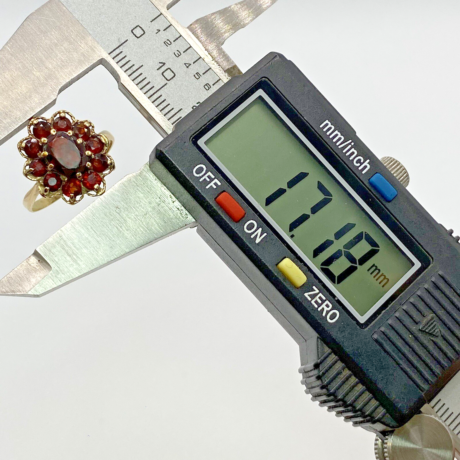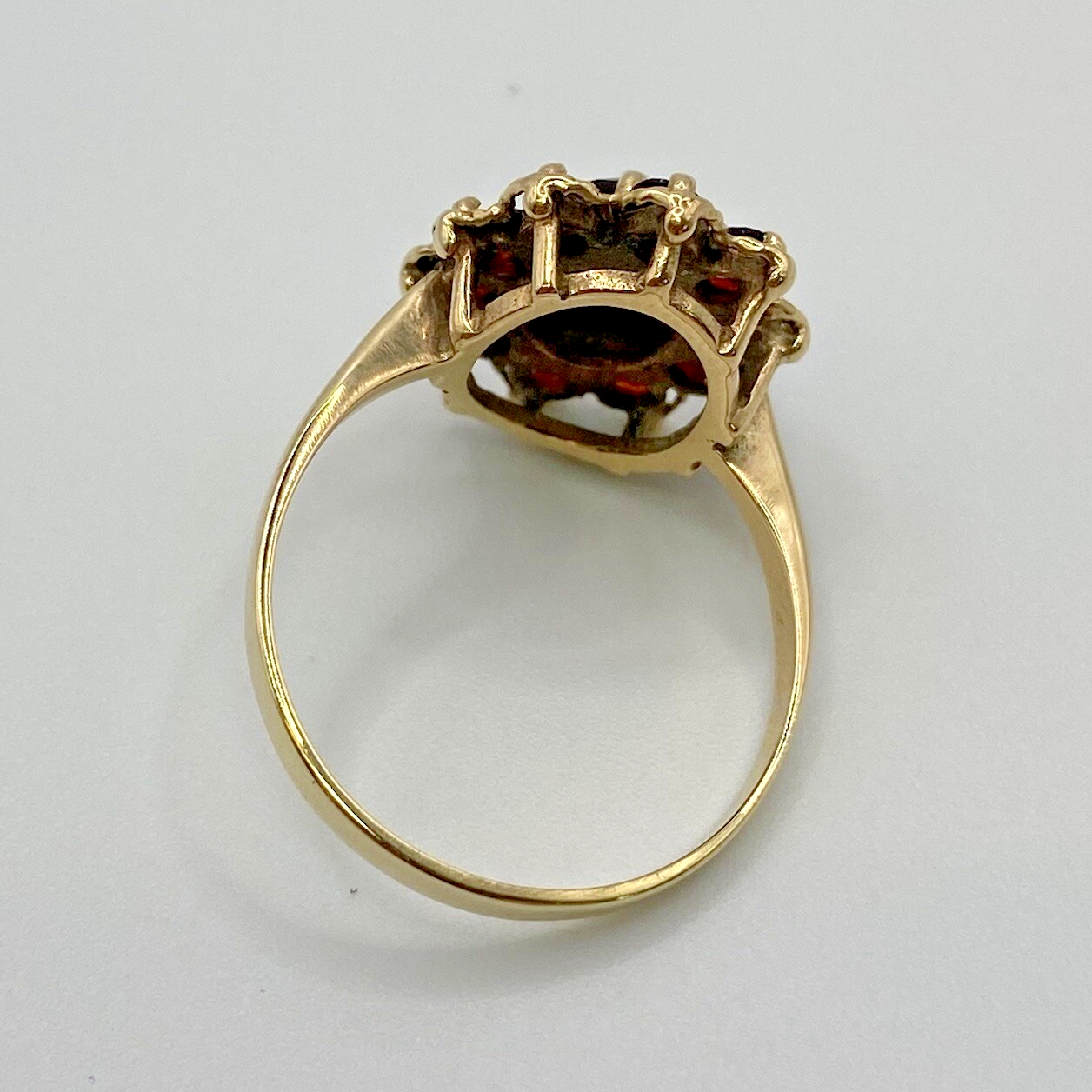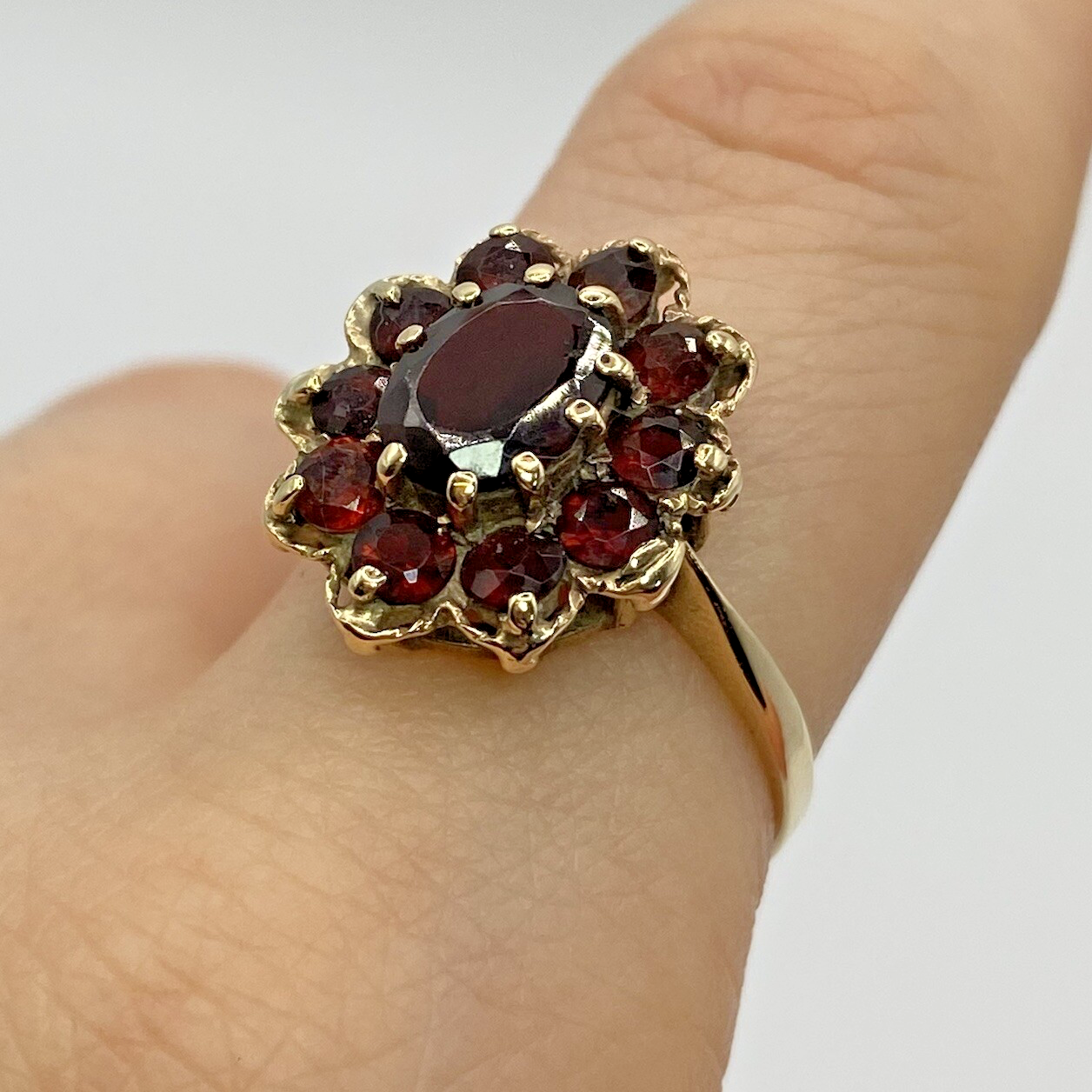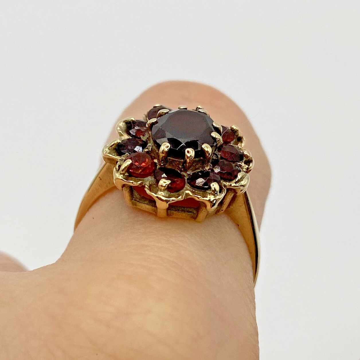 Garnet 9 ct Gold Ring 375 Yellow Gold Floral Ornate Cluster - Size R