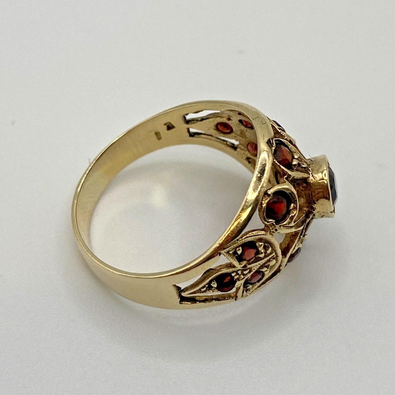 Garnet 9 ct Gold Ring Filigree Cluster Band 375 Yellow Gold - Size N