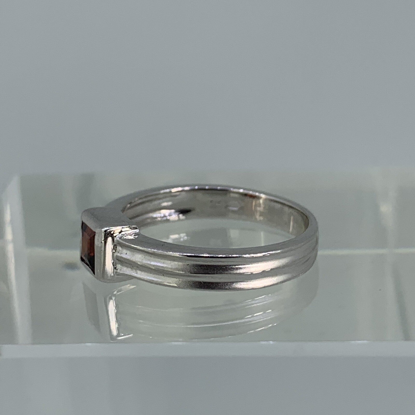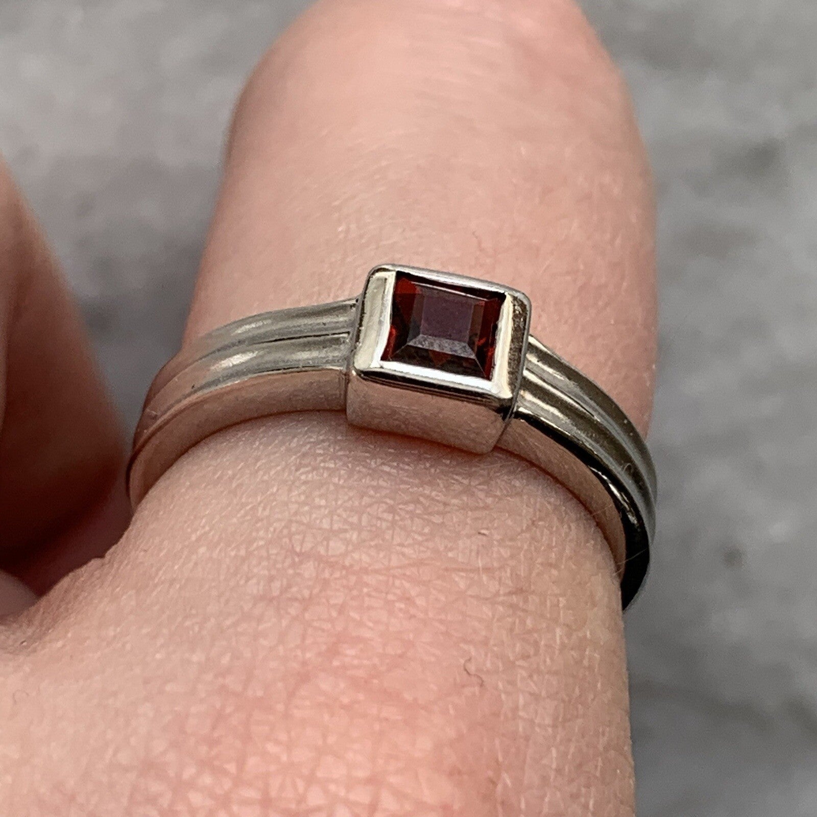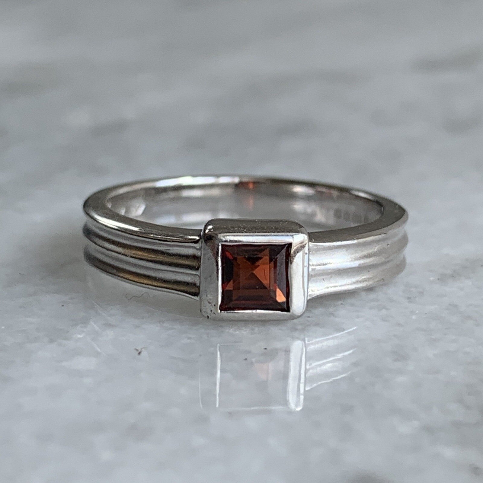 A beautiful solitaire ring featuring a square cut garnet gemstone.