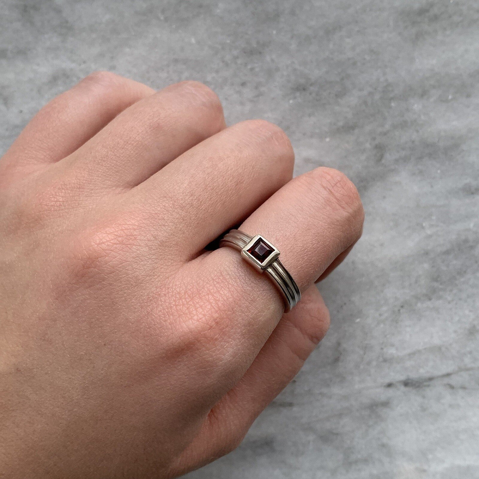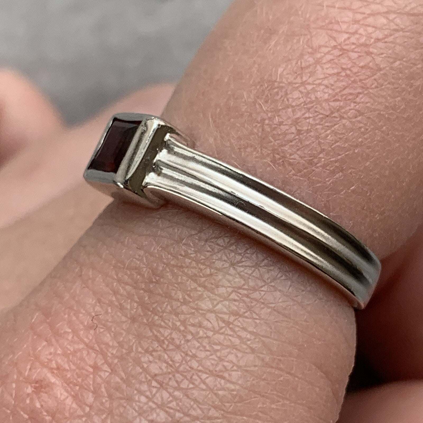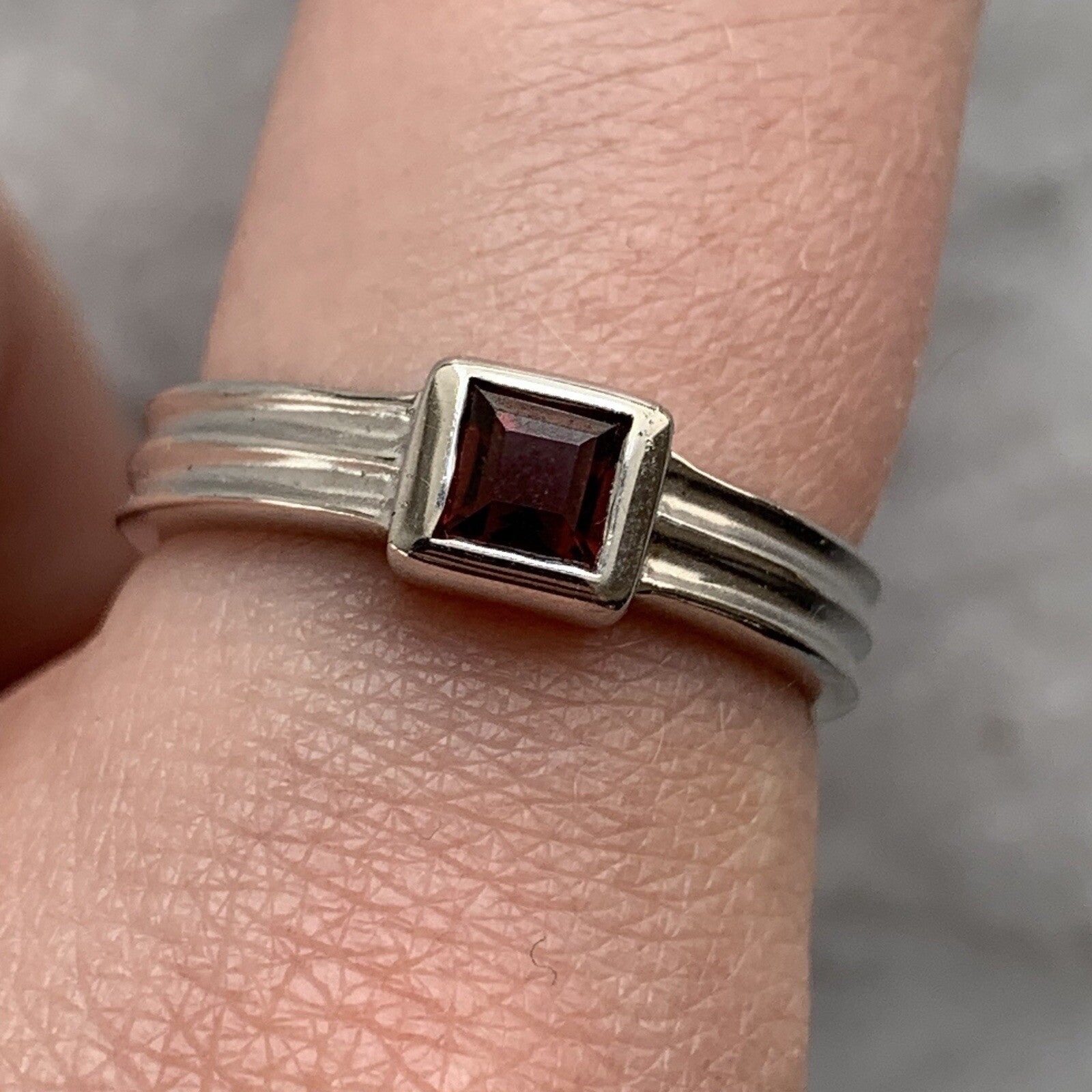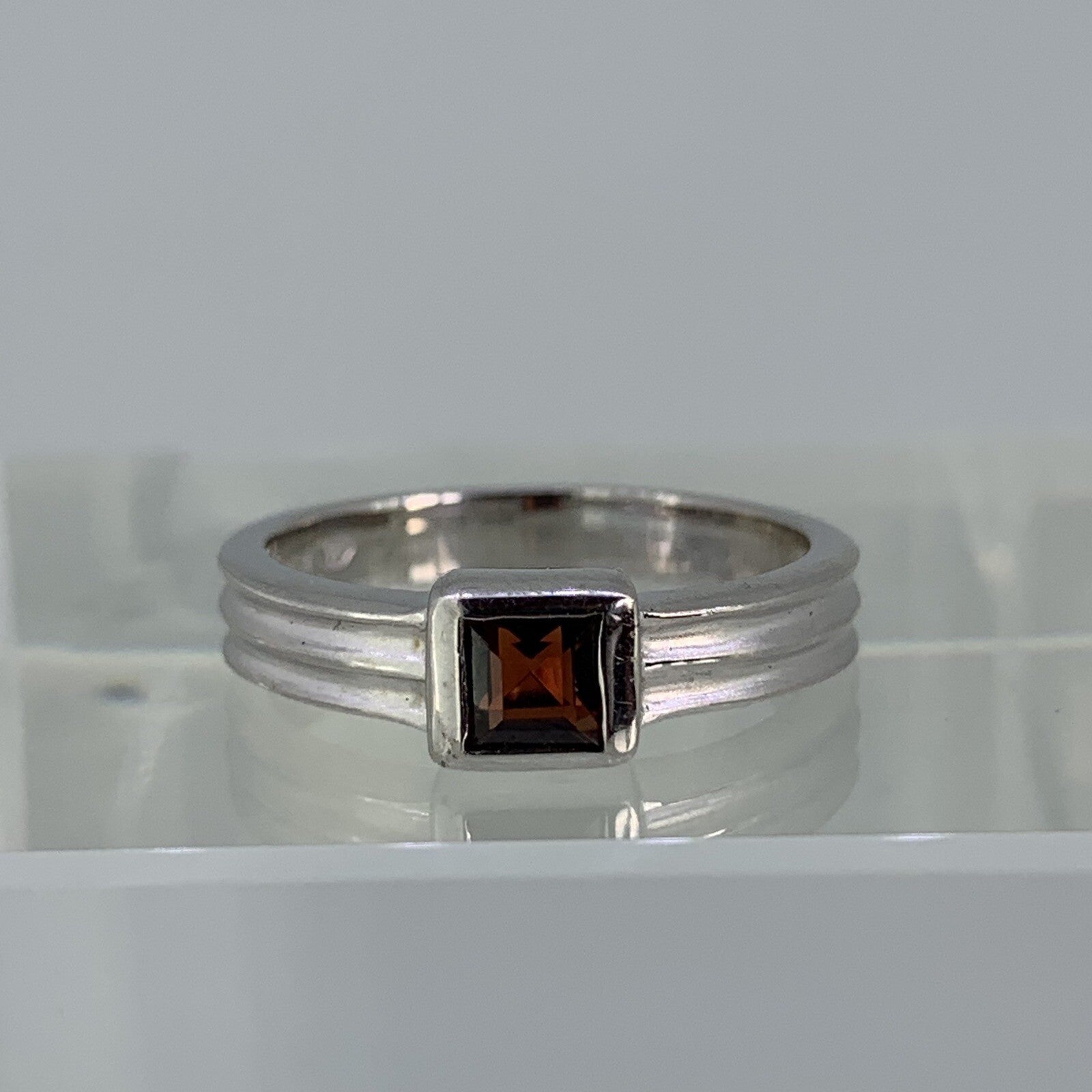 A beautiful solitaire ring featuring a square cut garnet gemstone.