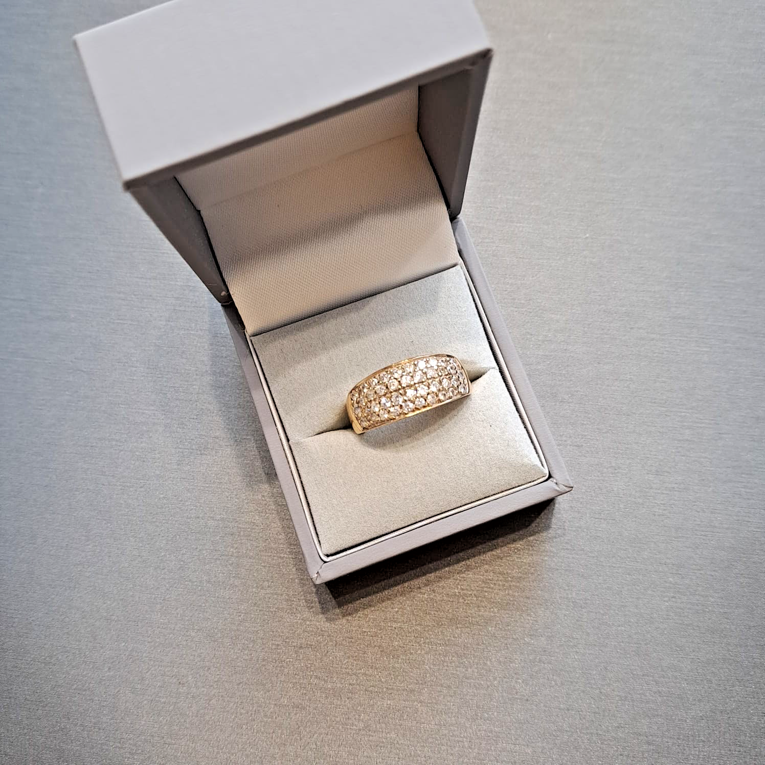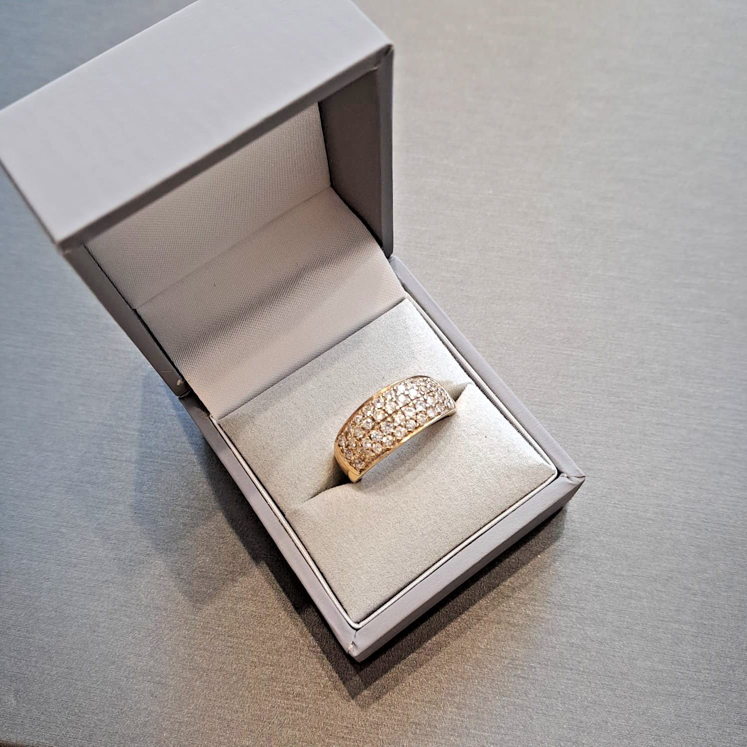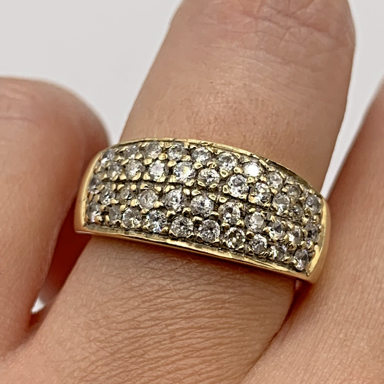 A gorgeous yellow gold ring showcasing a cluster of sparkling cubic zirconia stones that spreads across the band giving great finger coverage.