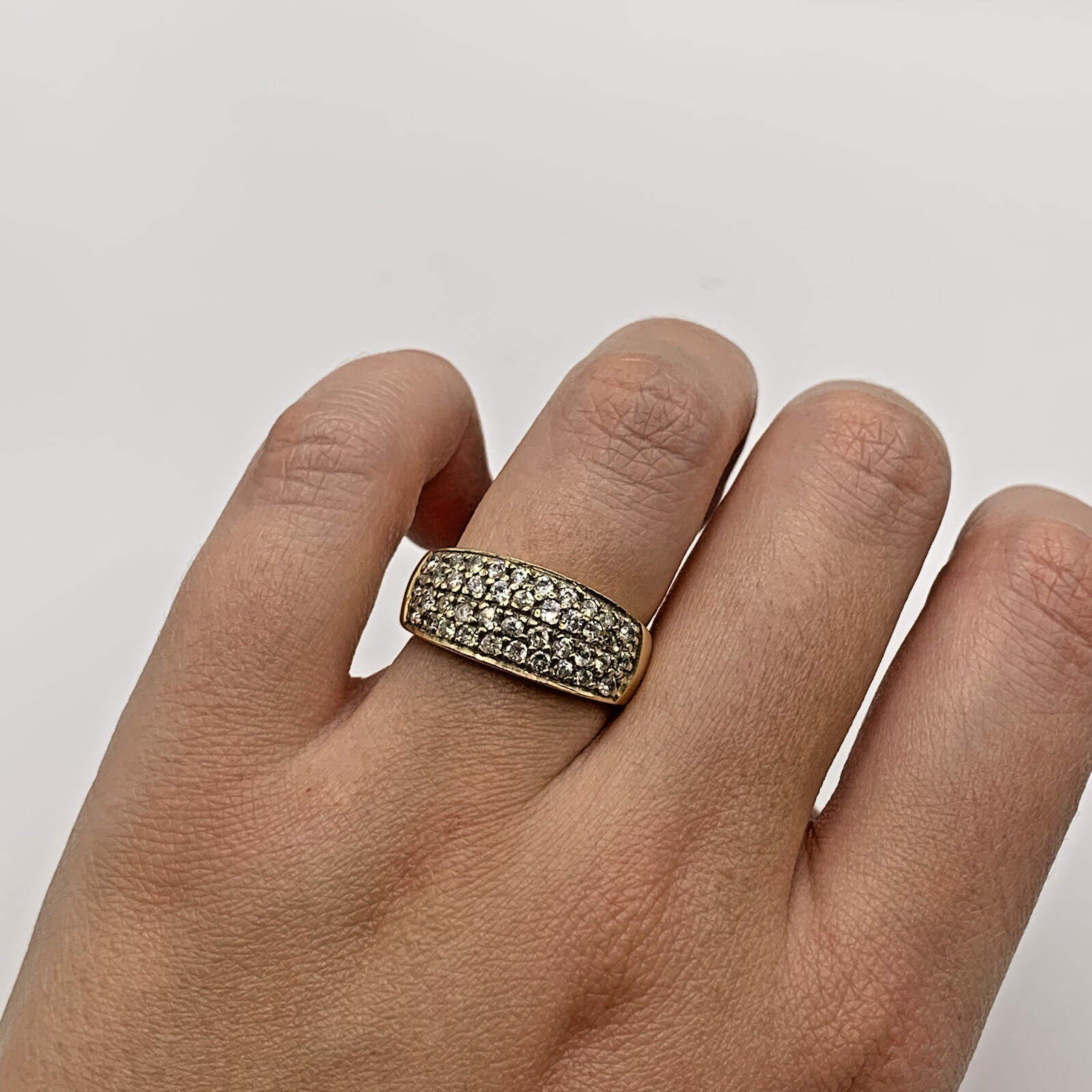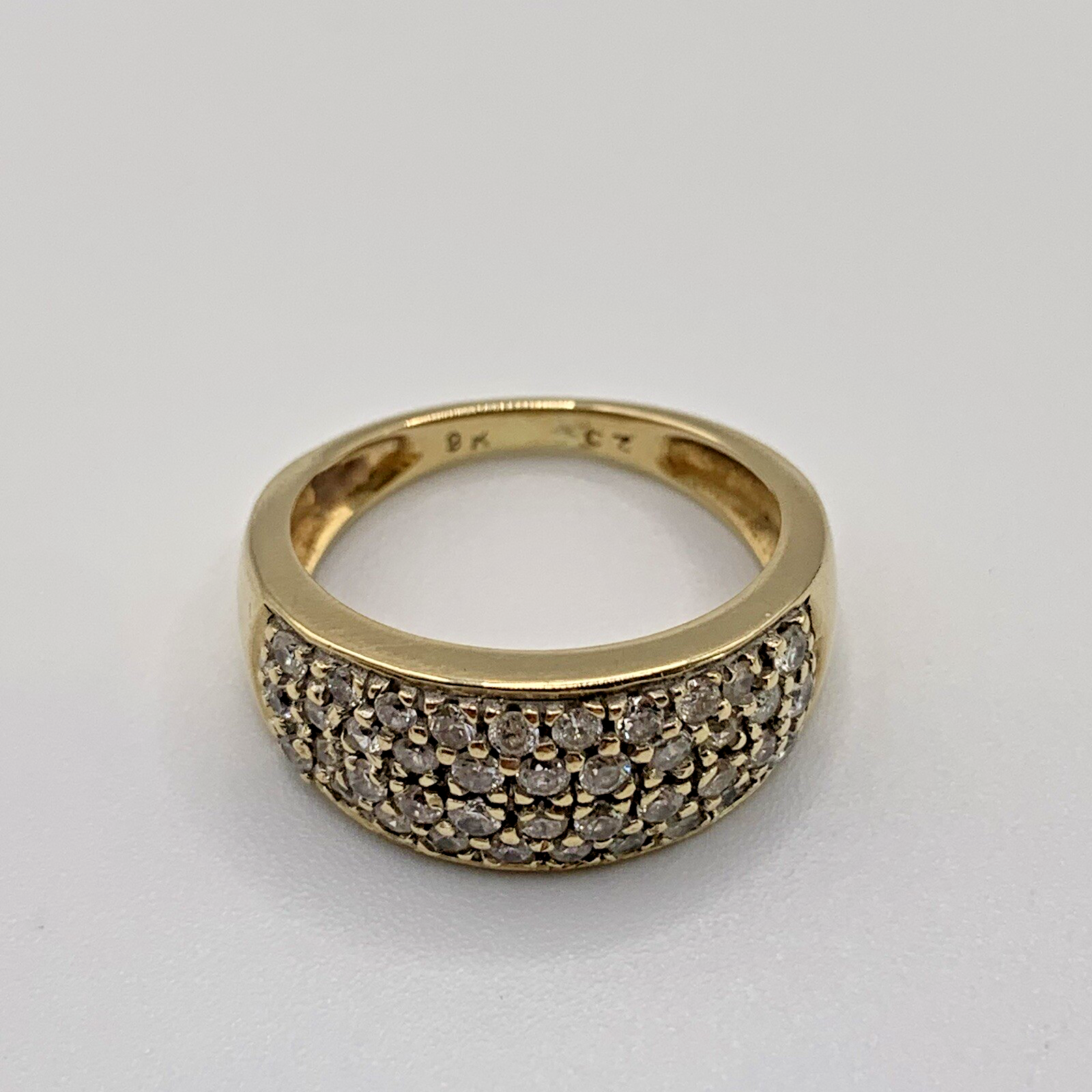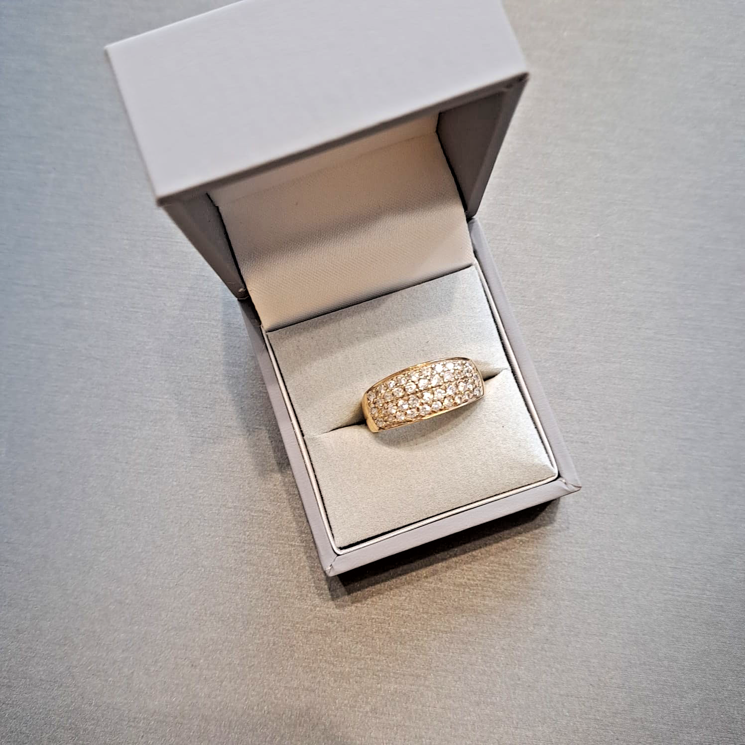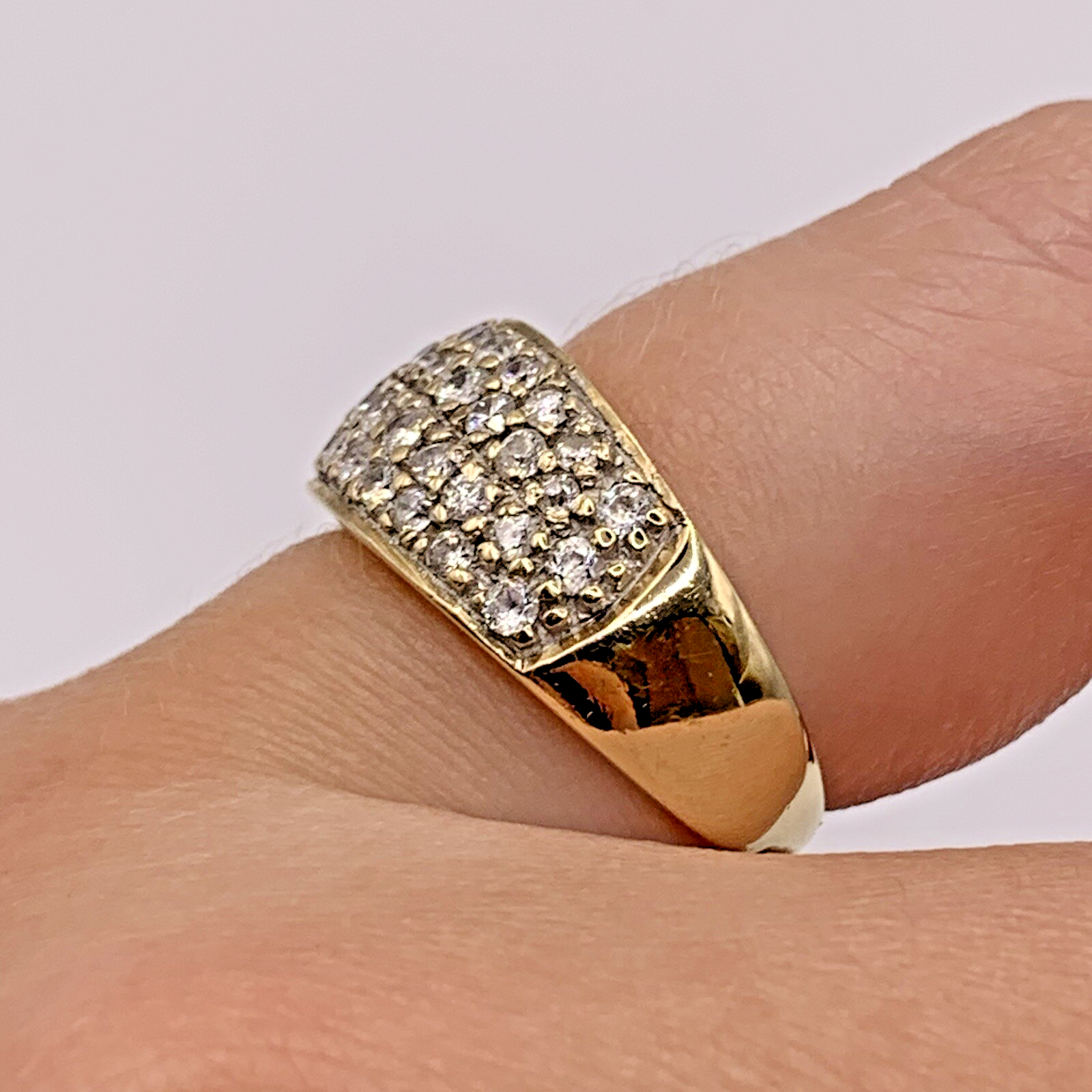 A gorgeous yellow gold ring showcasing a cluster of sparkling cubic zirconia stones that spreads across the band giving great finger coverage.