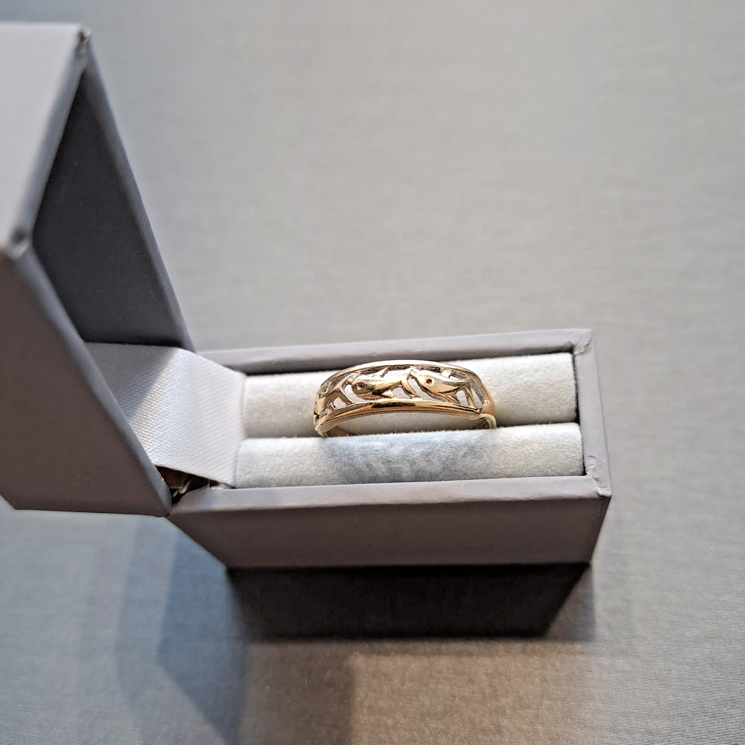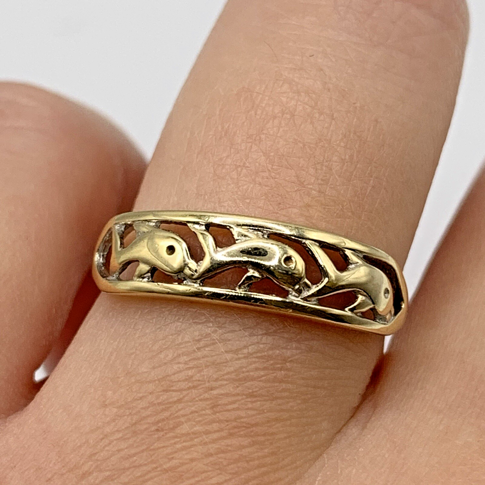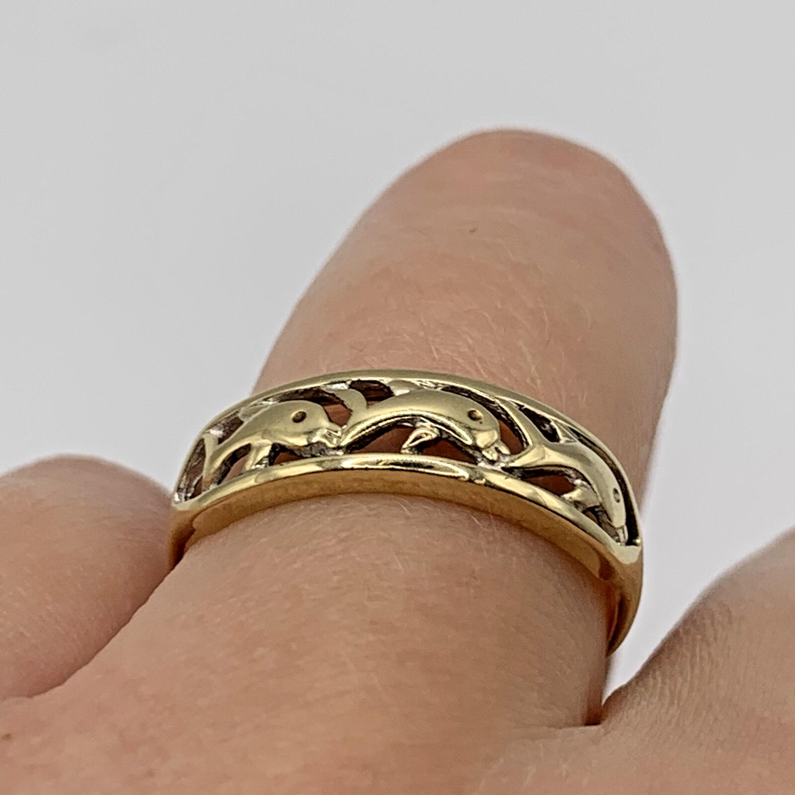 A charming delicate 9ct gold band ring featuring three dolphins.