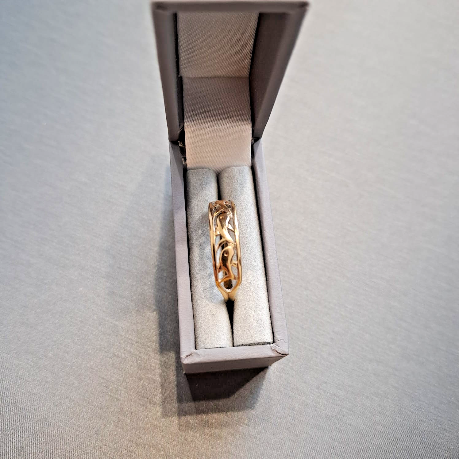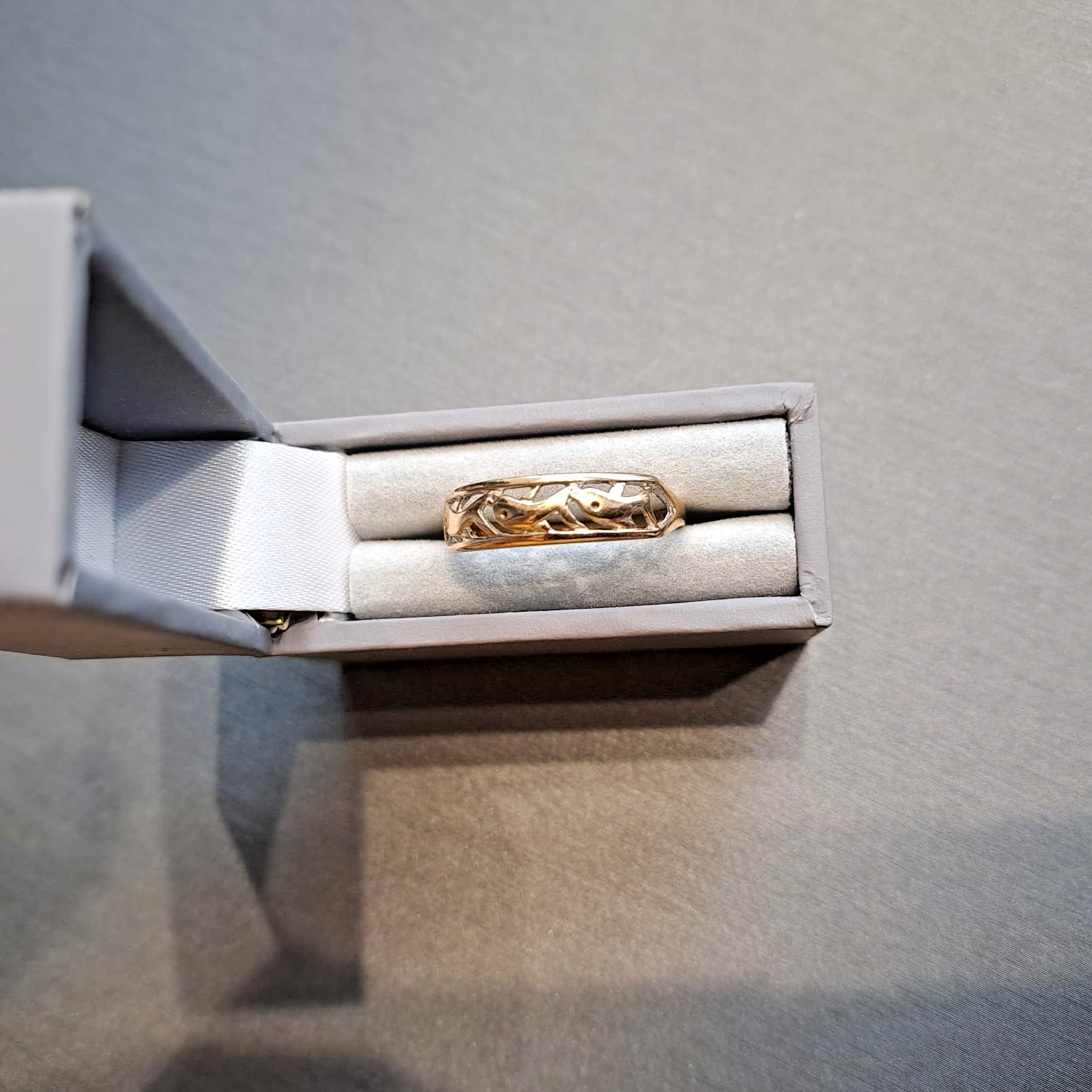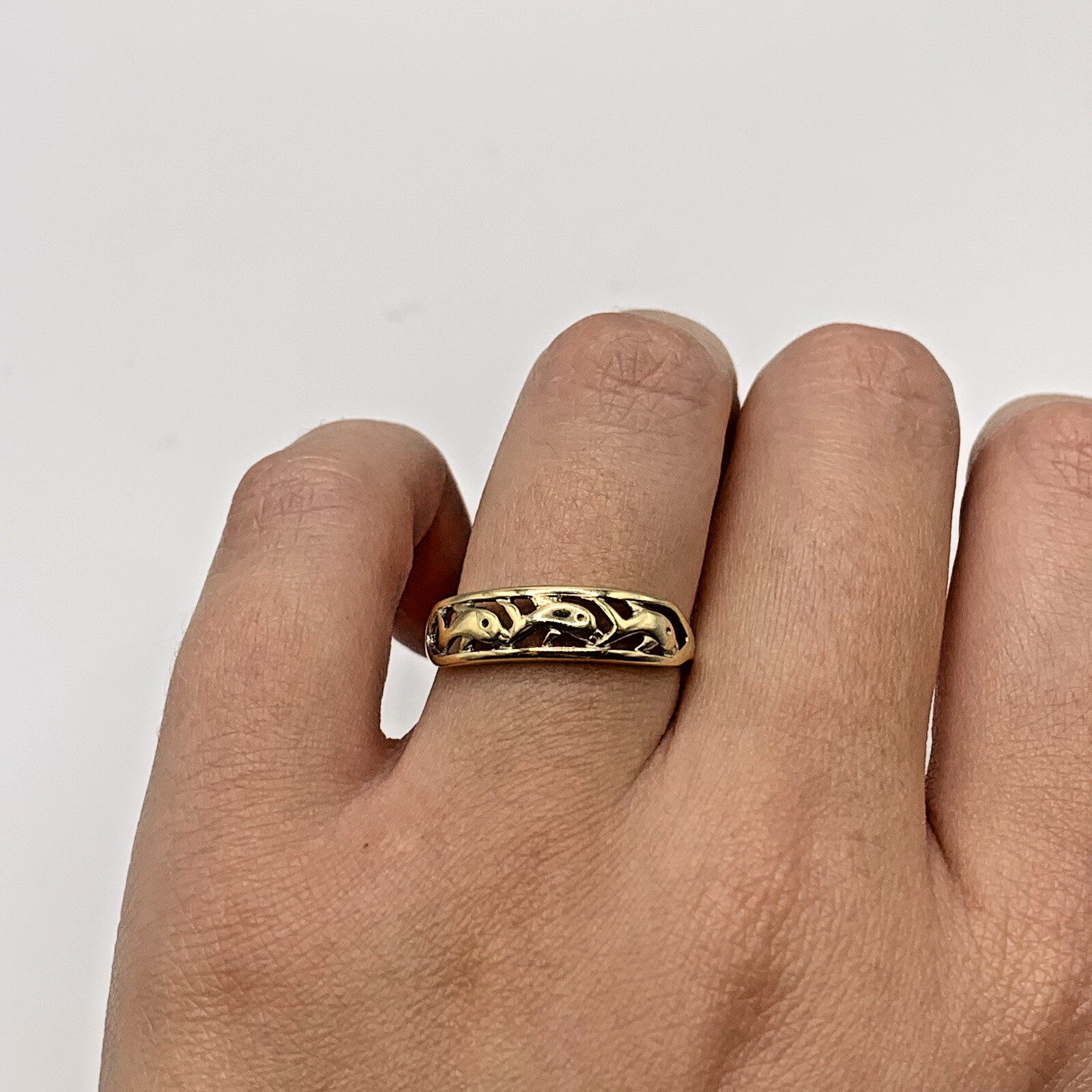 A charming delicate 9ct gold band ring featuring three dolphins.