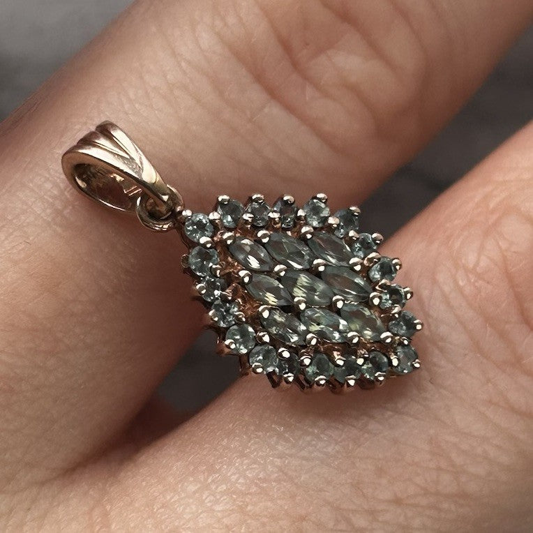 A stunning rose gold pendant featuring a collection of both marquise and round cut green spinel gemstones.