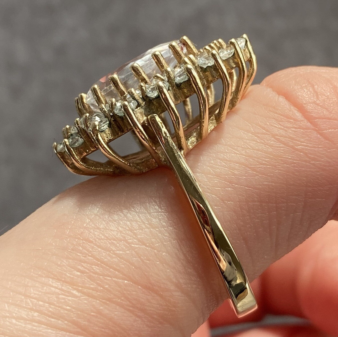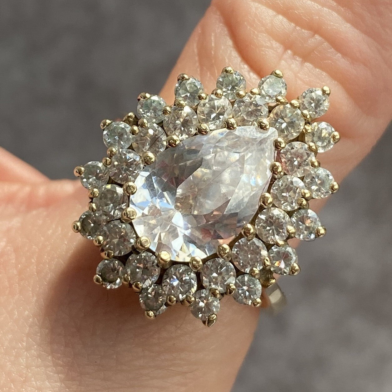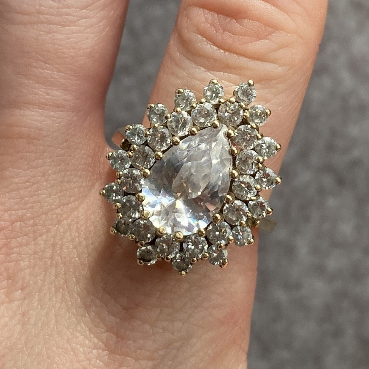A statement gold ring featuring an ornate pear cut cubic zirconia stone clustered by a double halo of round cut stones of the same kind.
