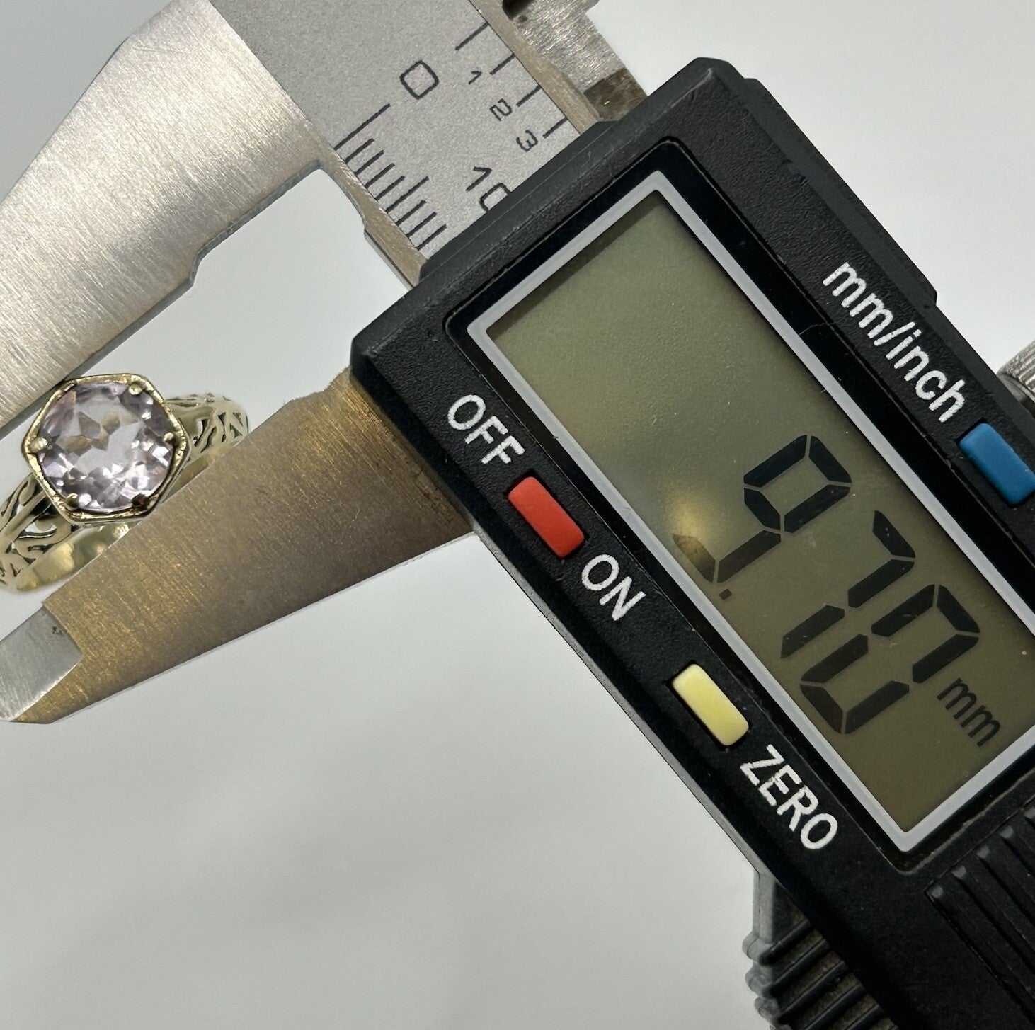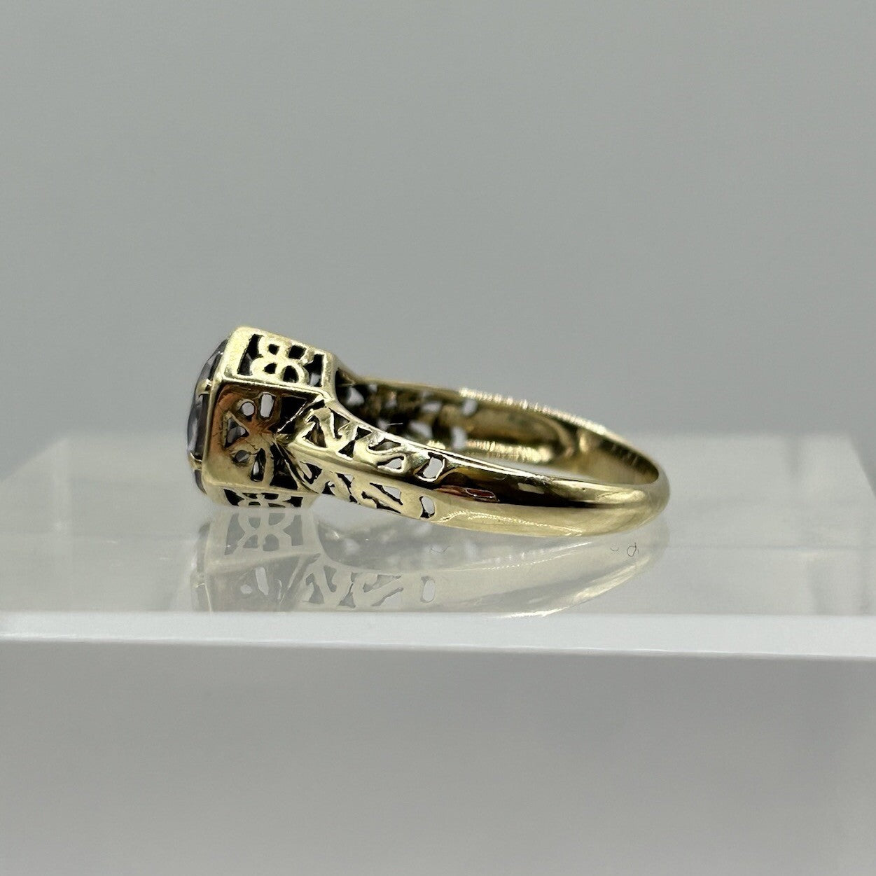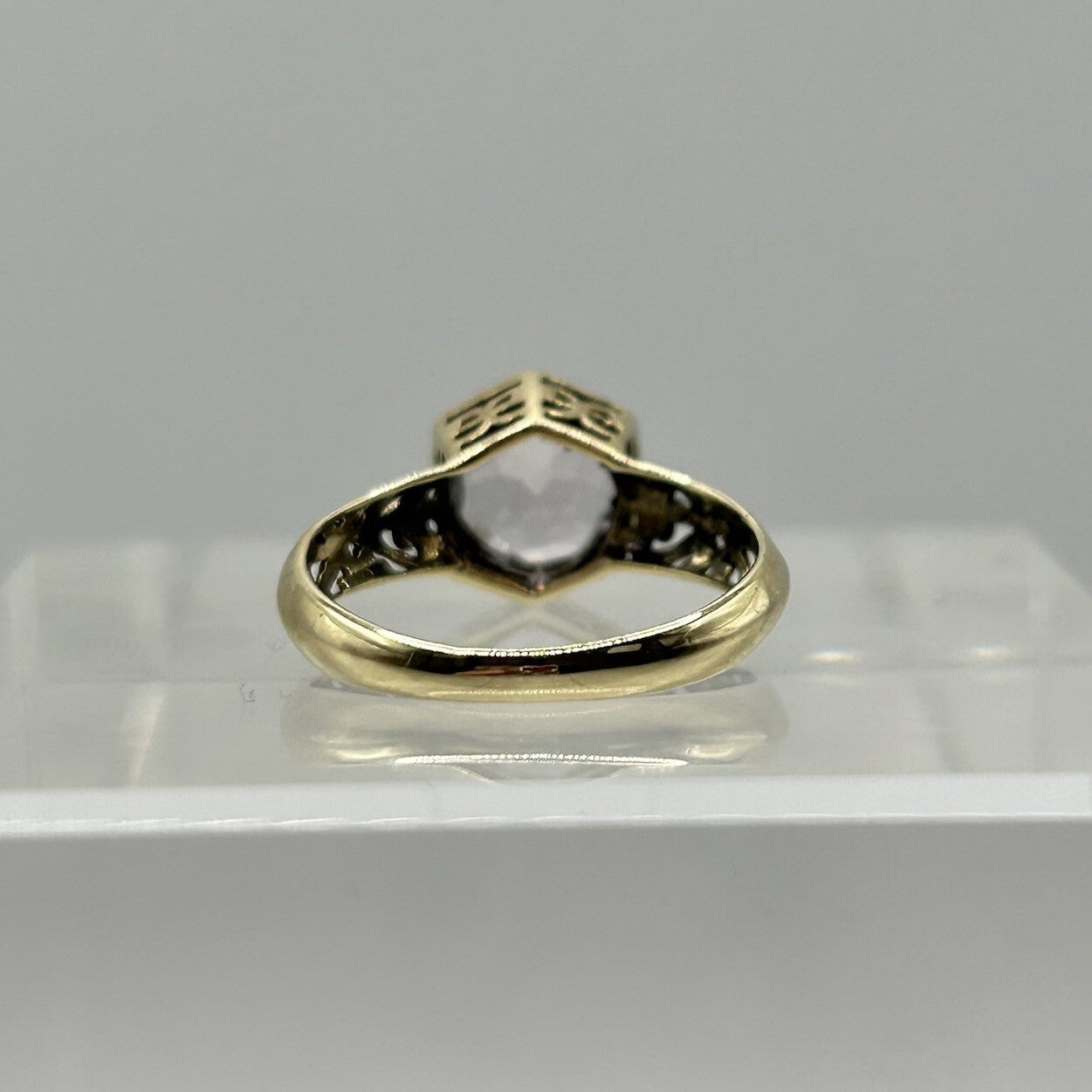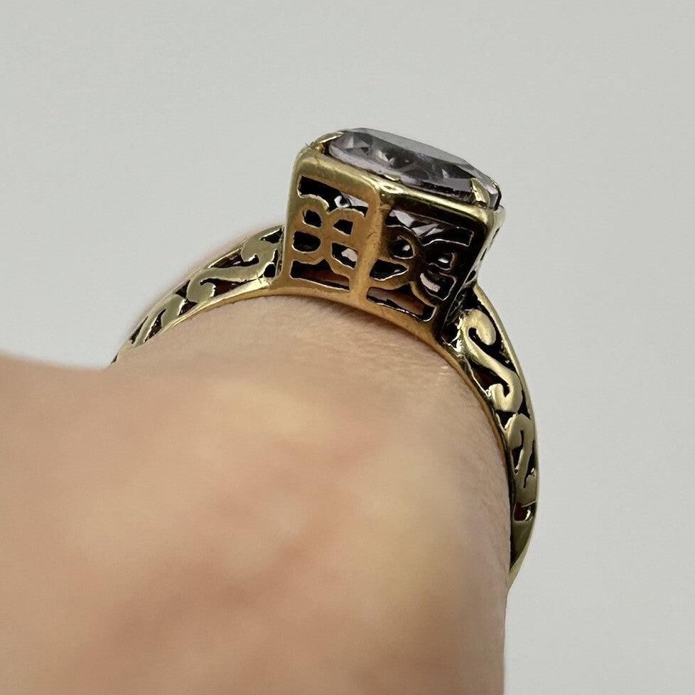 A stunning gold ring showcasing an ornate round cut pale amethyst, accented by intricate cut out detailing beneath and on the shank.