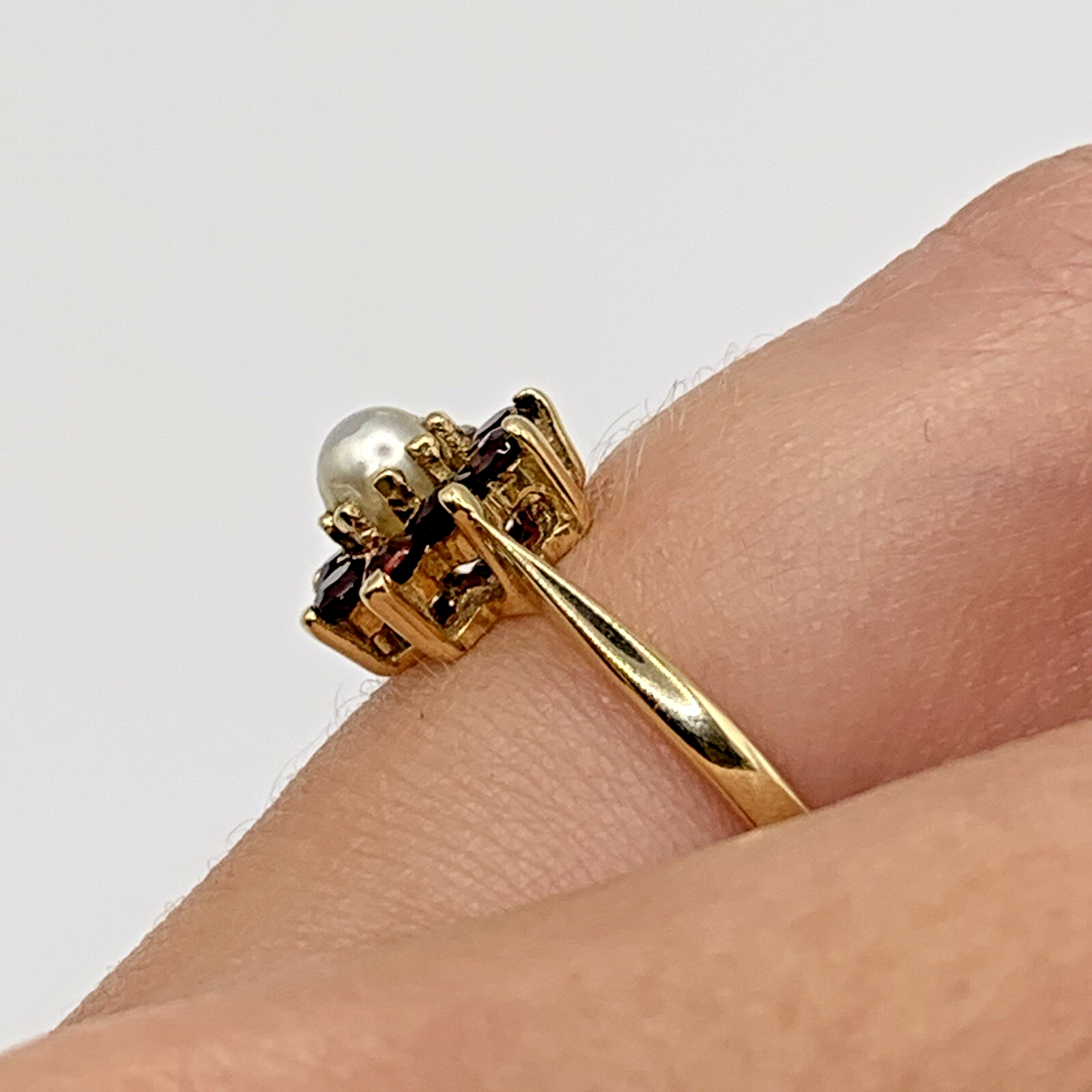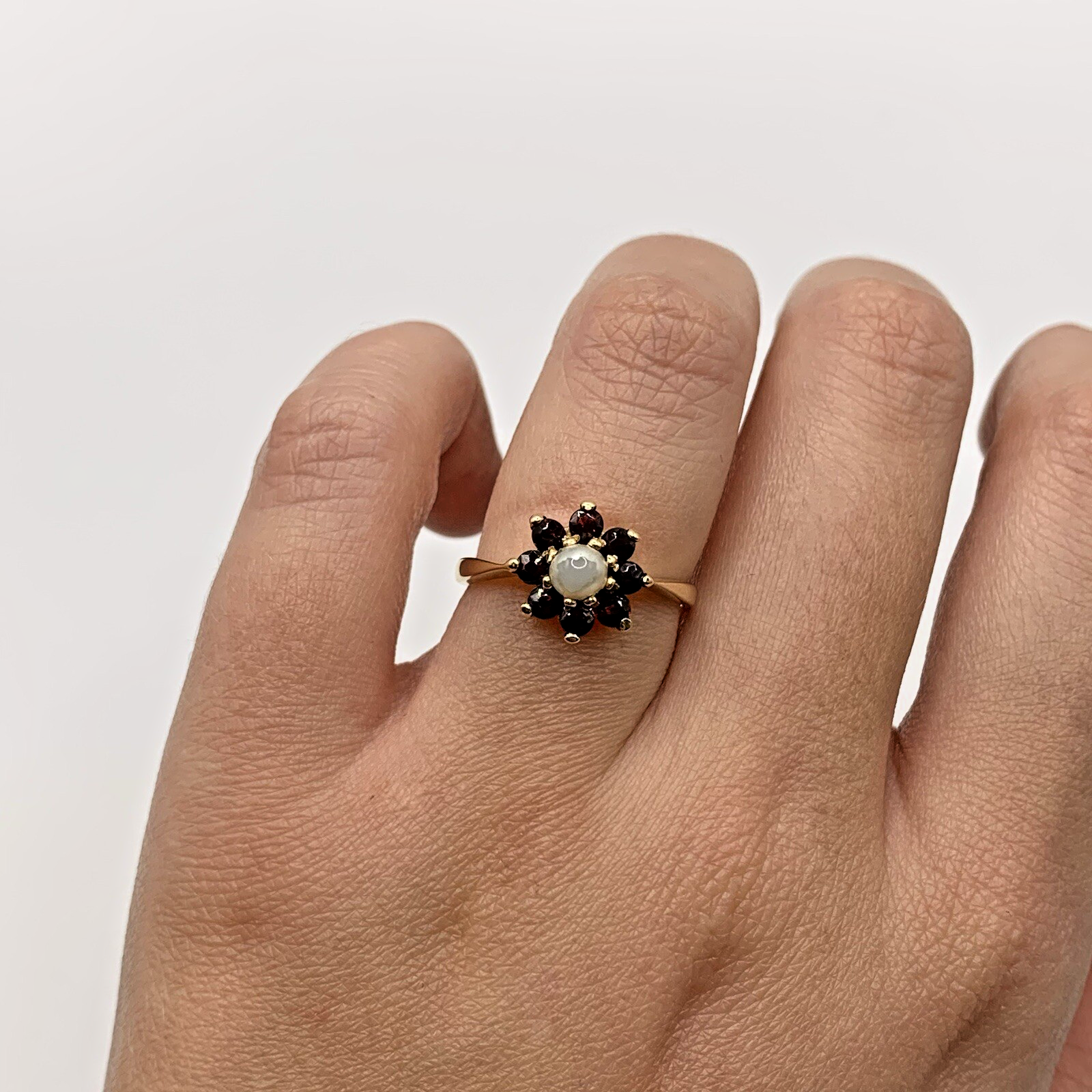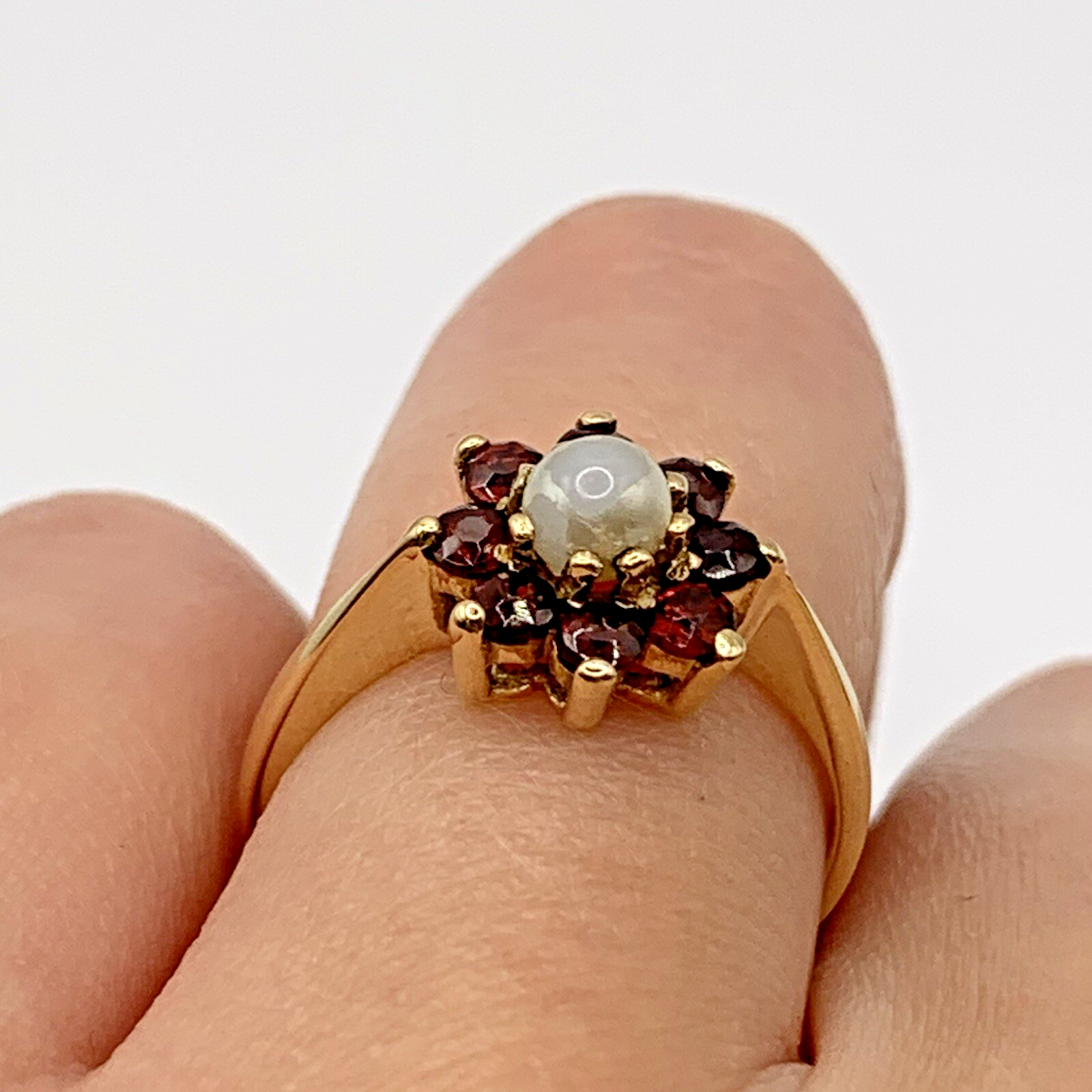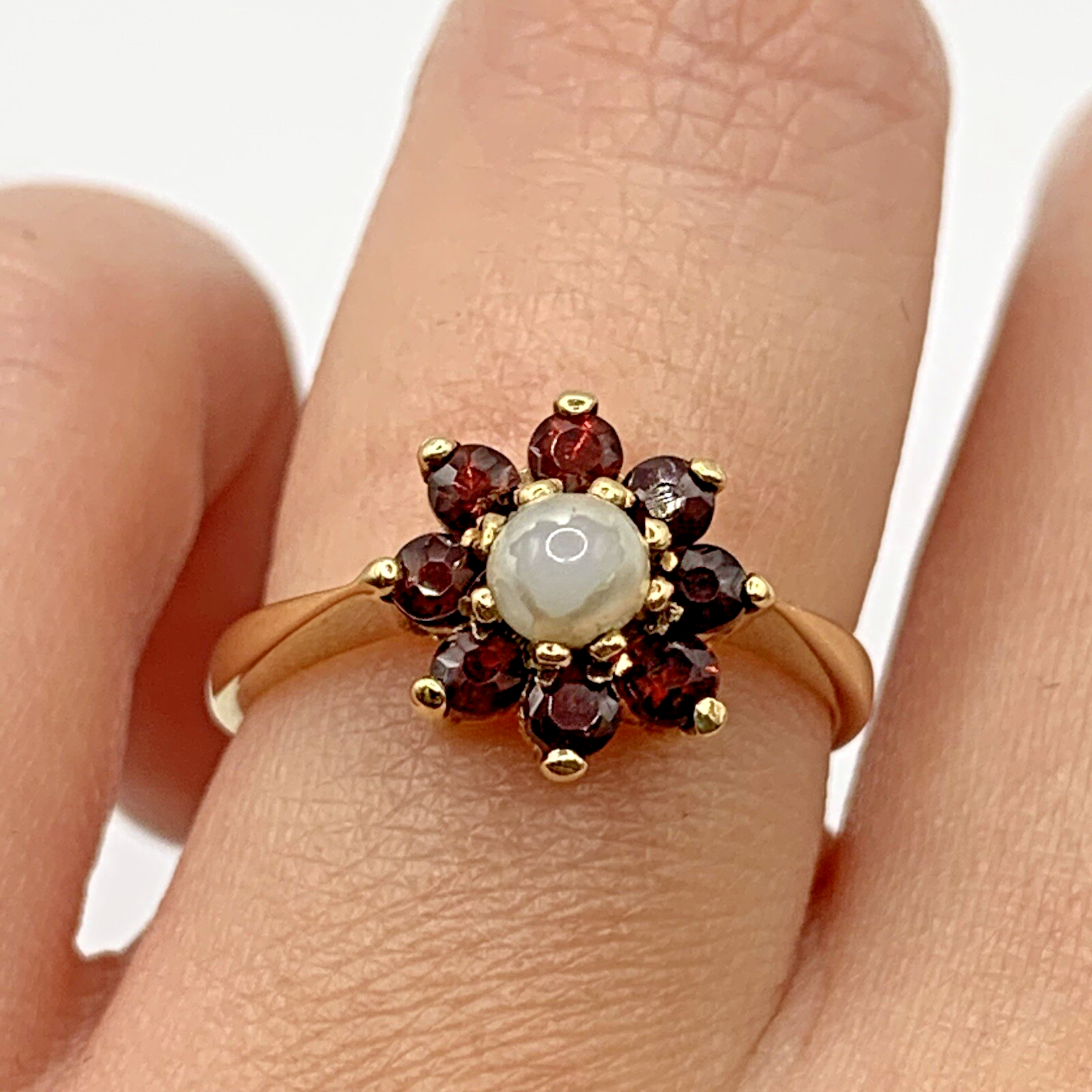 A gorgeous ring showcasing a daisy flower cluster of vibrant red garnets and a central synthetic pearl.
