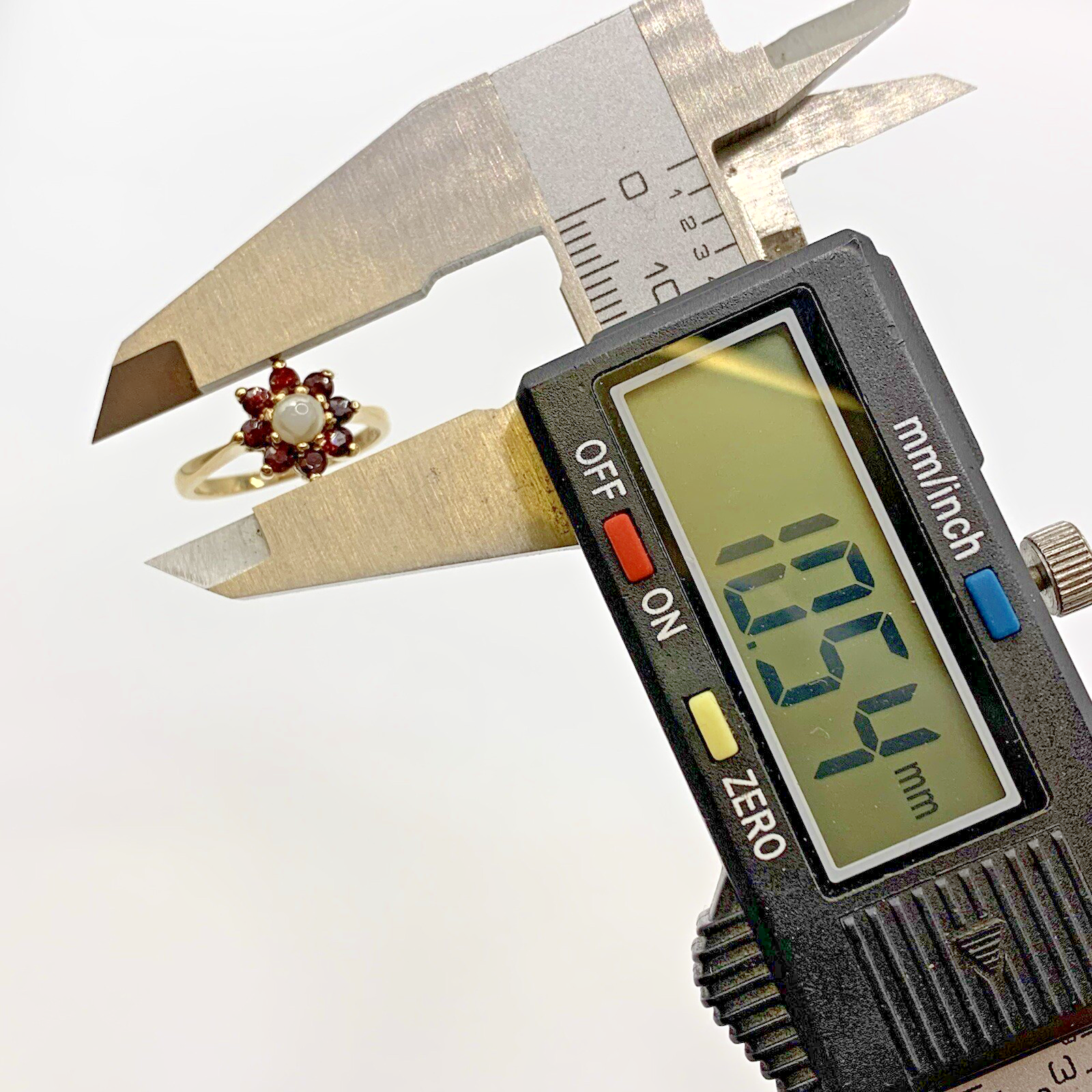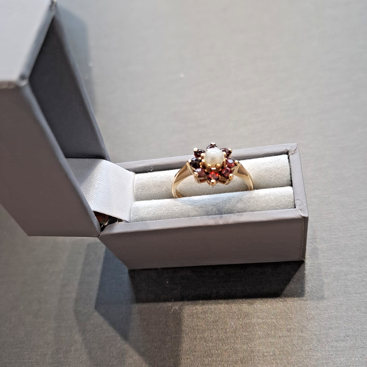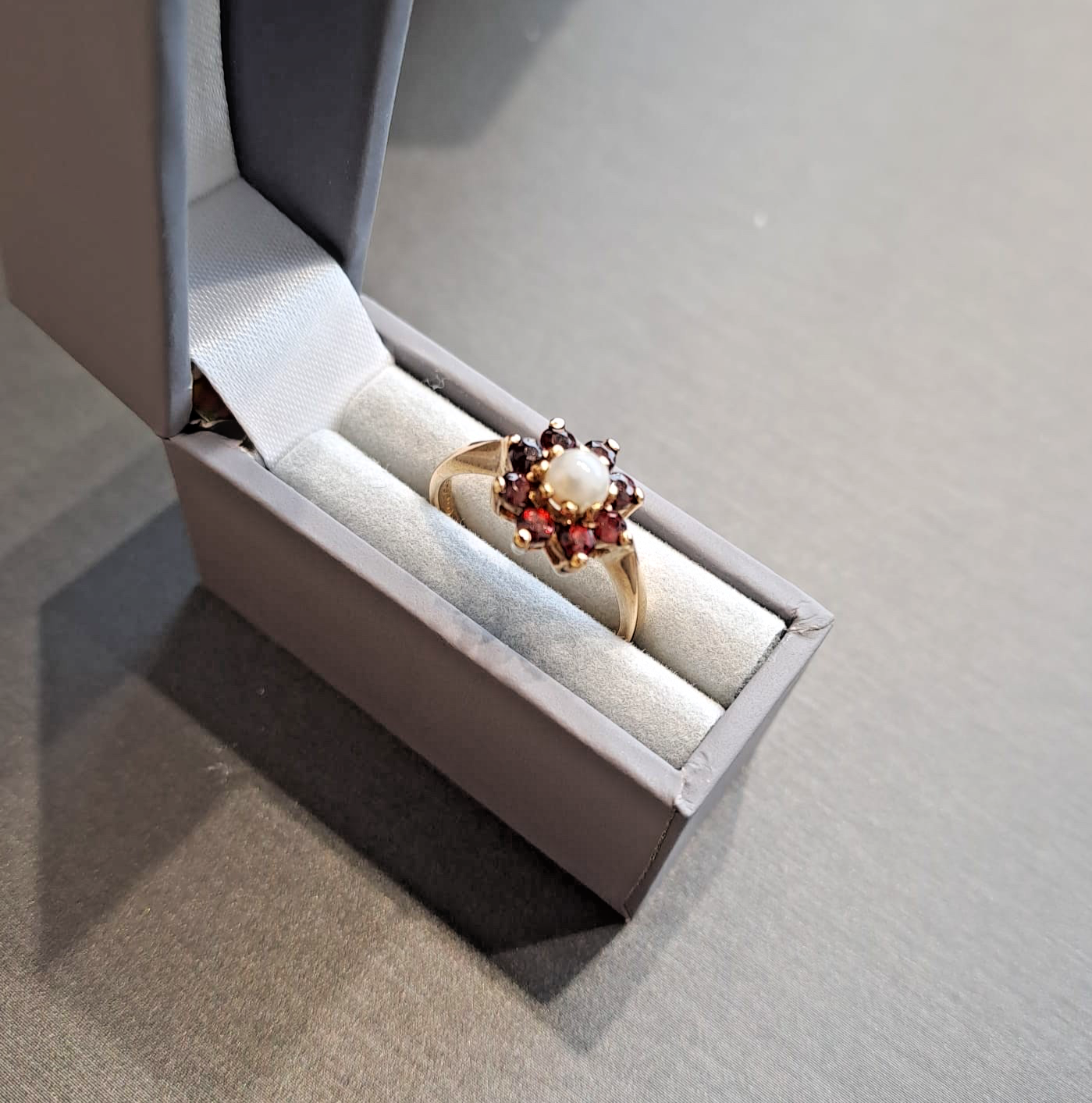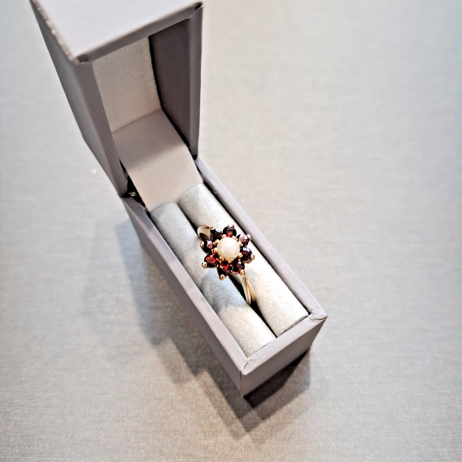 A gorgeous ring showcasing a daisy flower cluster of vibrant red garnets and a central synthetic pearl.