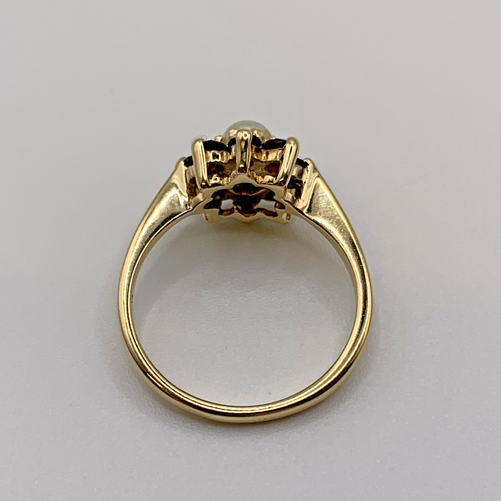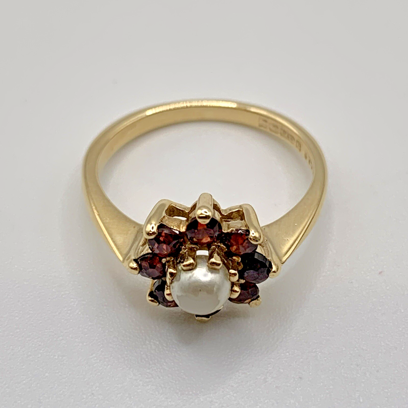 Pearl & Garnet 9 ct Gold Ring Antique Ring Daisy Halo Cluster - Size L