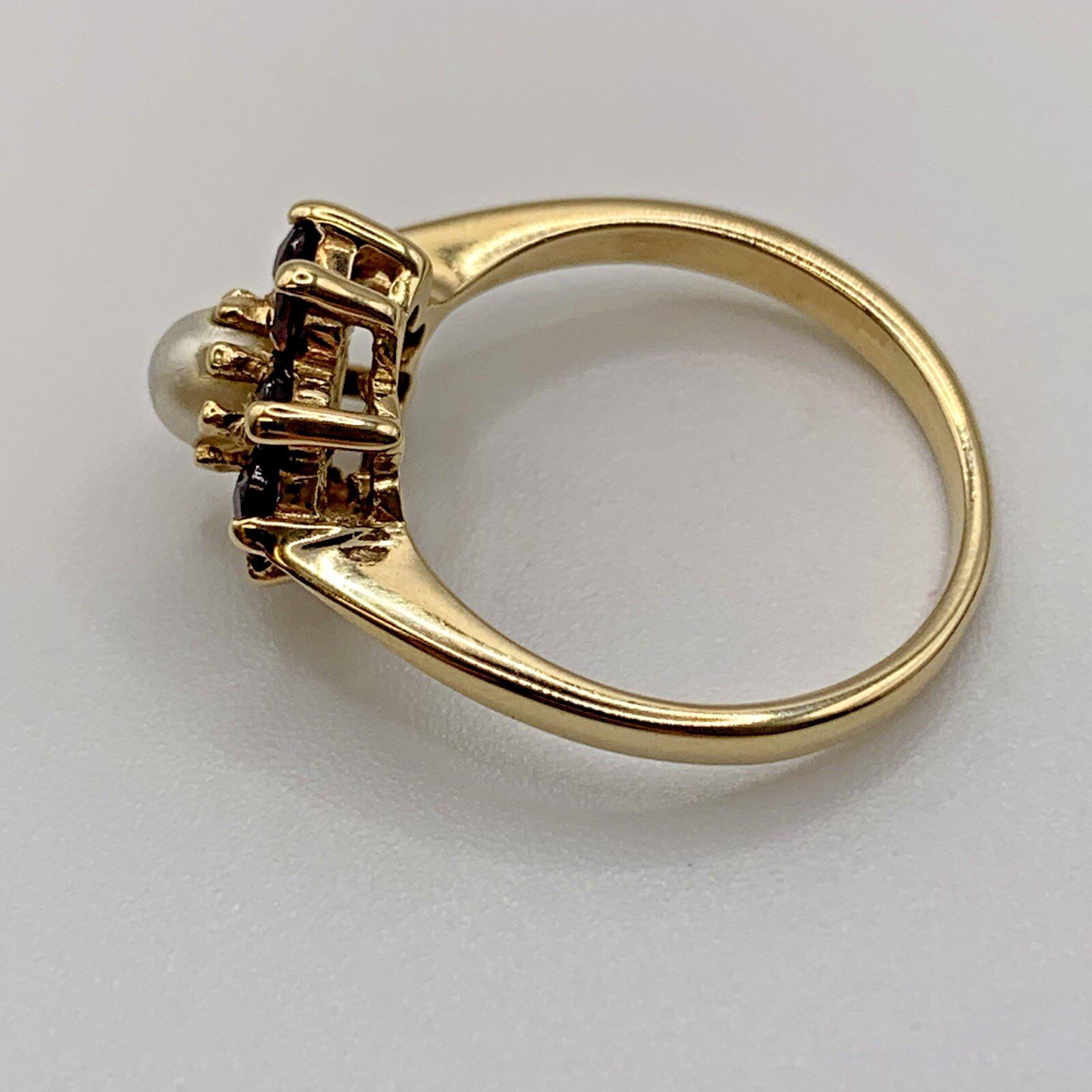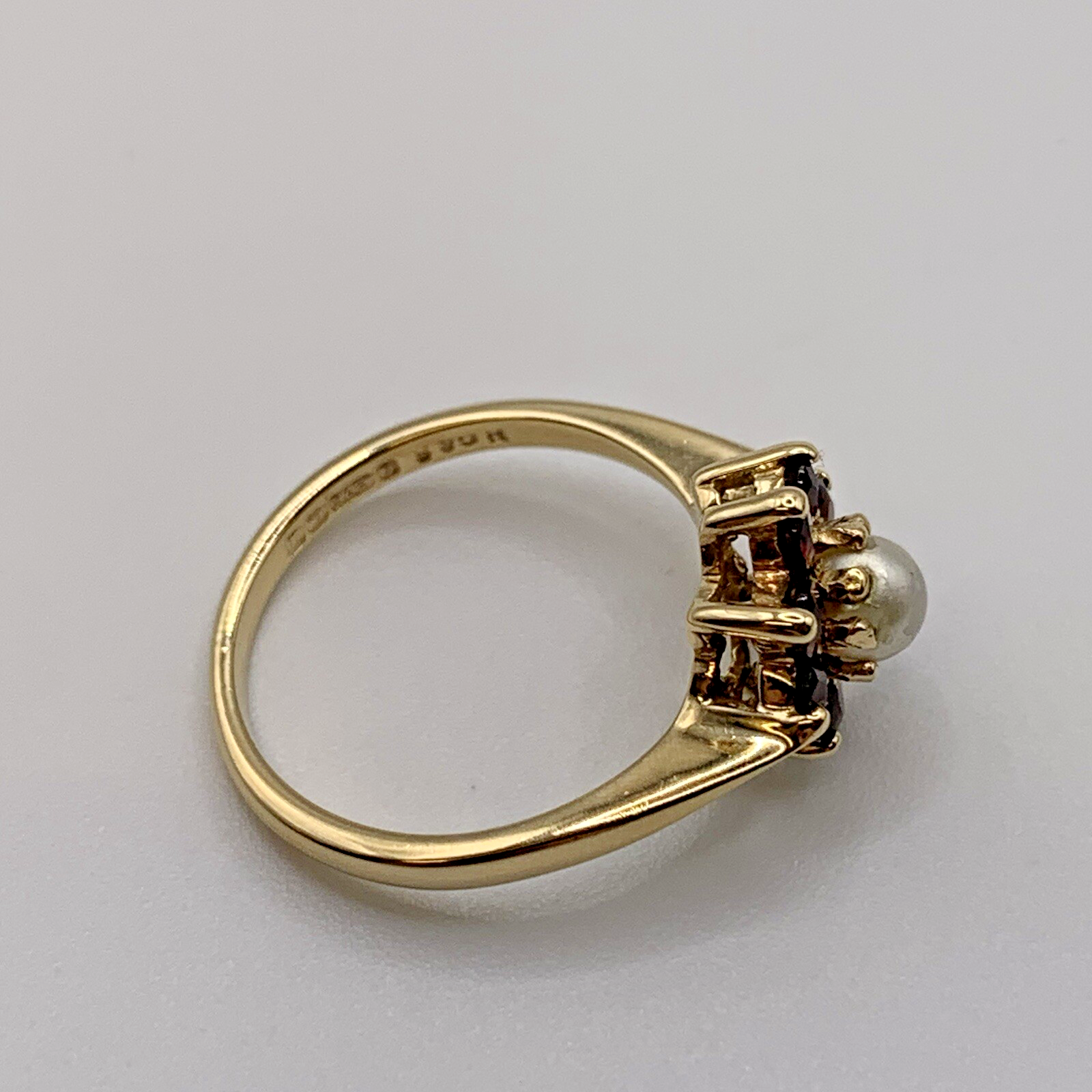 In excellent vintage condition. Shank, settings/claws and garnets are all in mint condition. Central pearl has some wear to it, noticeable under close inspection.
