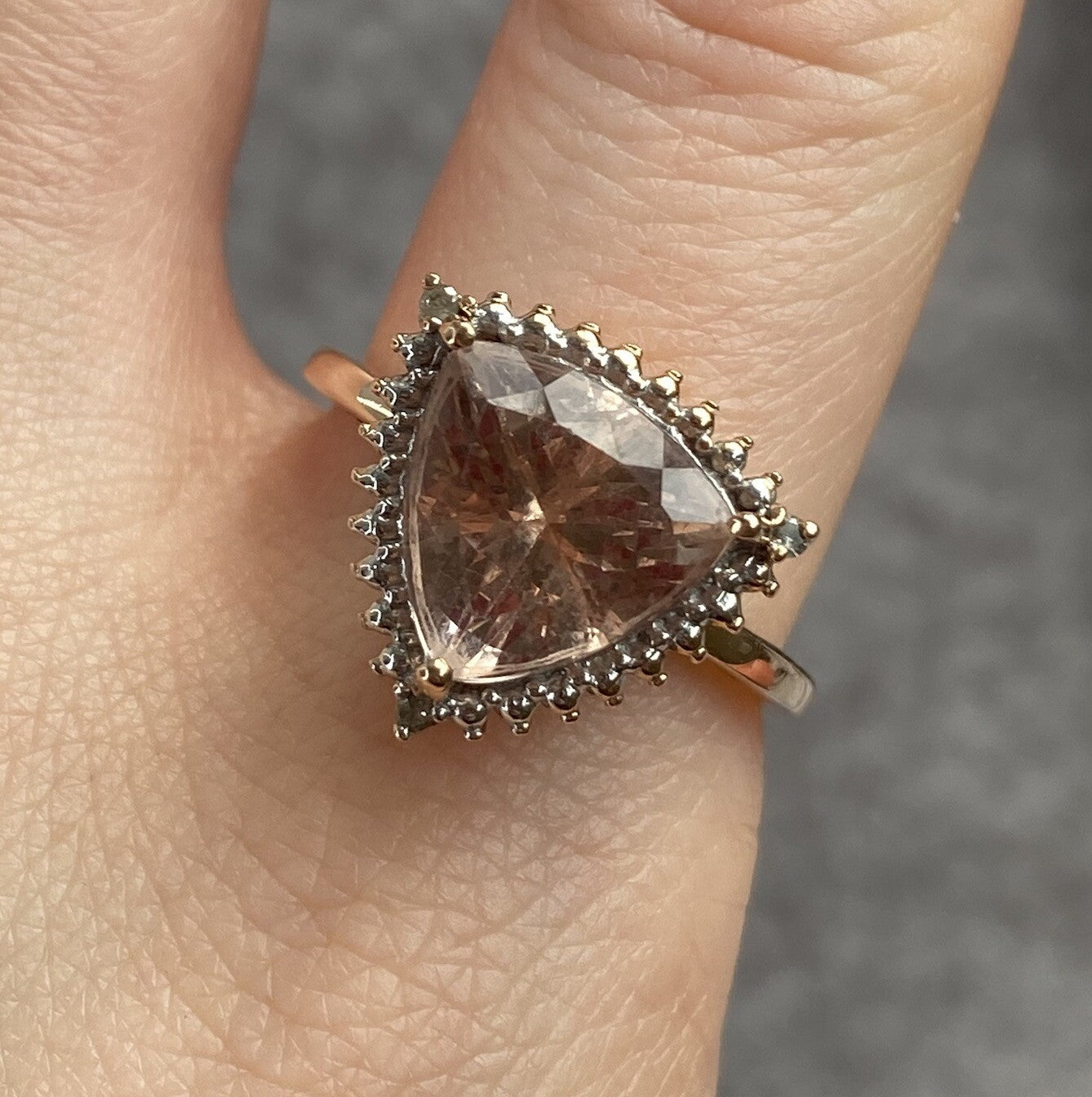 A stunning rose gold ring featuring an ornate trilliant cut pink champagne topaz accented by a trio of petite diamonds.