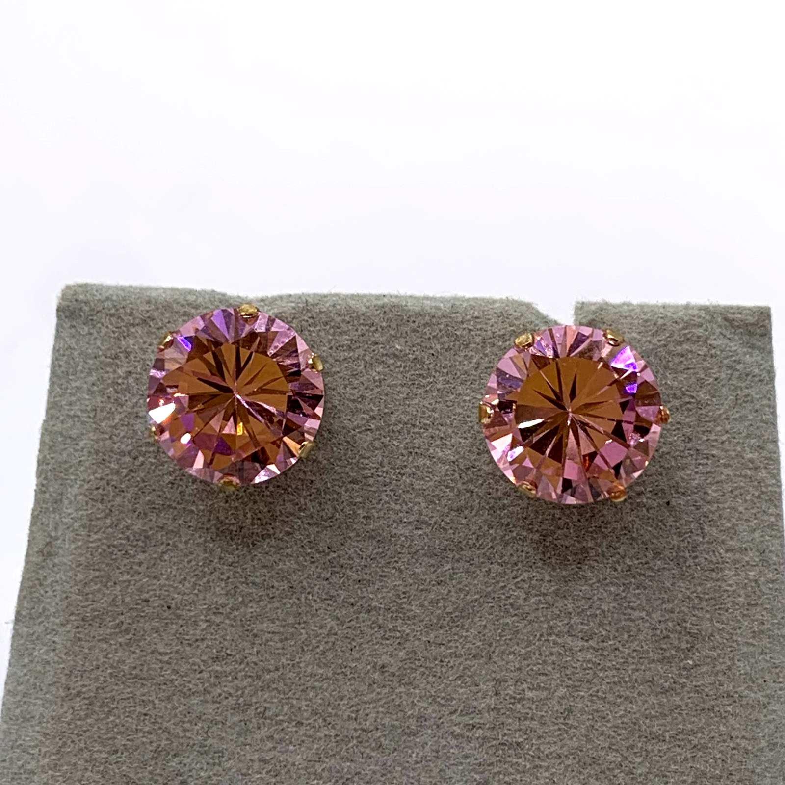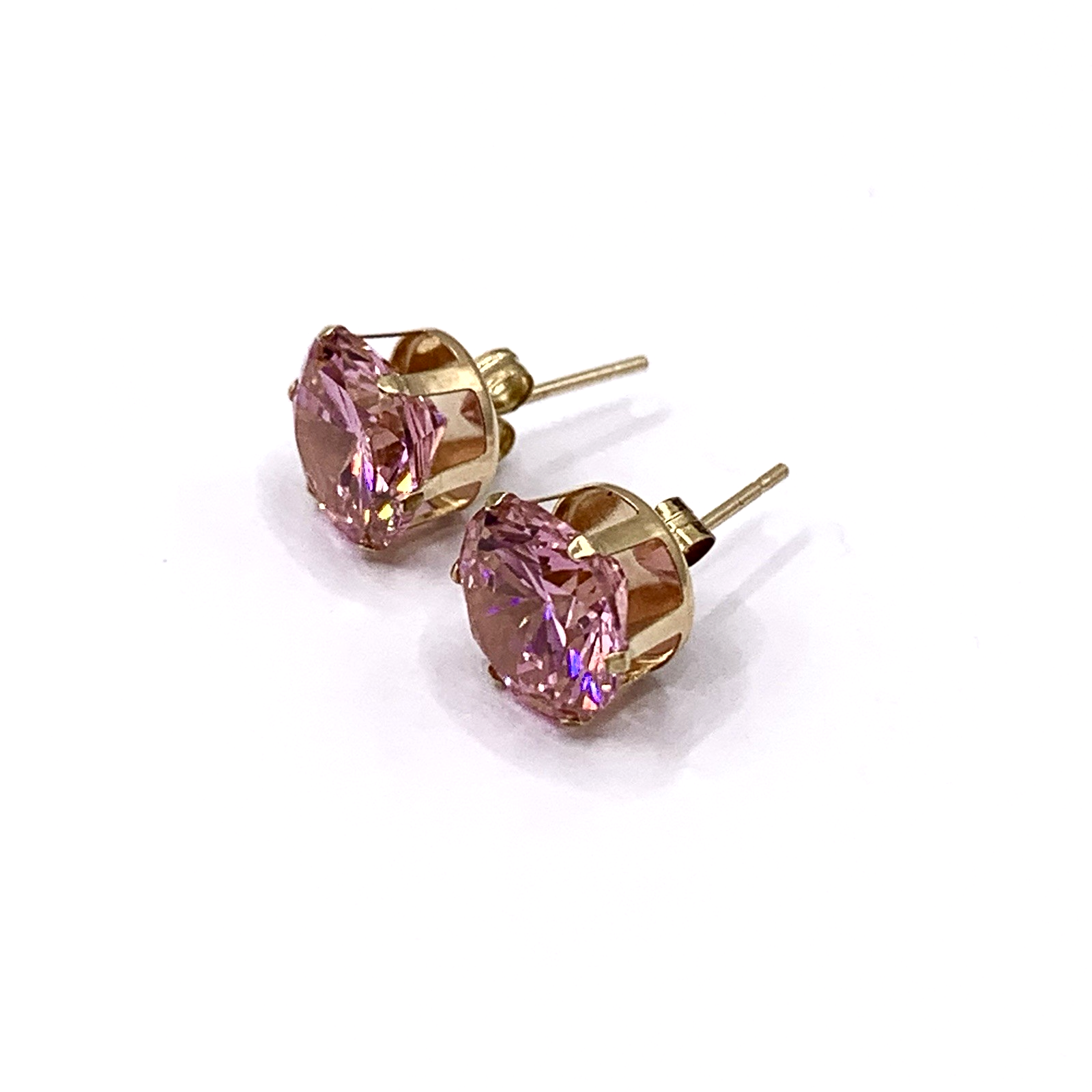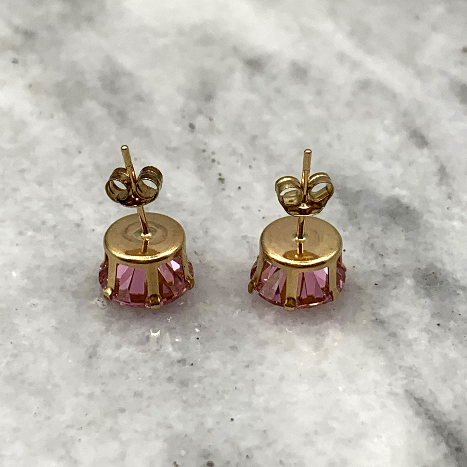 - A lovely pair of gold stud earrings featuring round cut pink topaz. Butterfly back.