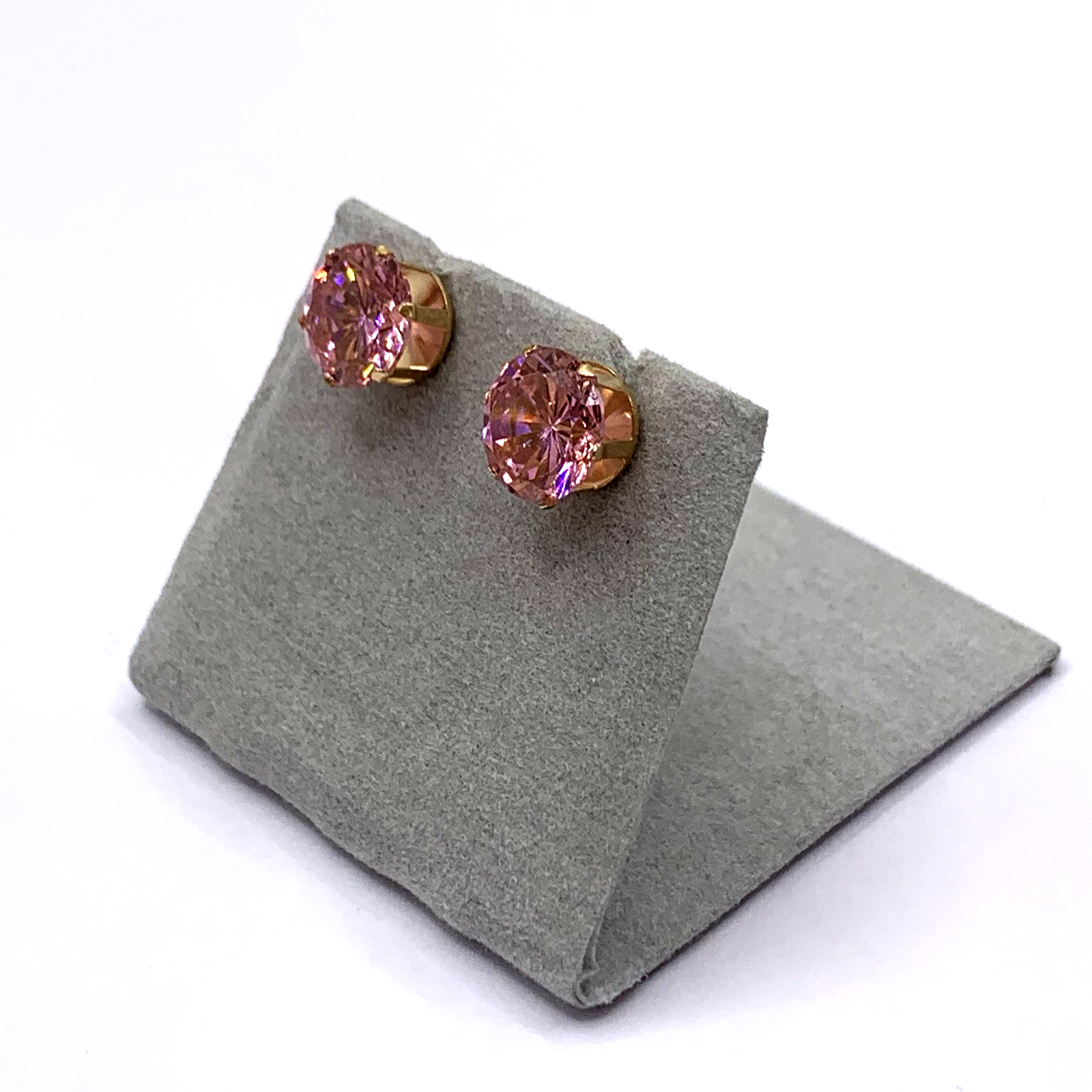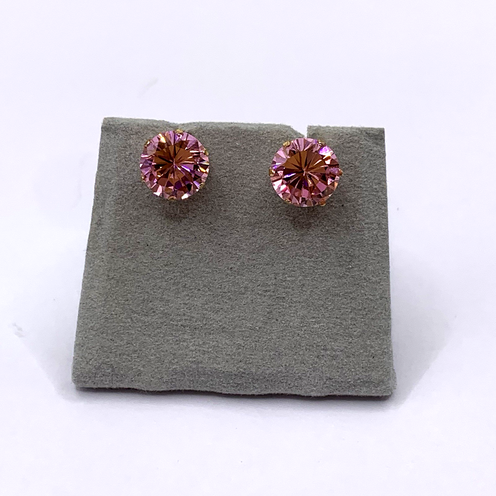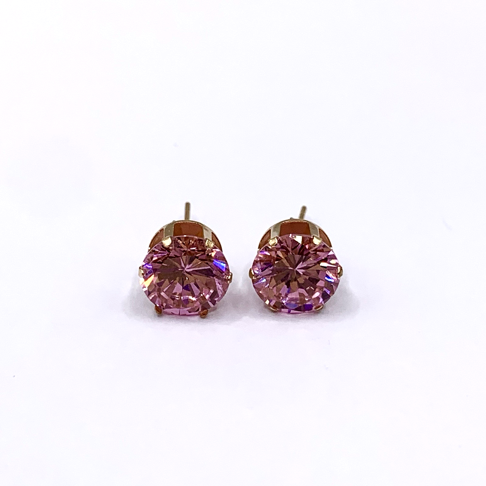 - A lovely pair of gold stud earrings featuring round cut pink topaz. Butterfly back.