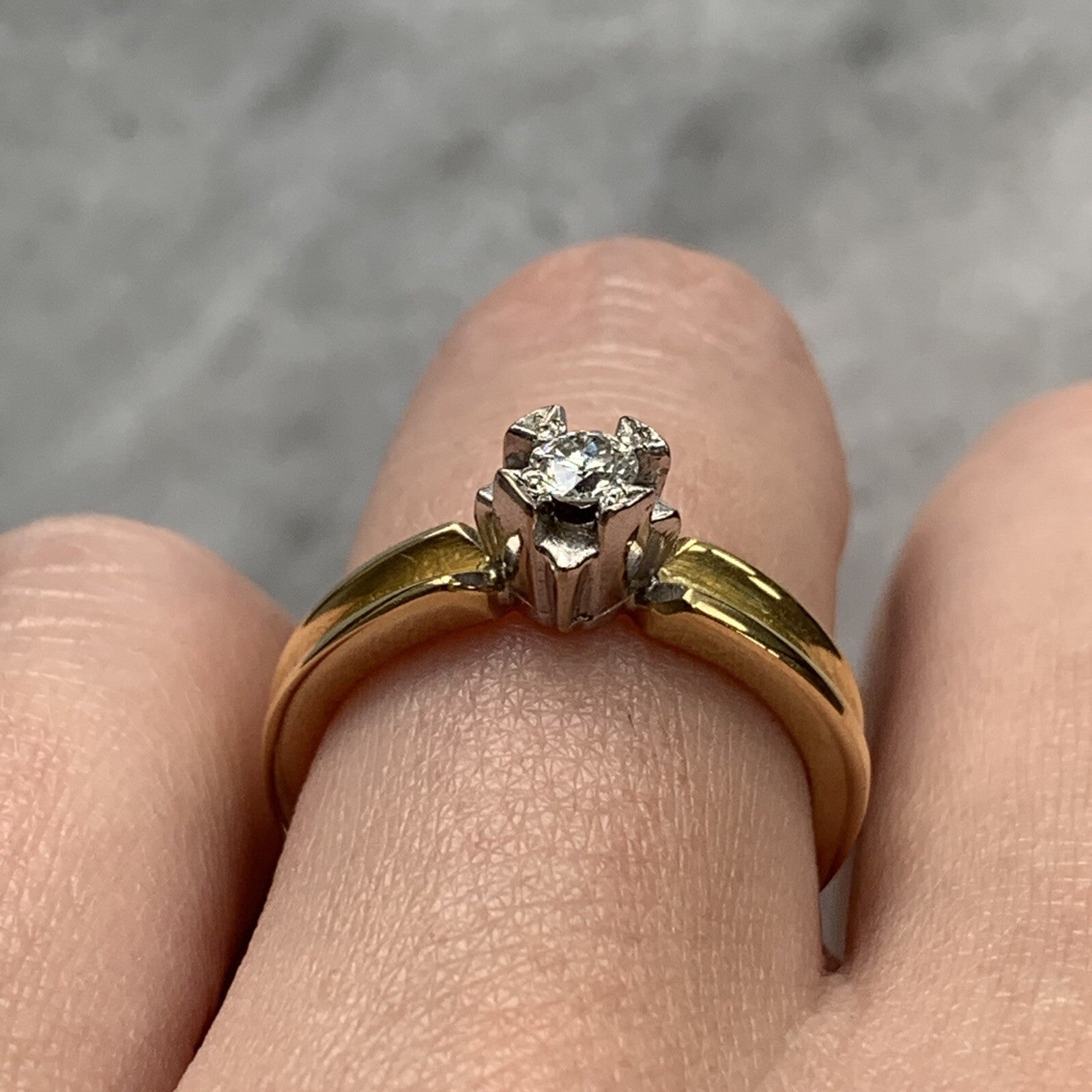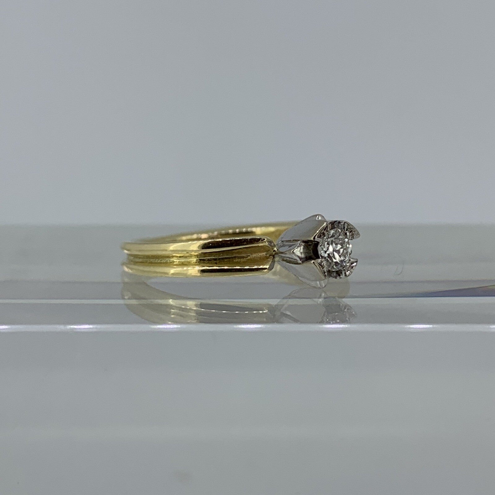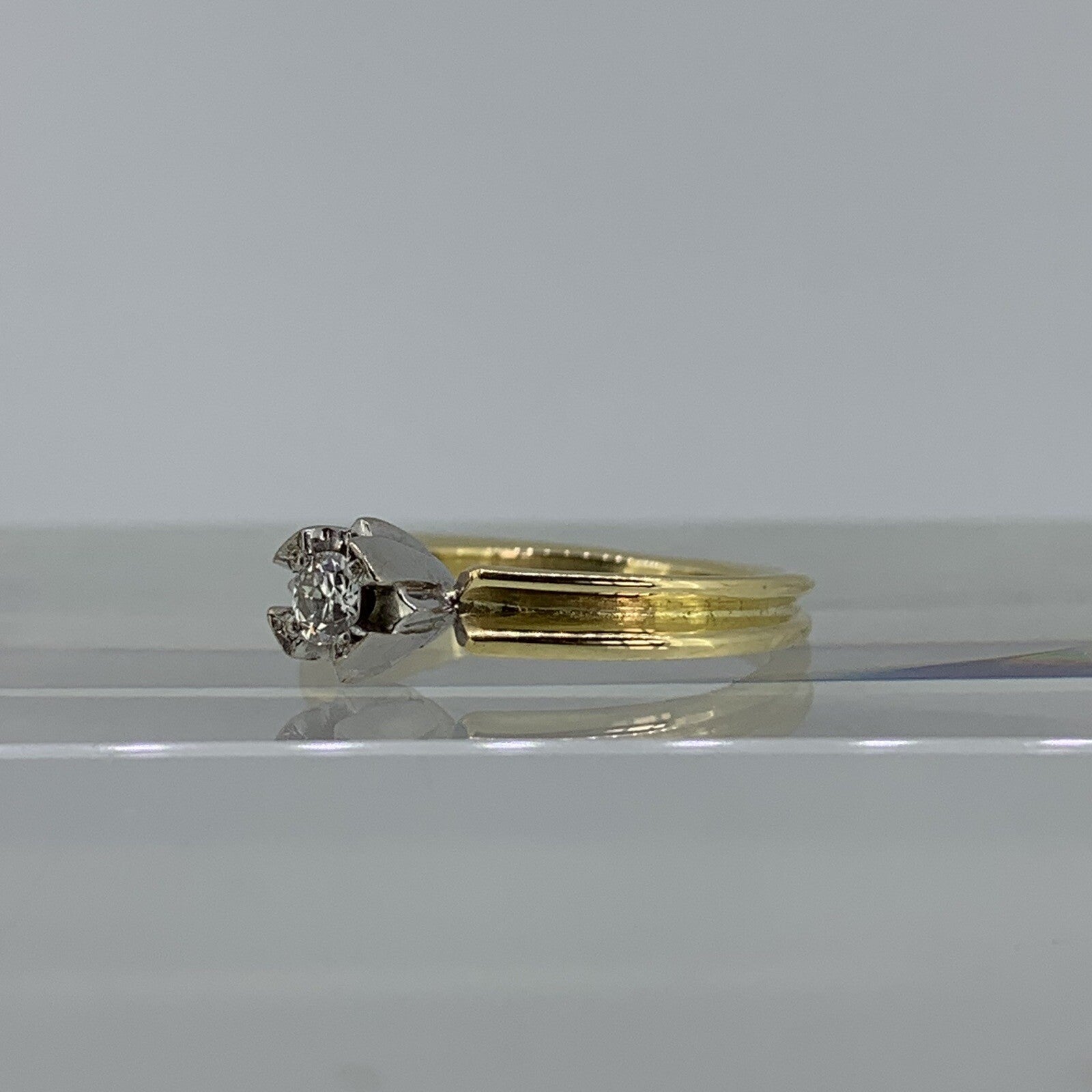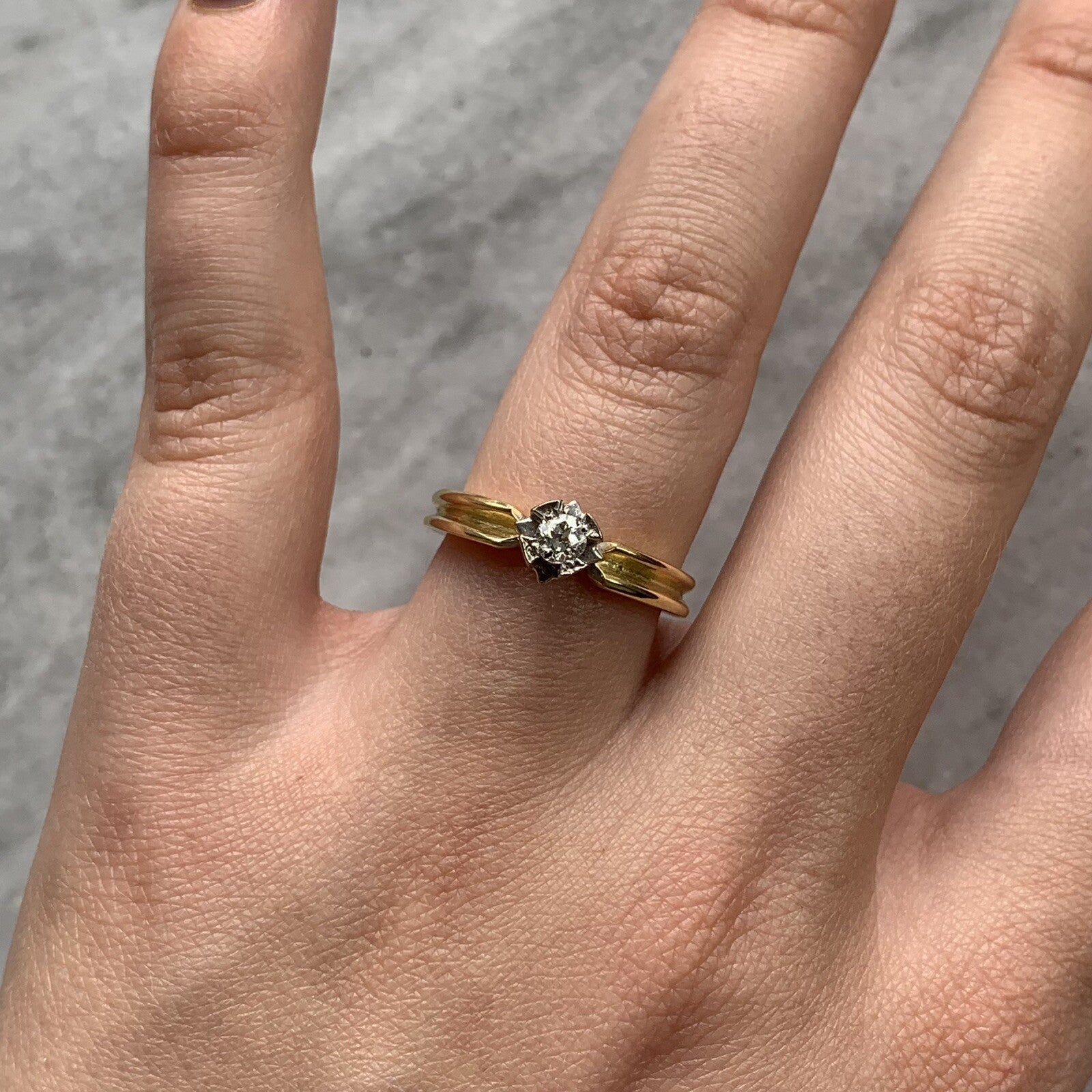 A gorgeous retro gold ring featuring a natural diamond in a unique white gold solitaire setting. The perfect alternative engagement ring.