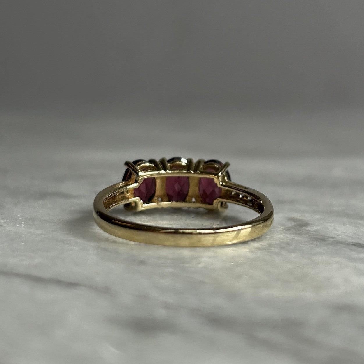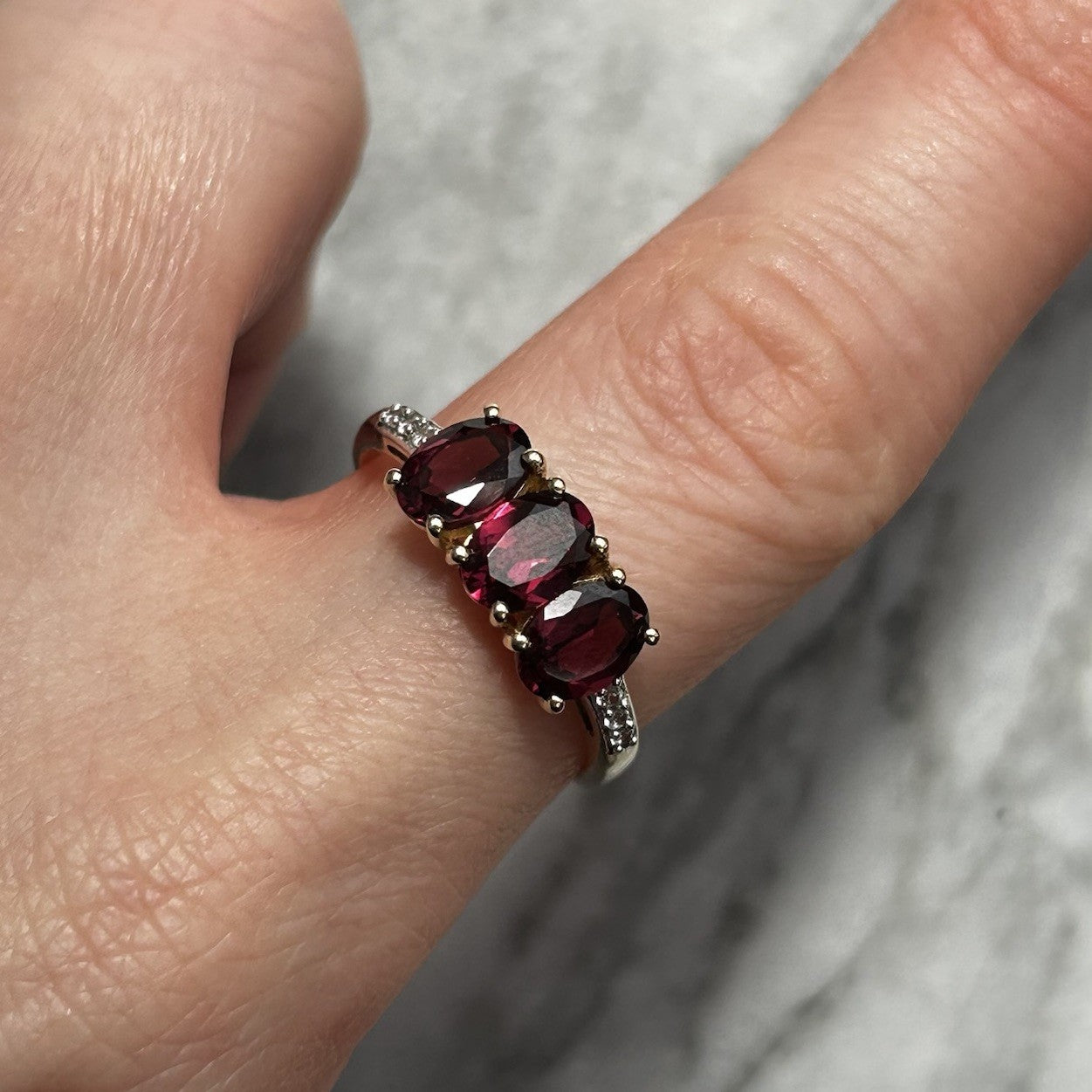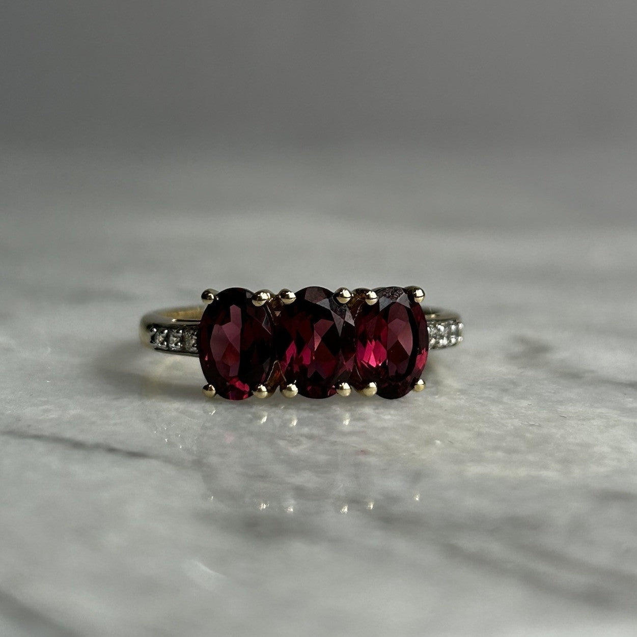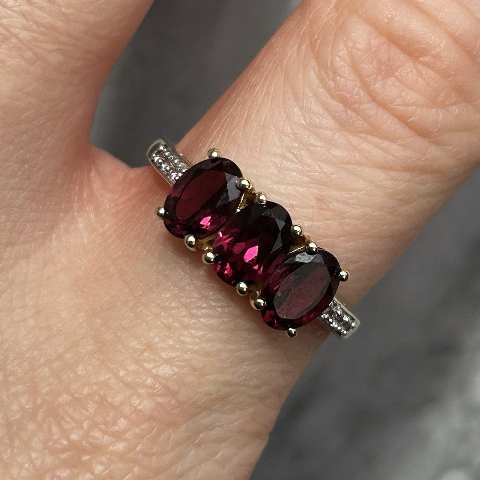A gorgeous gold ring featuring a trilogy of oval cut rhodolite garnets, flanked by petite pave set white zircon to the shoulders.