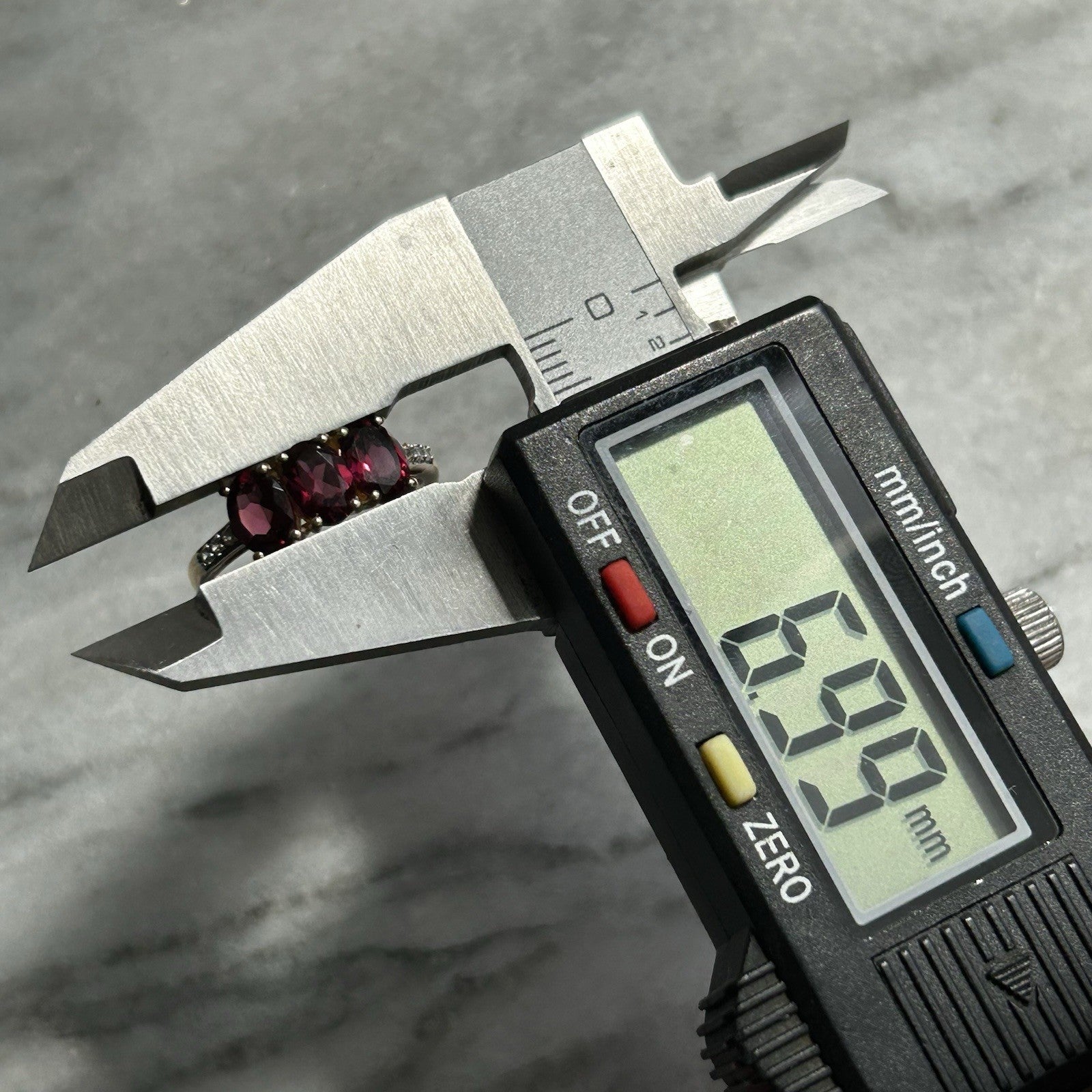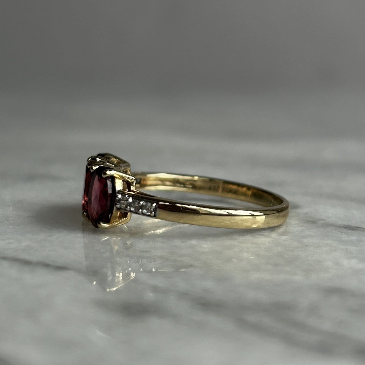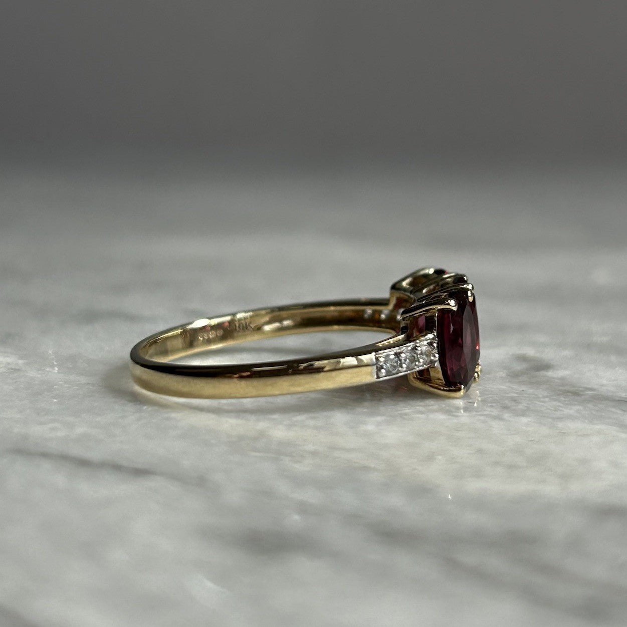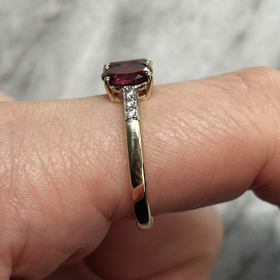 A gorgeous gold ring featuring a trilogy of oval cut rhodolite garnets, flanked by petite pave set white zircon to the shoulders.