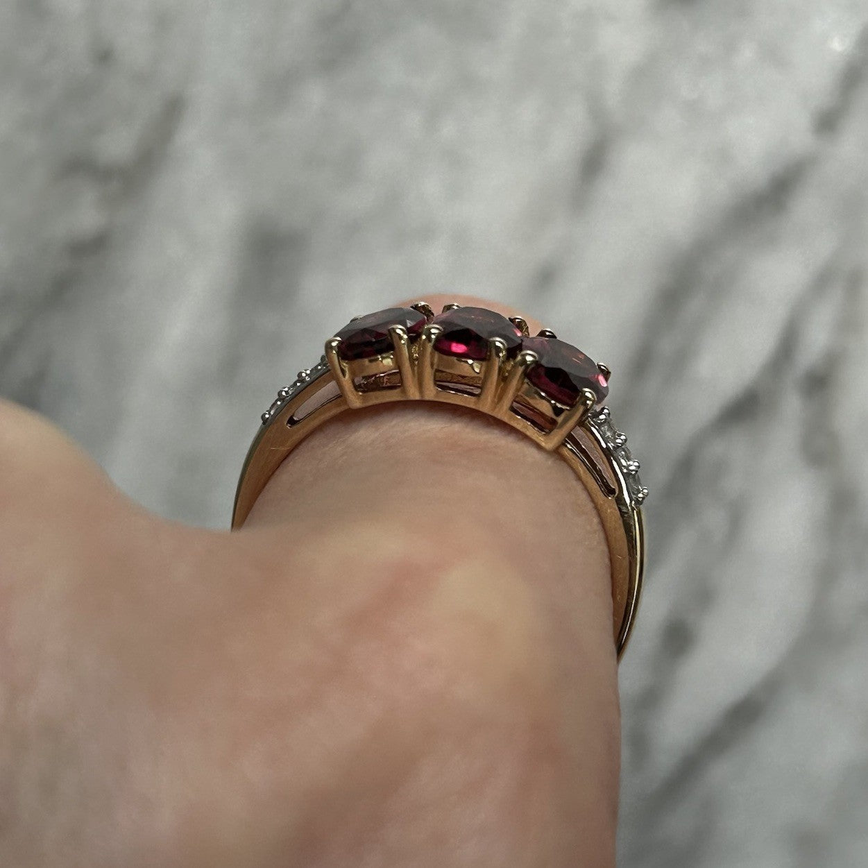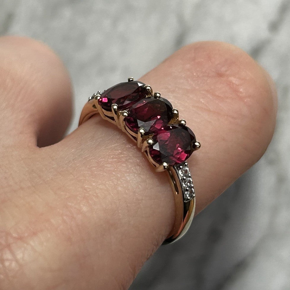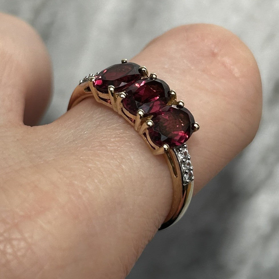 Rhodolite Garnet Trilogy & White Zircon Ring 10ct 10k Yellow Gold - Size R 1/2