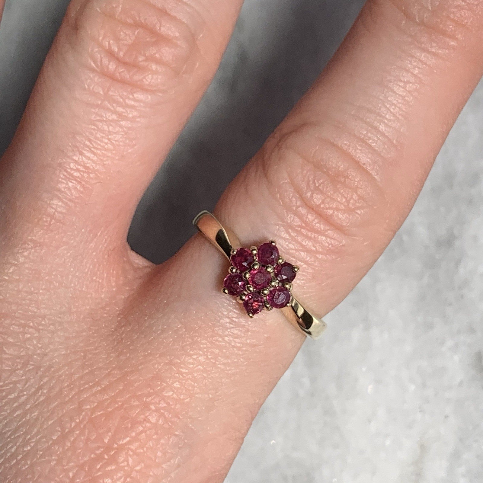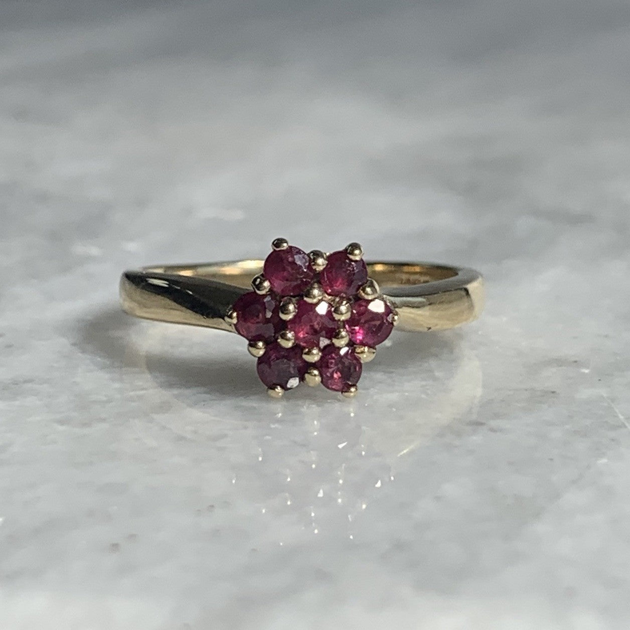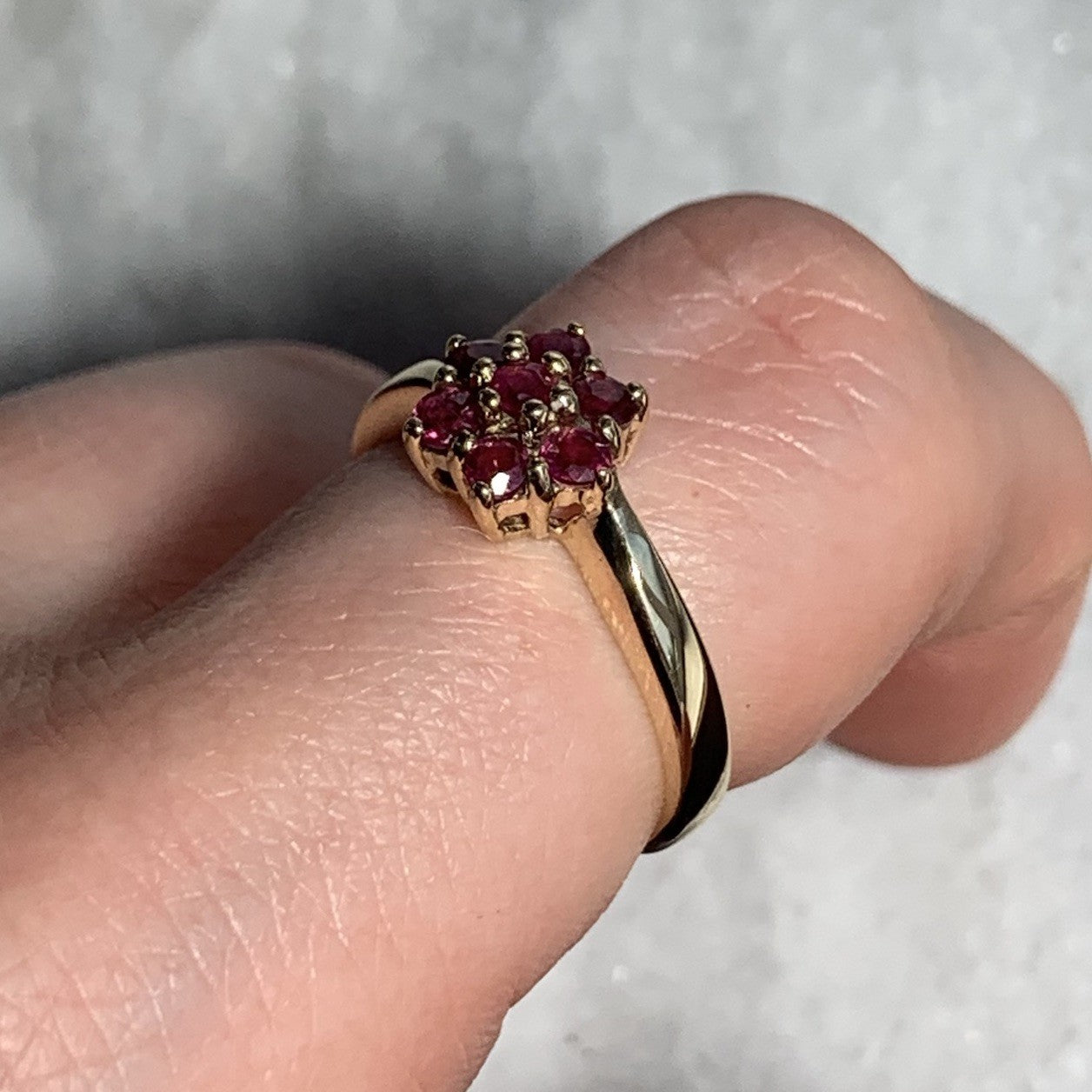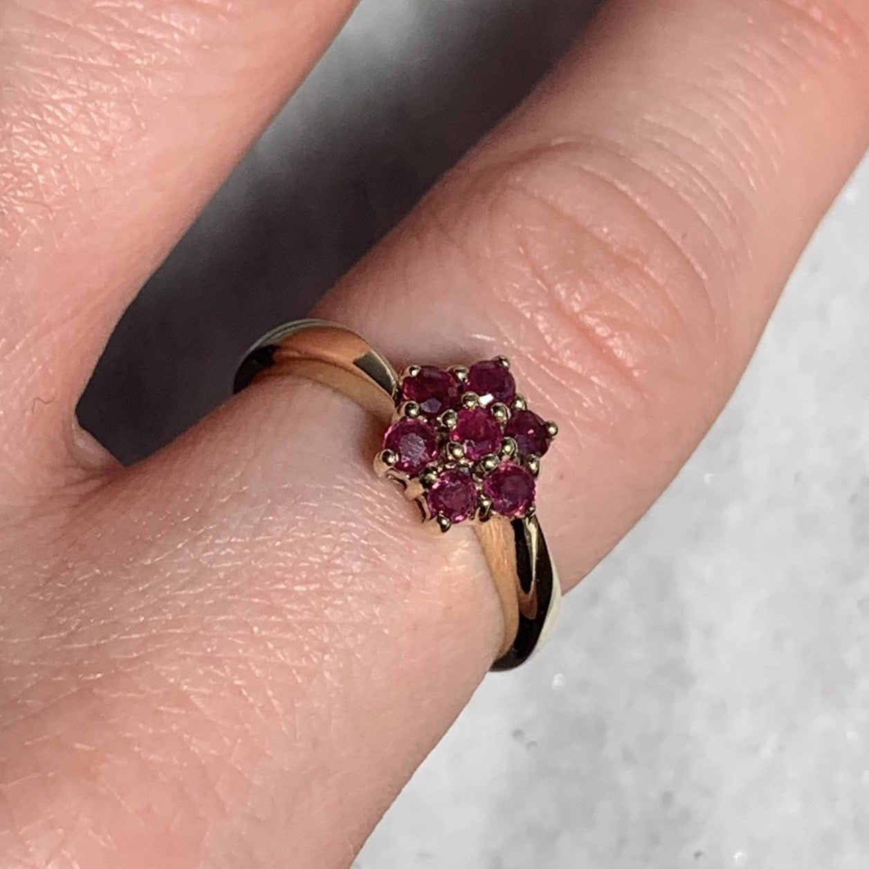 A beautiful gold ring showcasing a daisy flower style cluster of rubies.