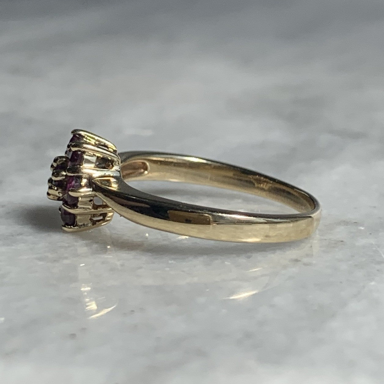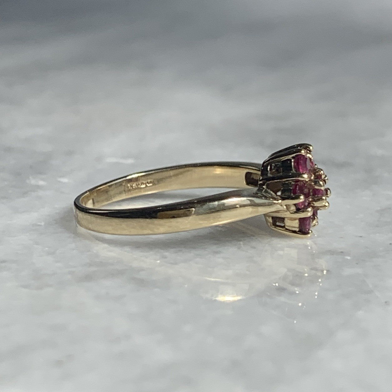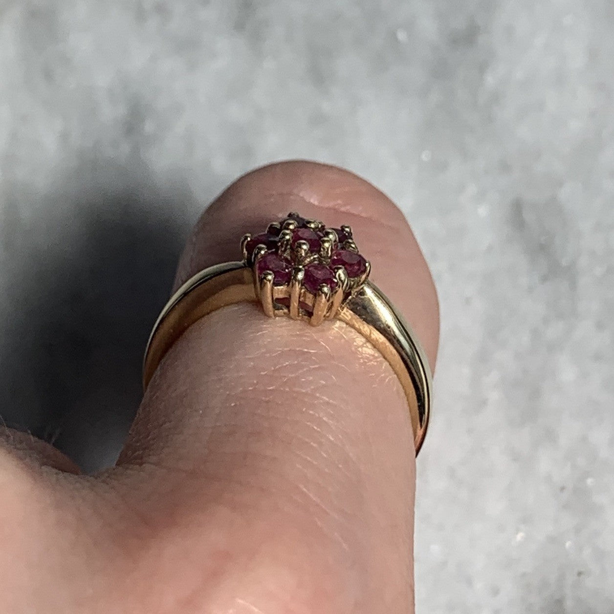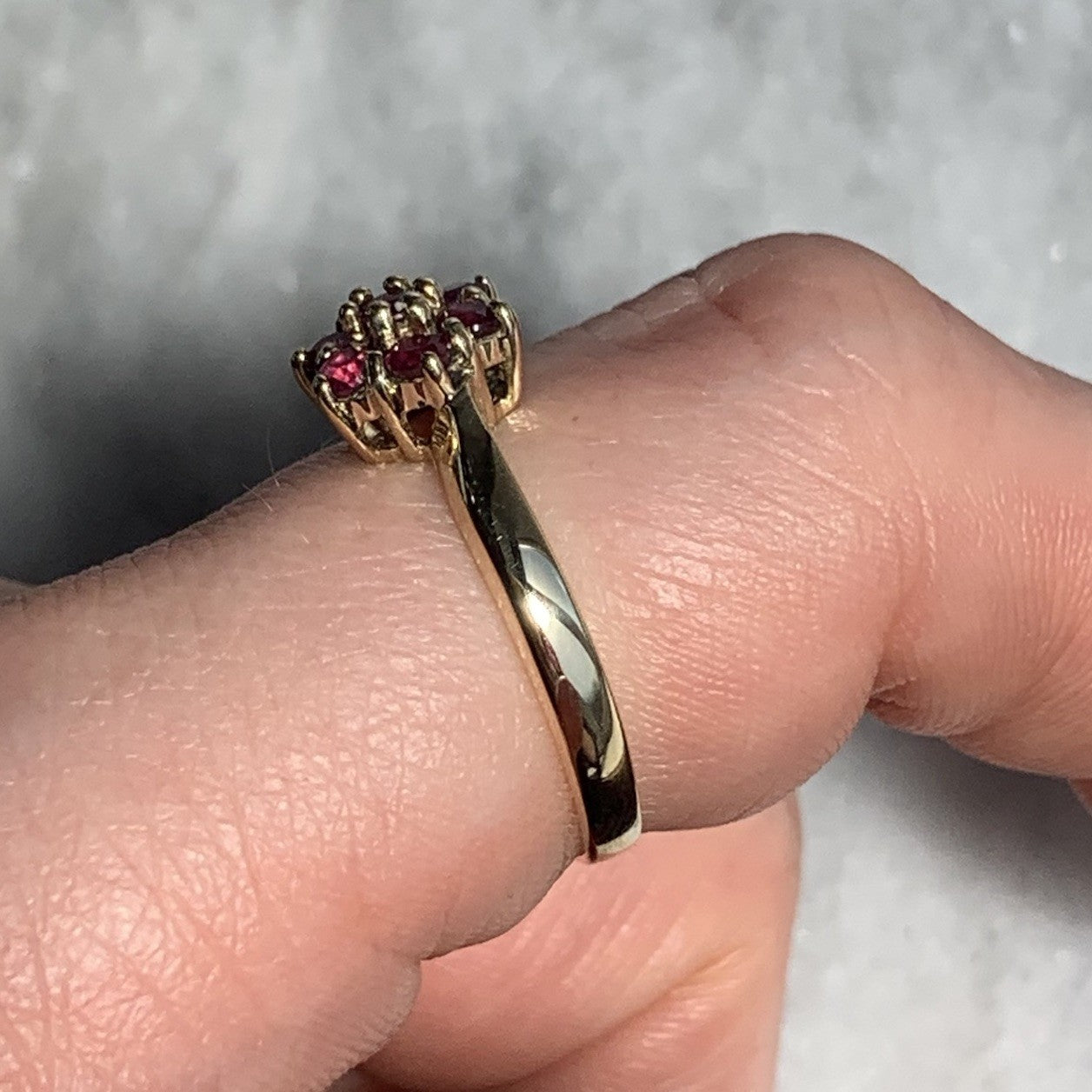 A beautiful gold ring showcasing a daisy flower style cluster of rubies.