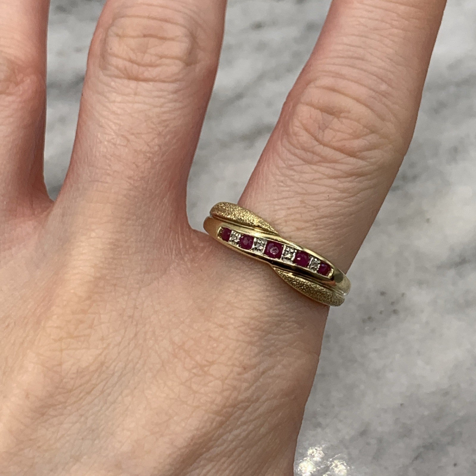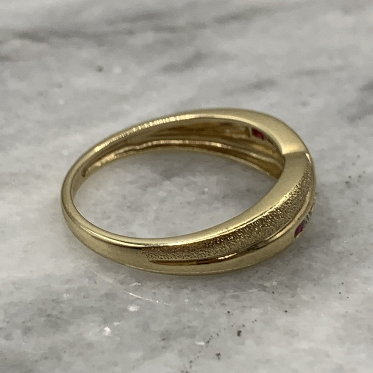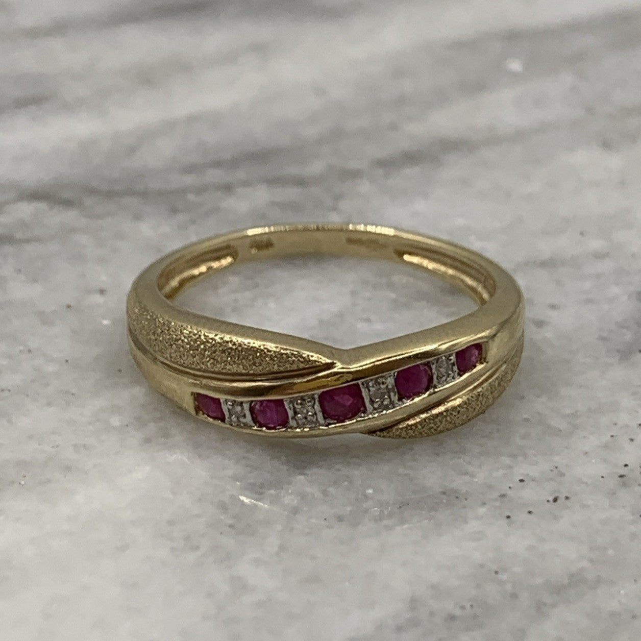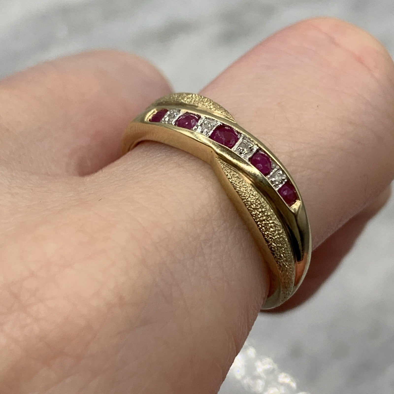 A beautiful gold crossover style band ring featuring alternating rubies and diamonds.