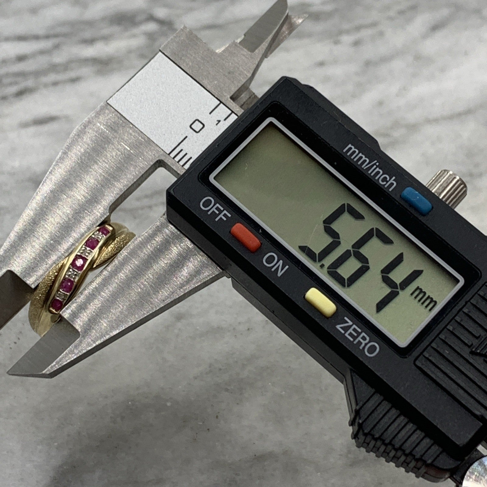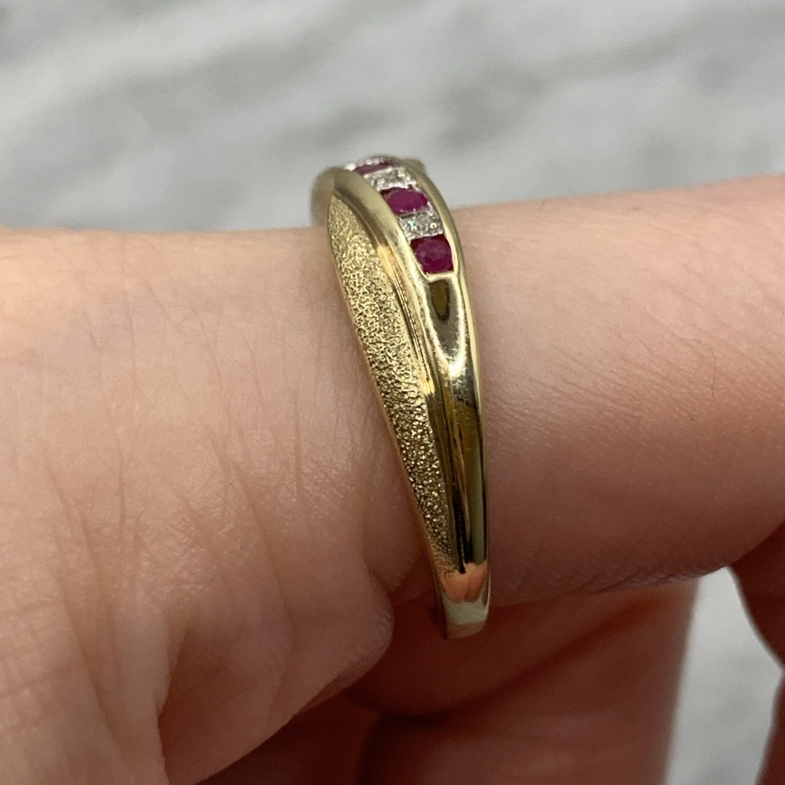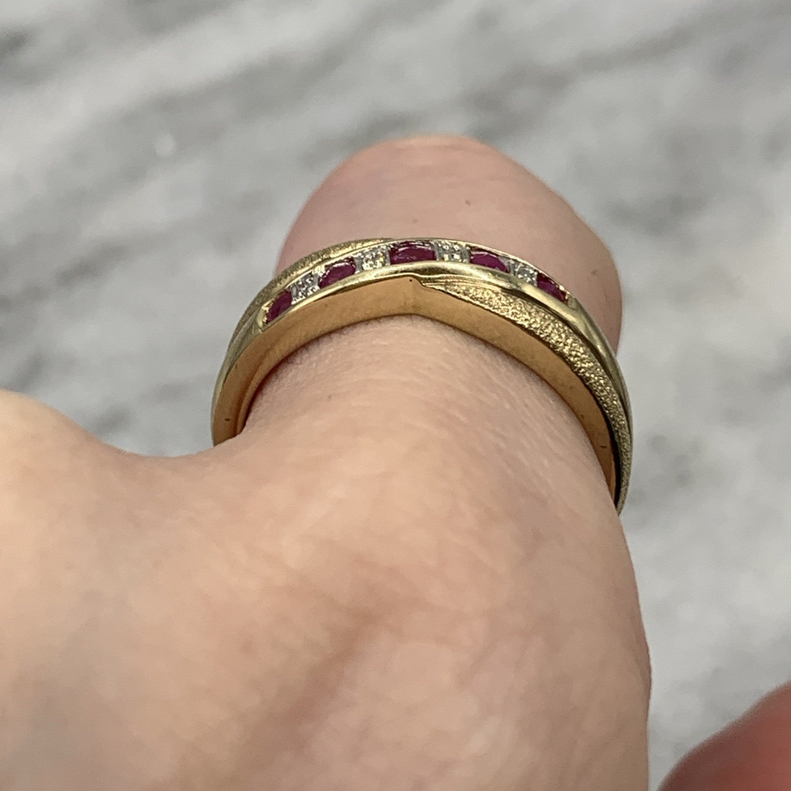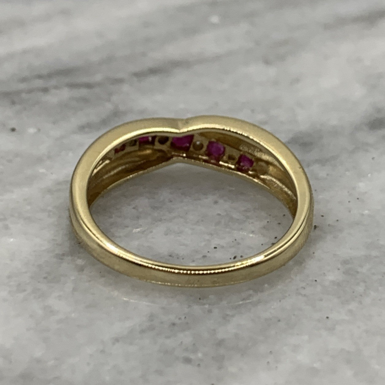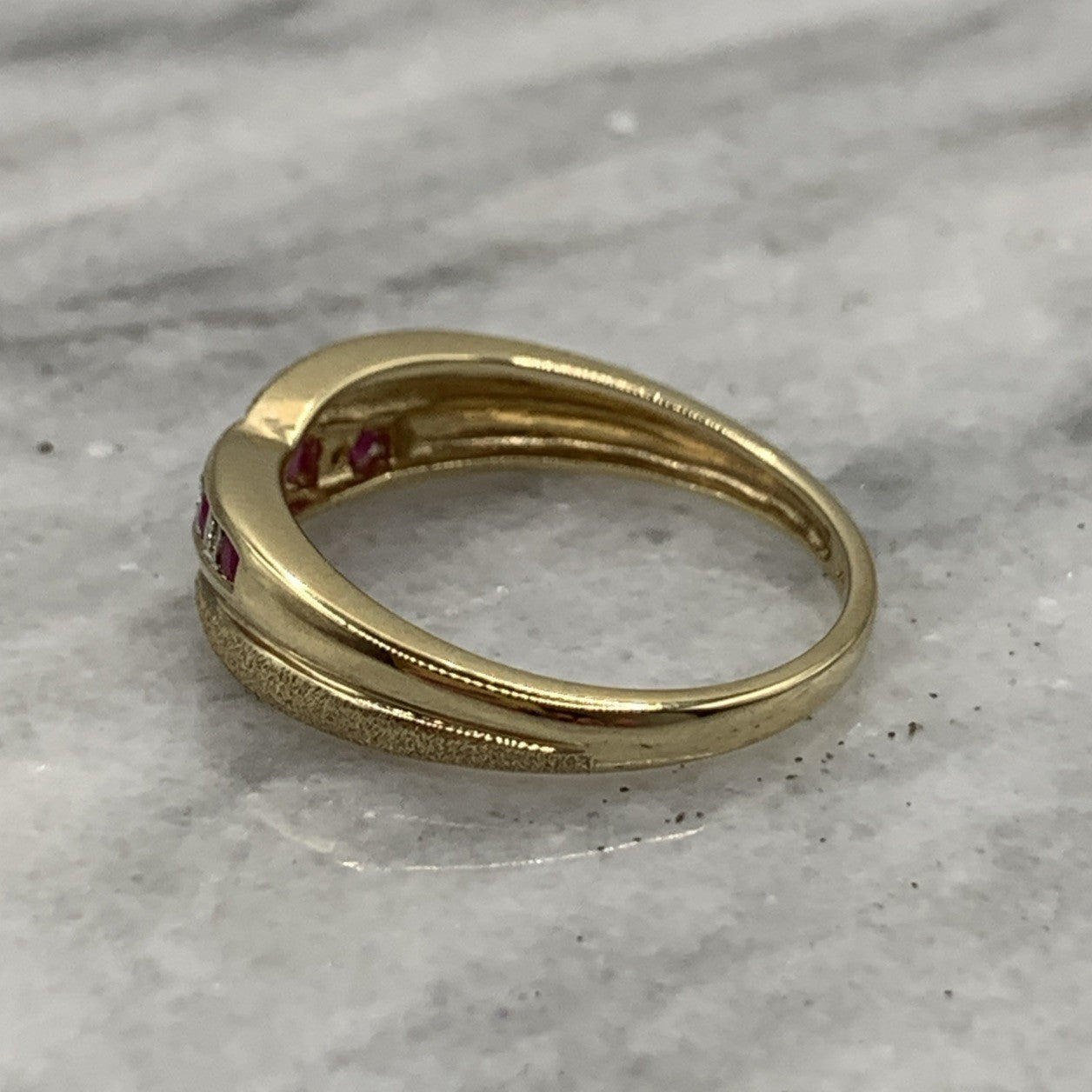 A beautiful gold crossover style band ring featuring alternating rubies and diamonds.