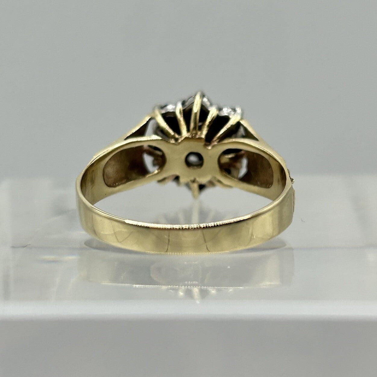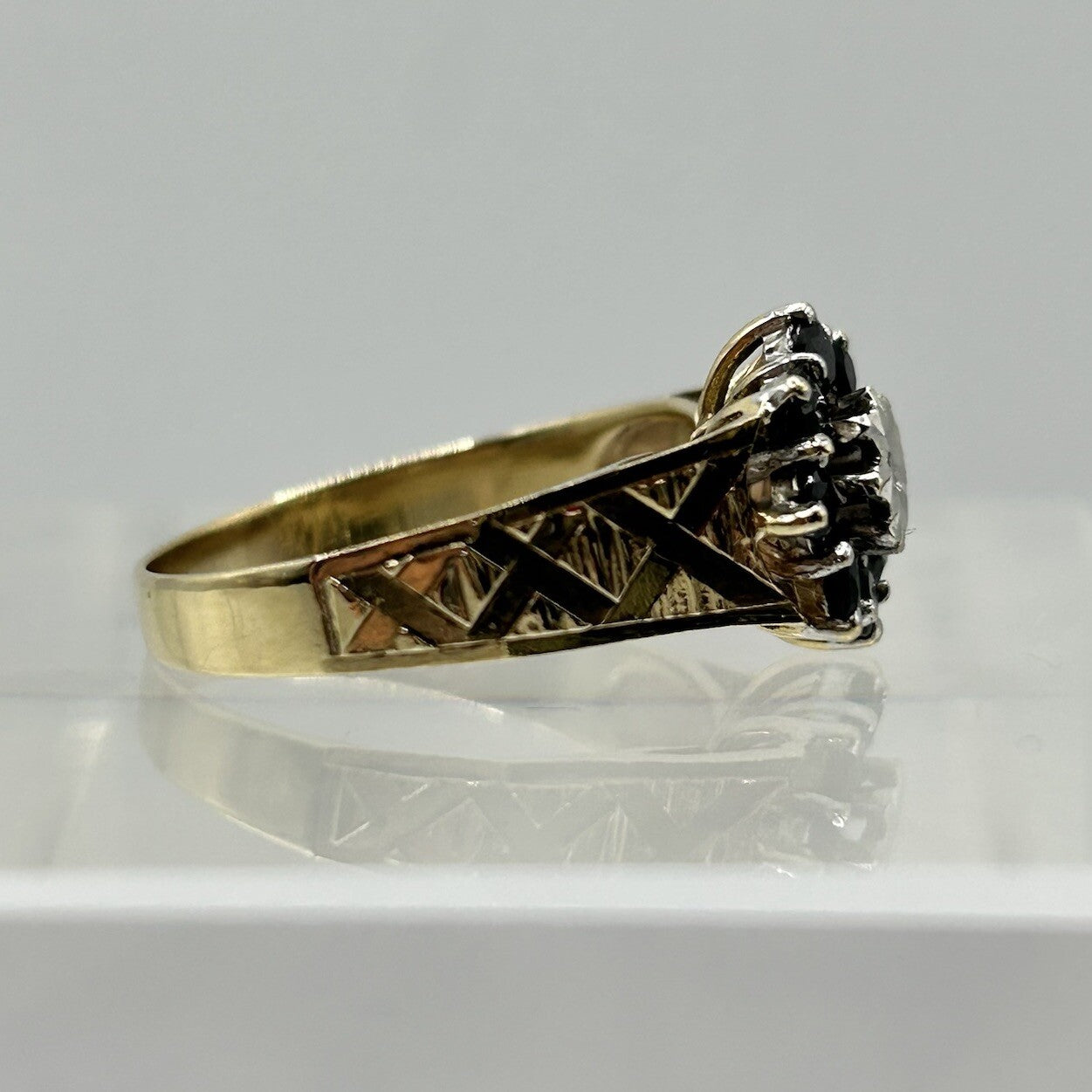 A beautifully crafted gold ring showcasing a petite illusion set diamond, clustered in the daisy flower style with sapphires upon textured antique style shoulders.