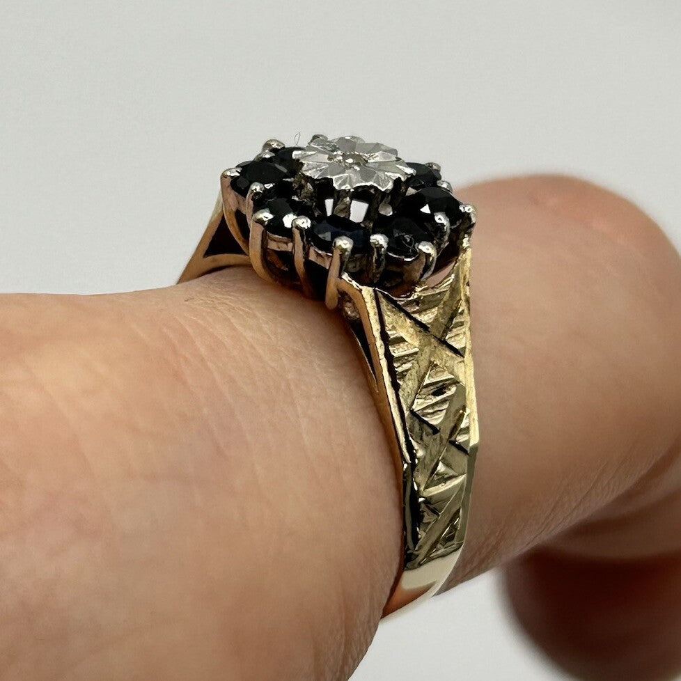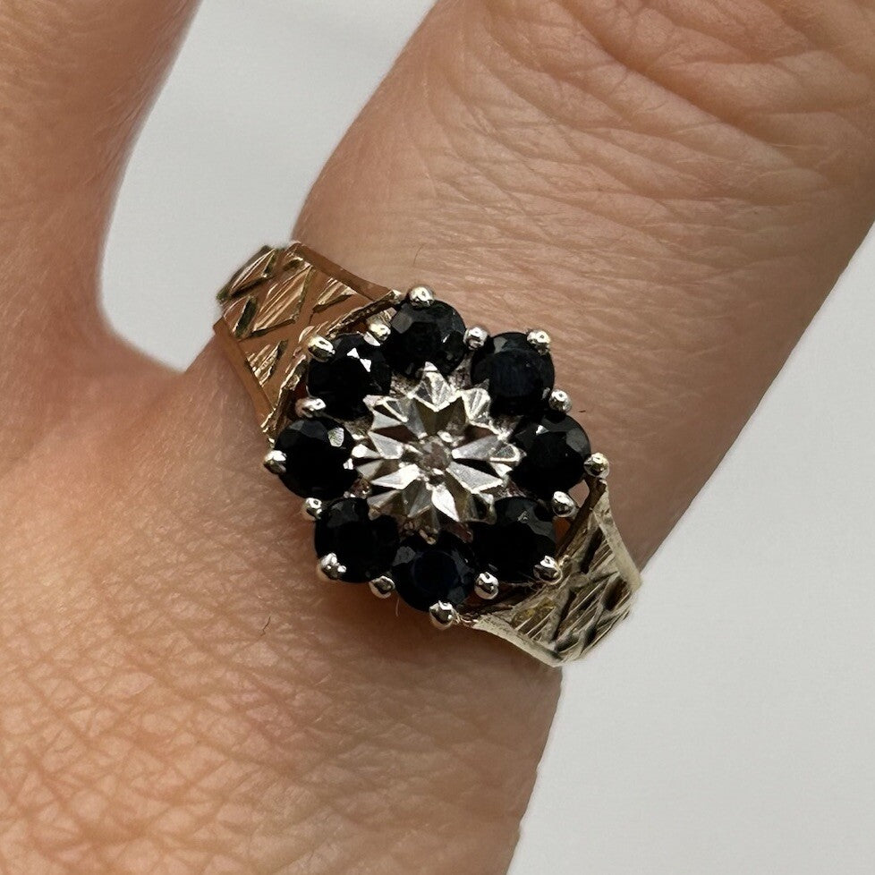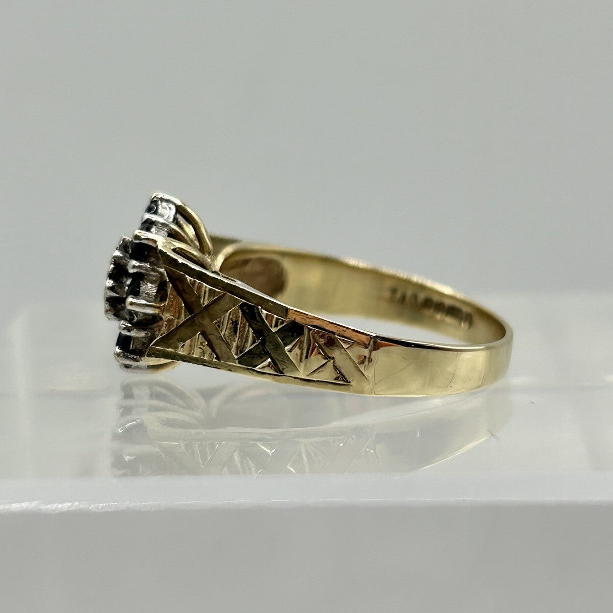 Sapphire & Diamond 9 ct Ring - Daisy Flower Cluster Textured Yellow Gold- Size Q