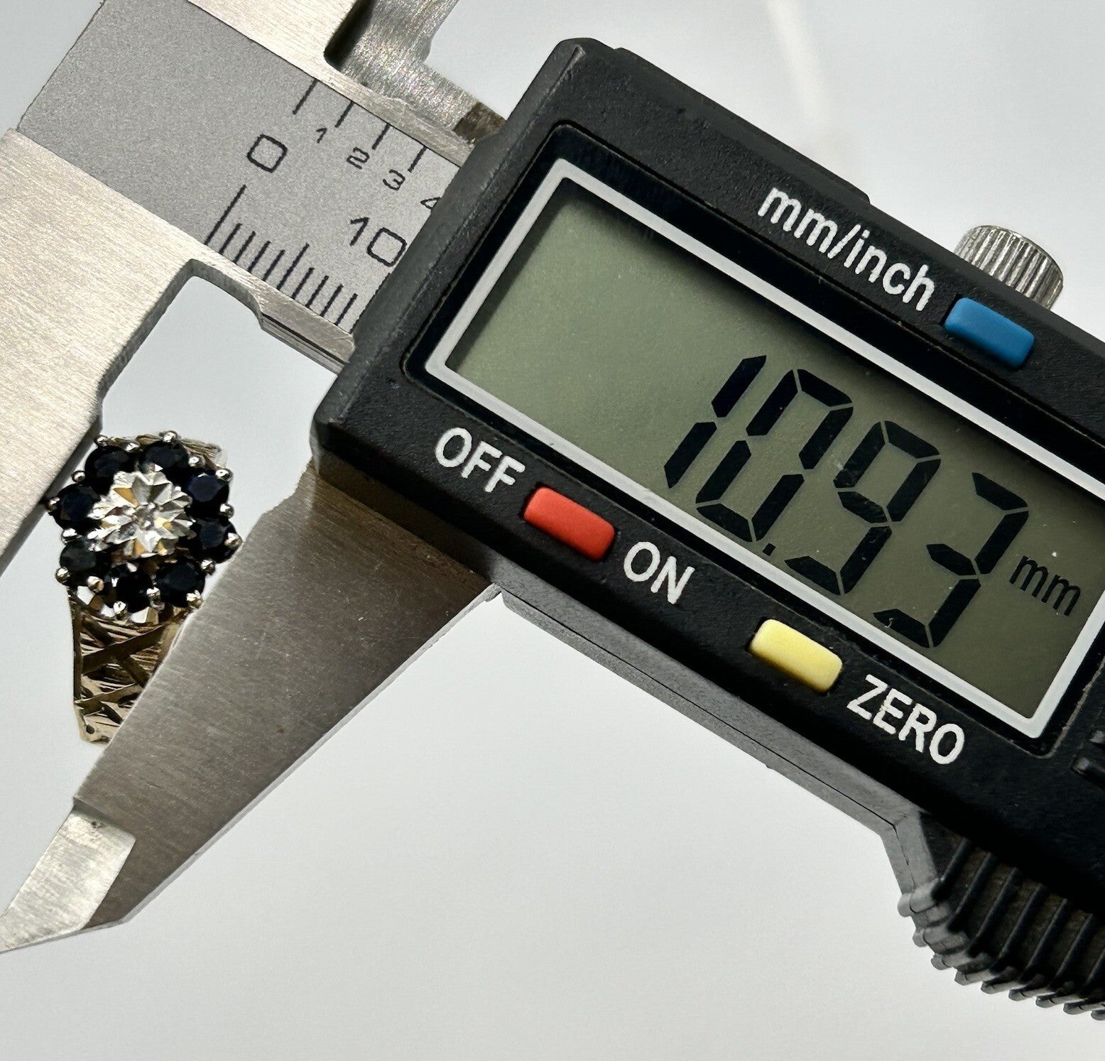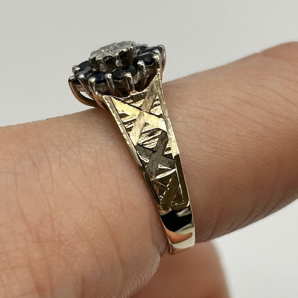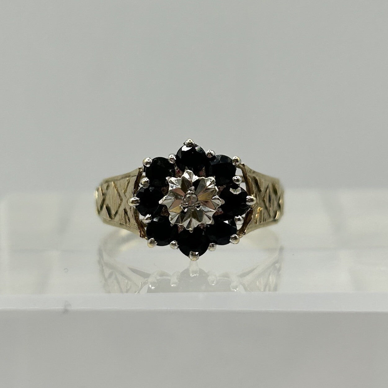 Sapphire & Diamond 9 ct Ring - Daisy Flower Cluster Textured Yellow Gold- Size Q