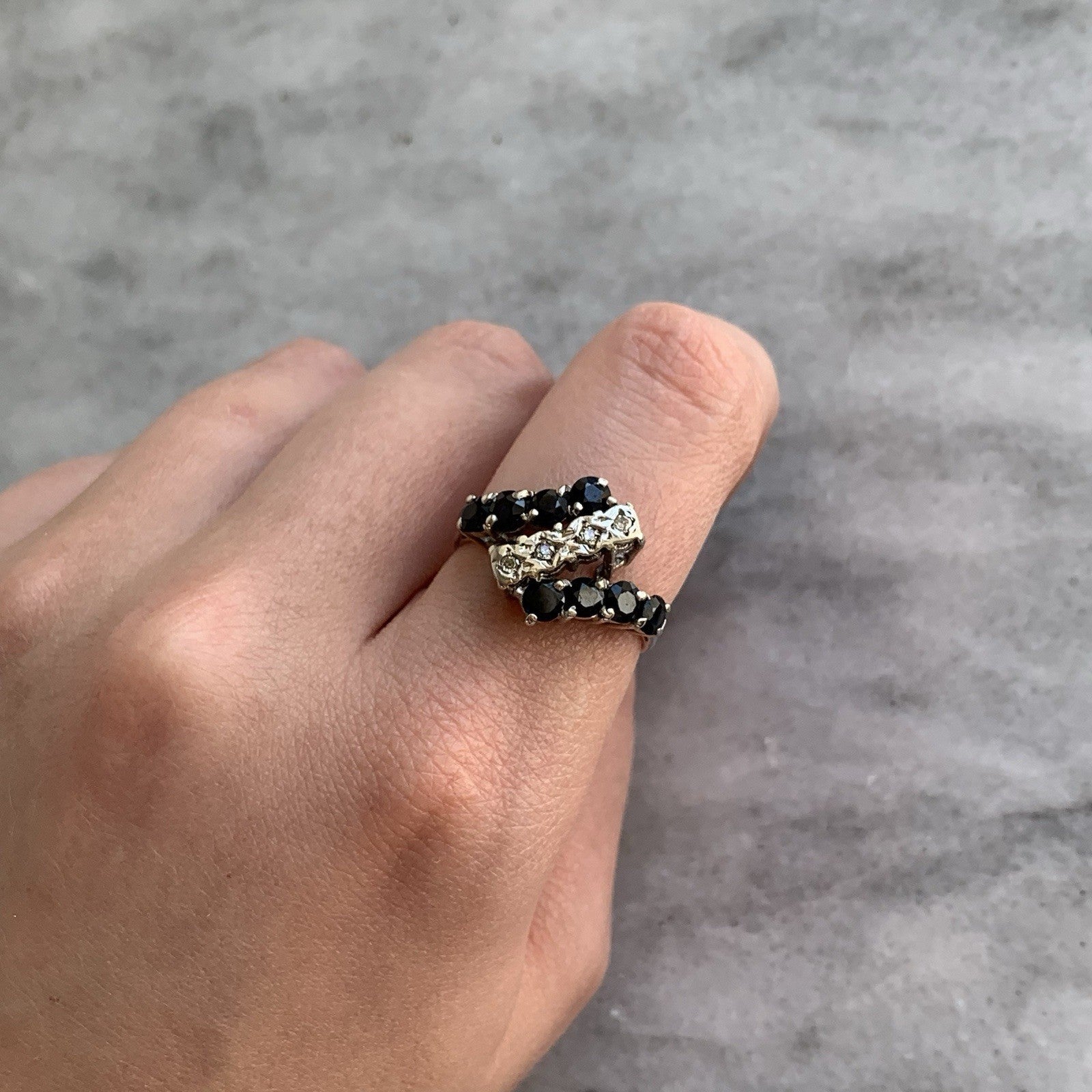 A beautiful twisting zigzag ring featuring sapphire gemstones and natural diamonds.
