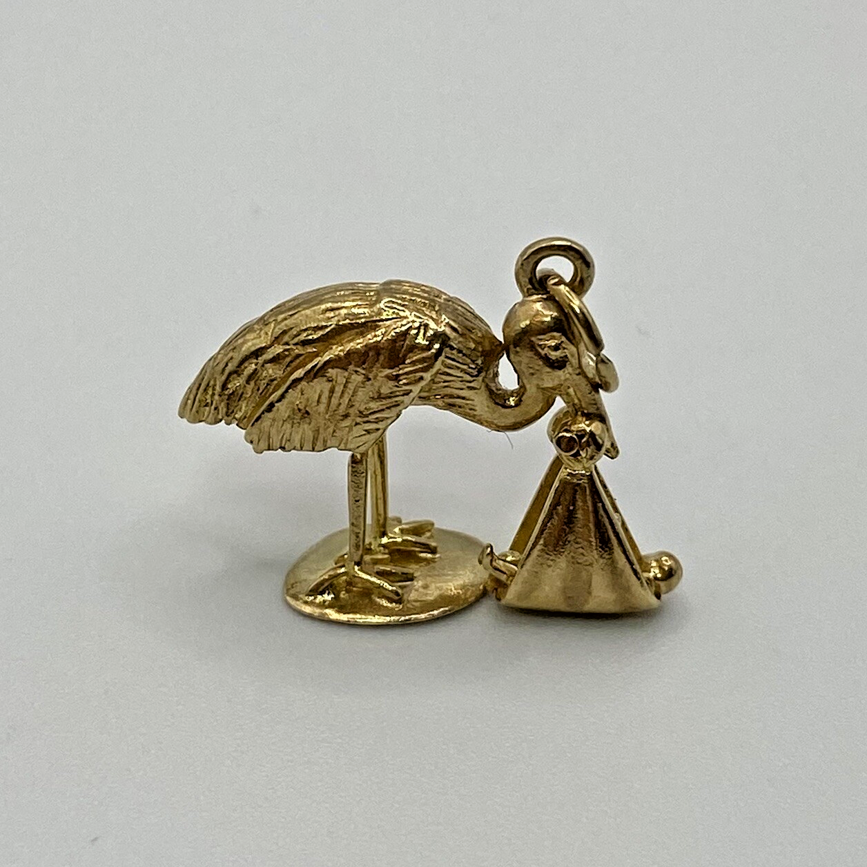 A lovely sentimental gold pendant in the shape of a stork bird carrying a new born baby.