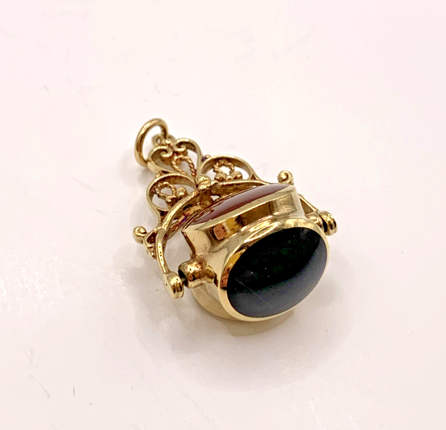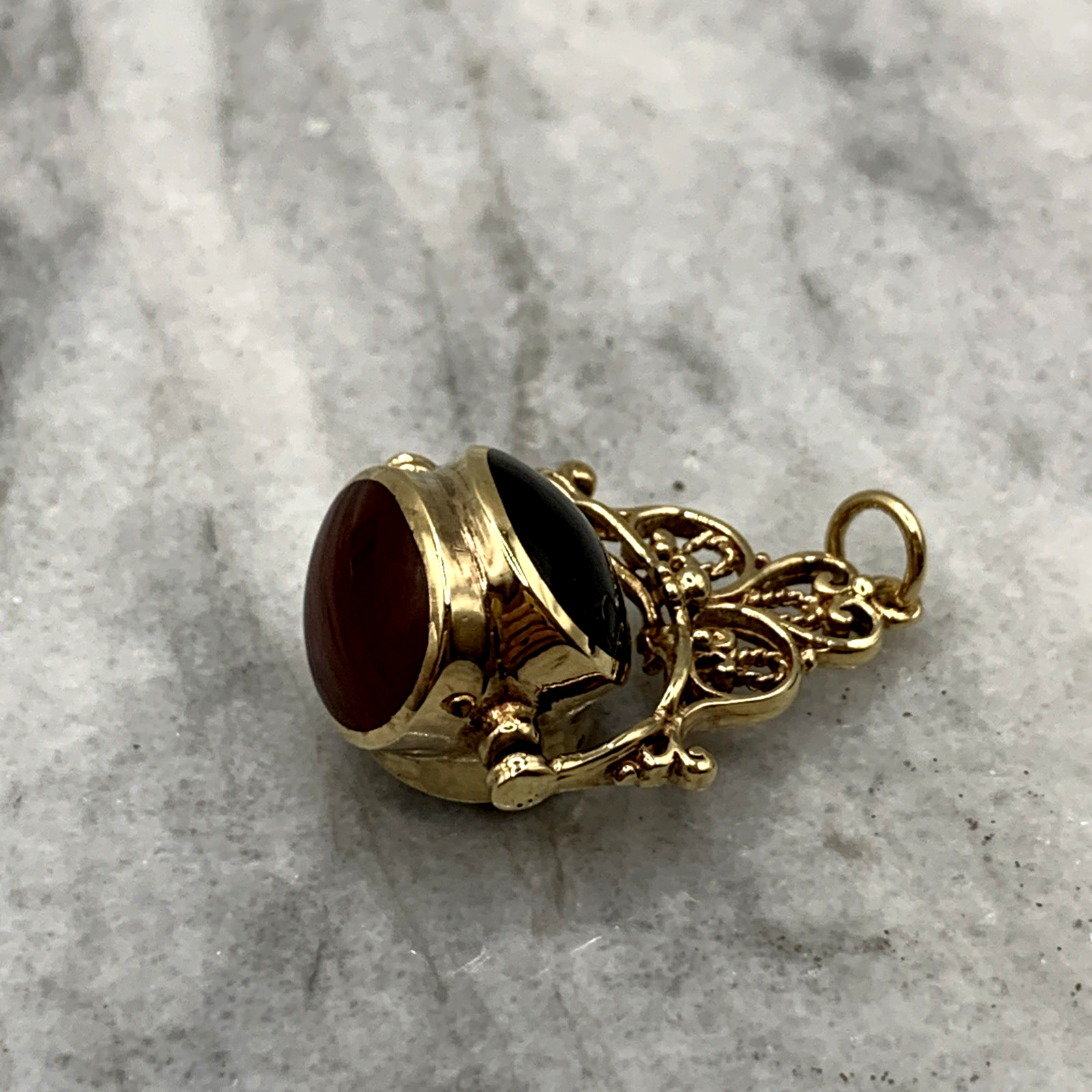 A beautifully crafted Victorian style swivel fob pendant featuring bezel set pieces of onyx, carnelian and bloodstone.