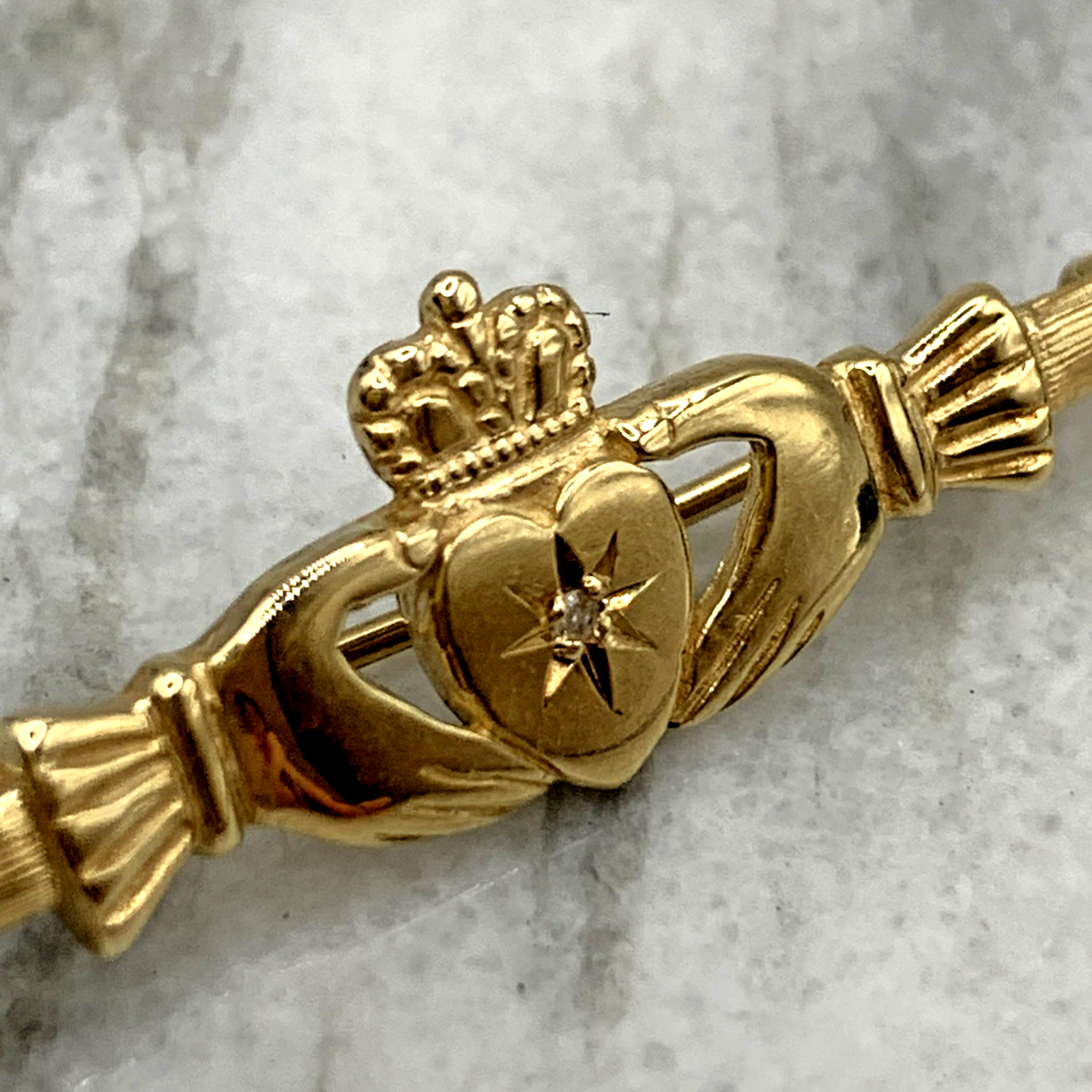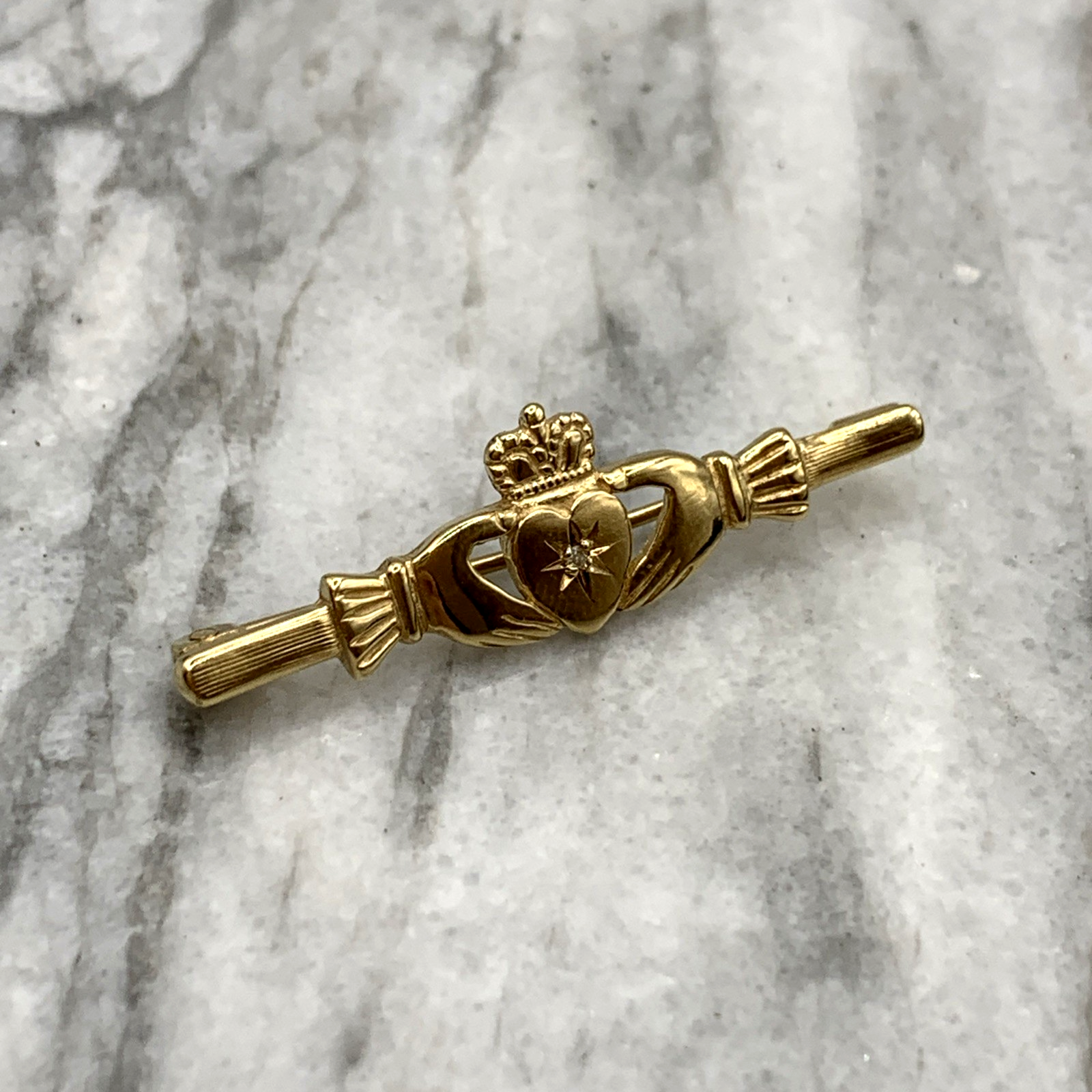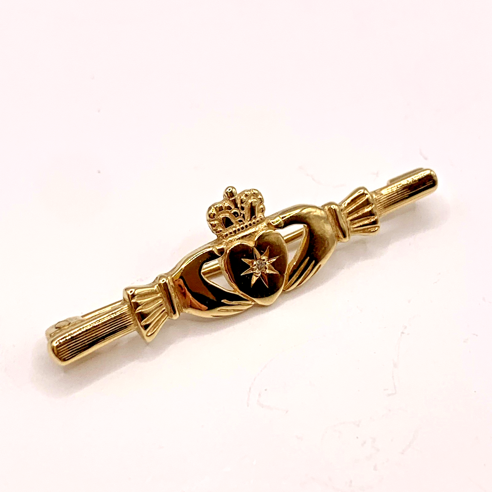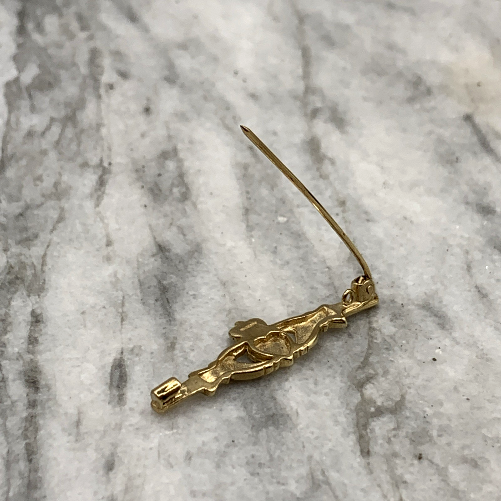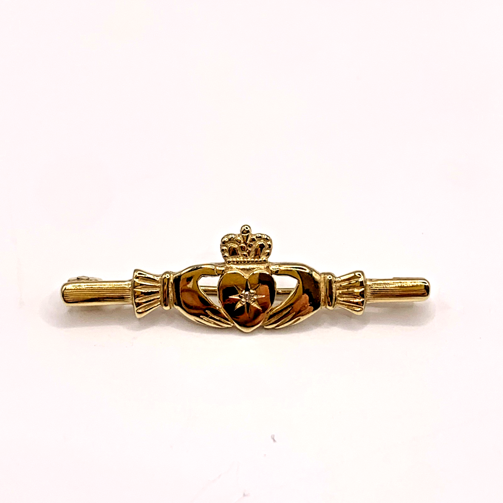 A timeless gold Irish claddagh brooch featuring a petite flush set diamond. Safety pin back.
