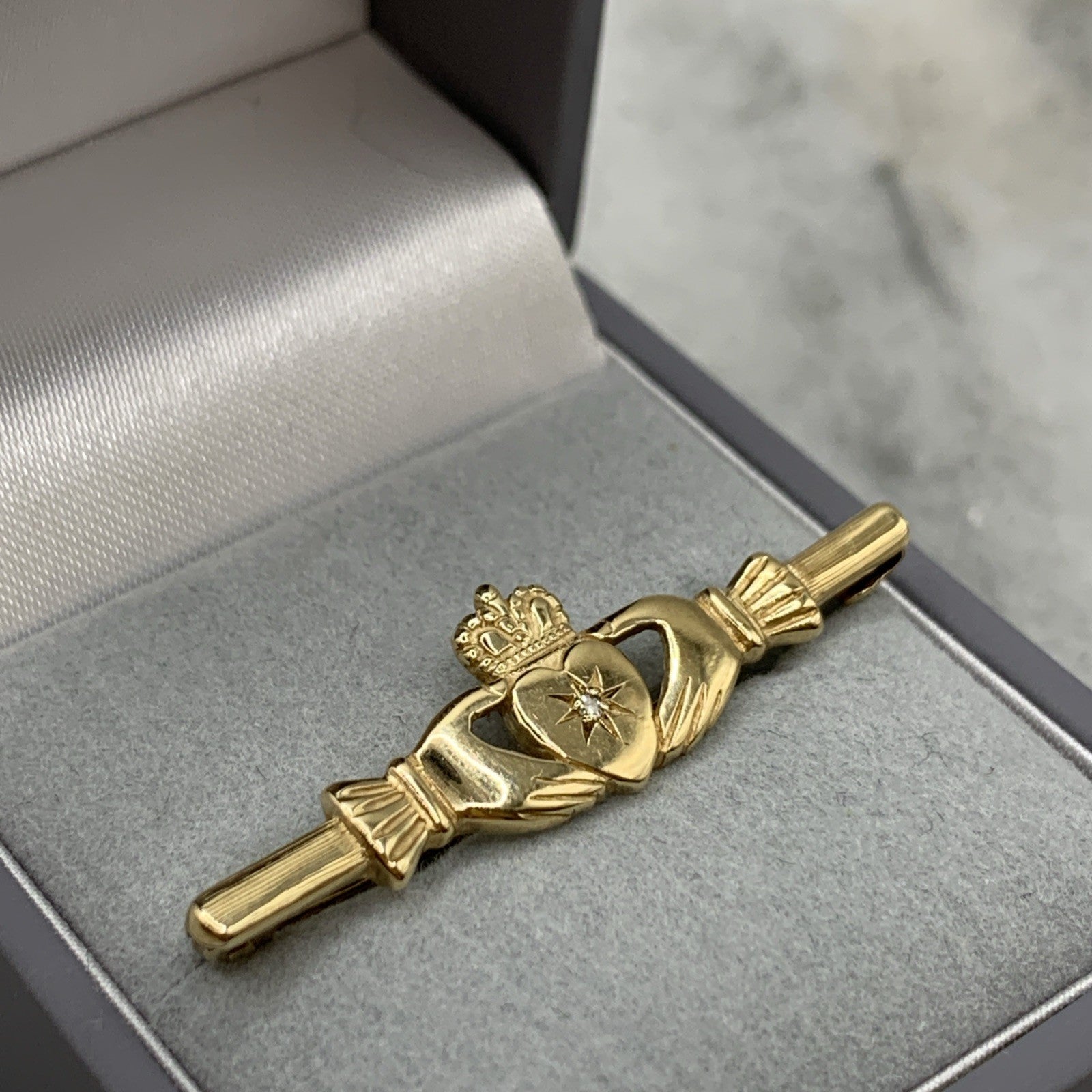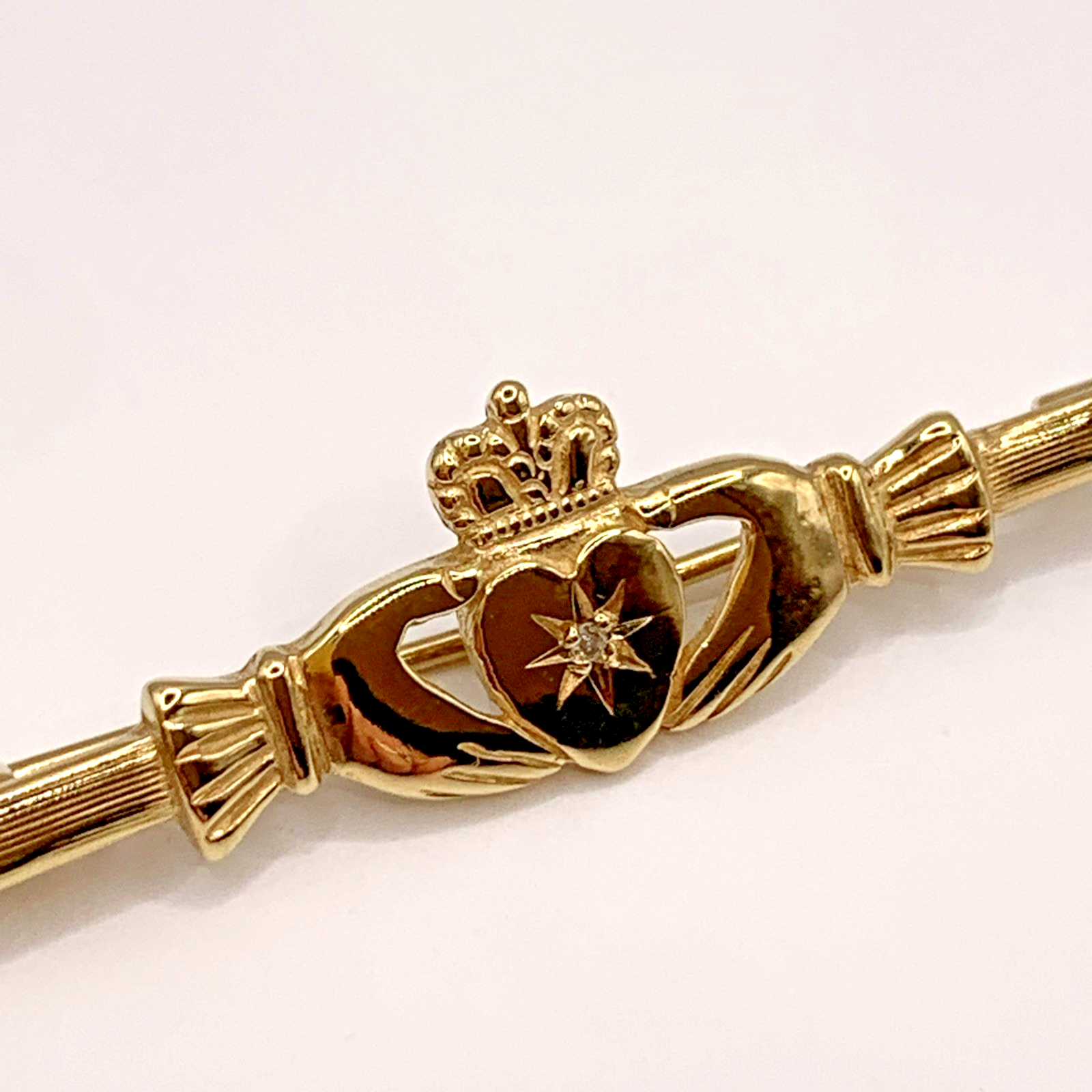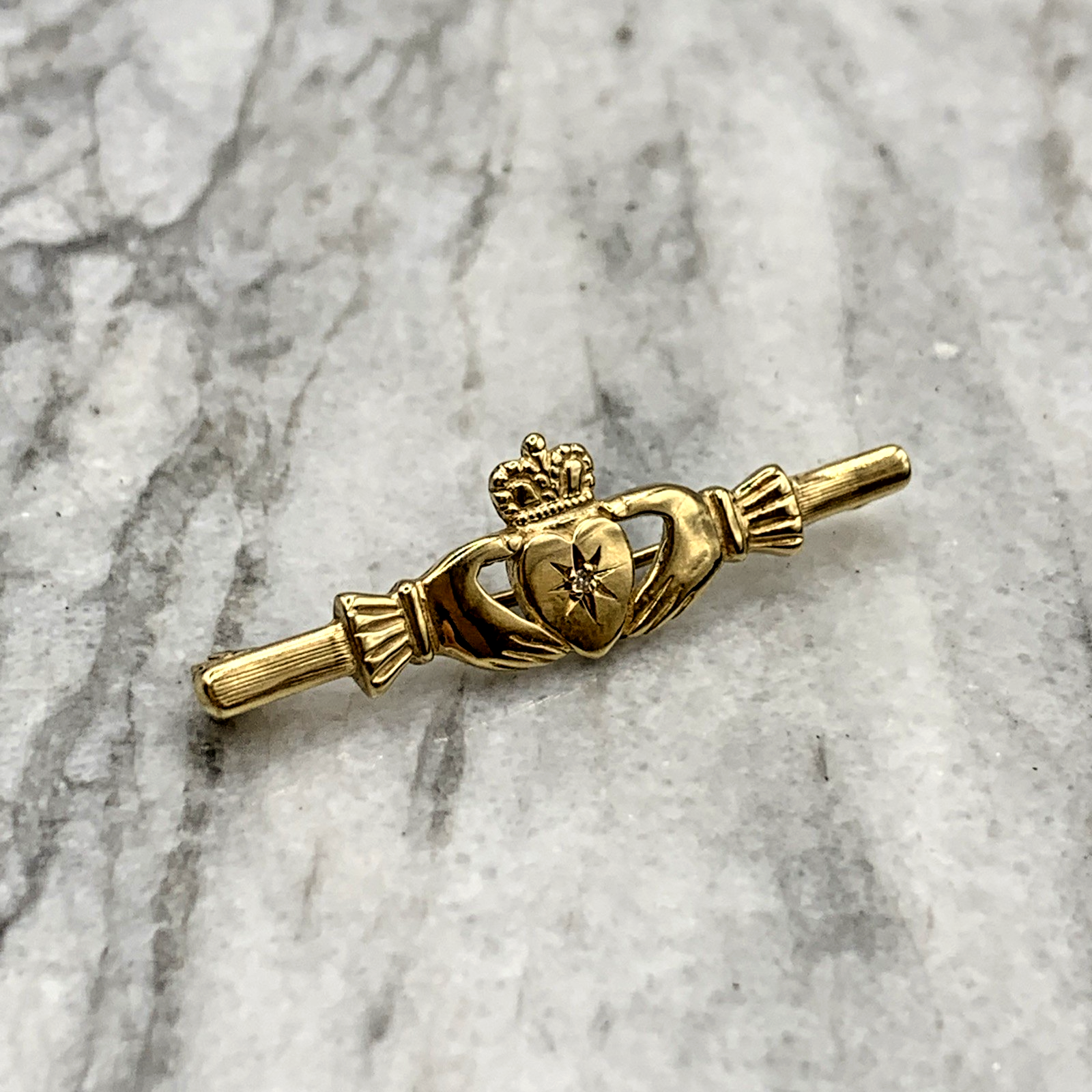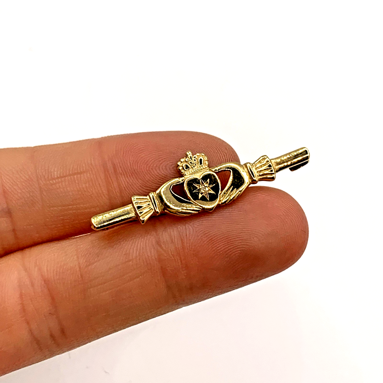 A timeless gold Irish claddagh brooch featuring a petite flush set diamond. Safety pin back.