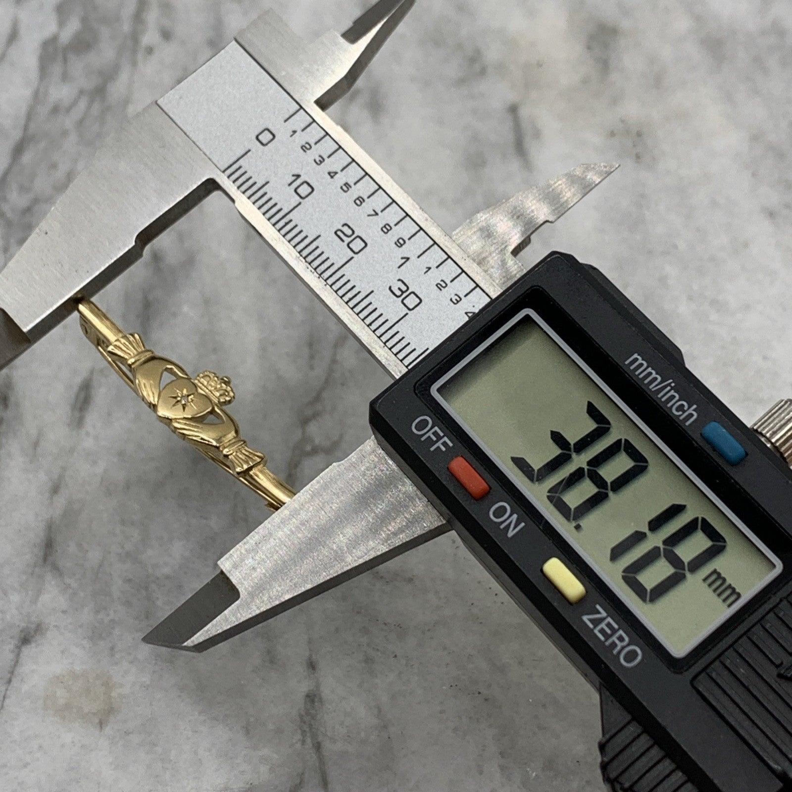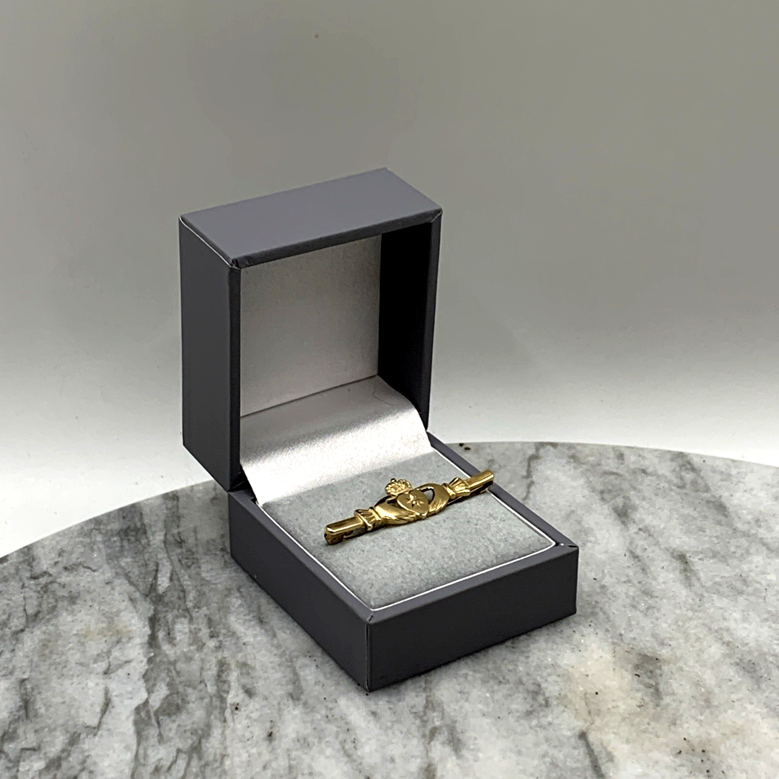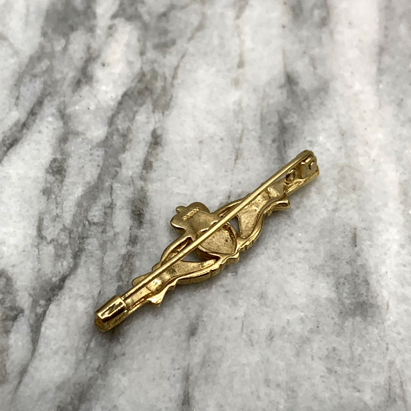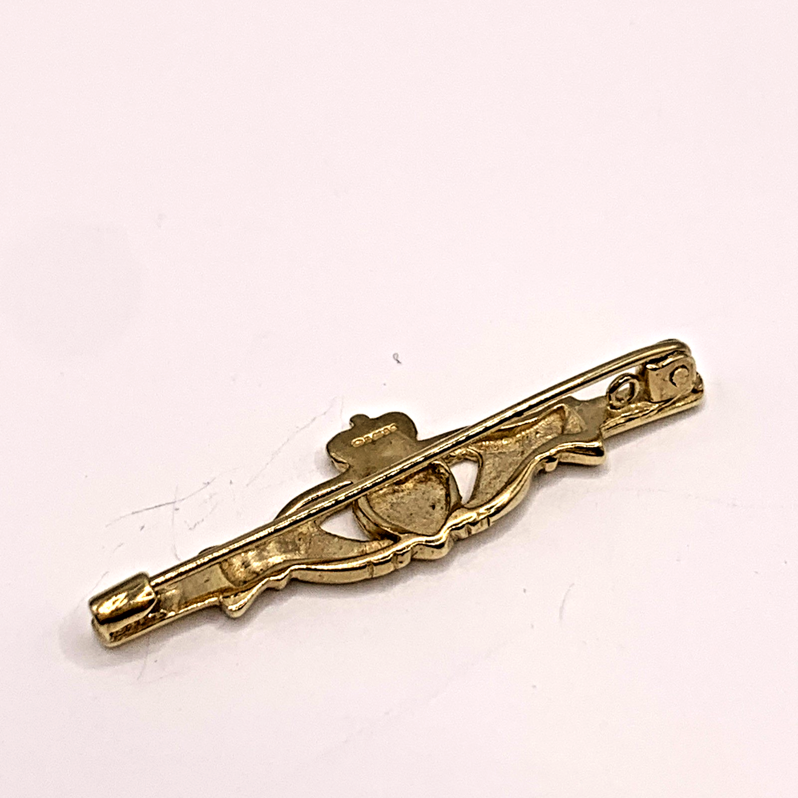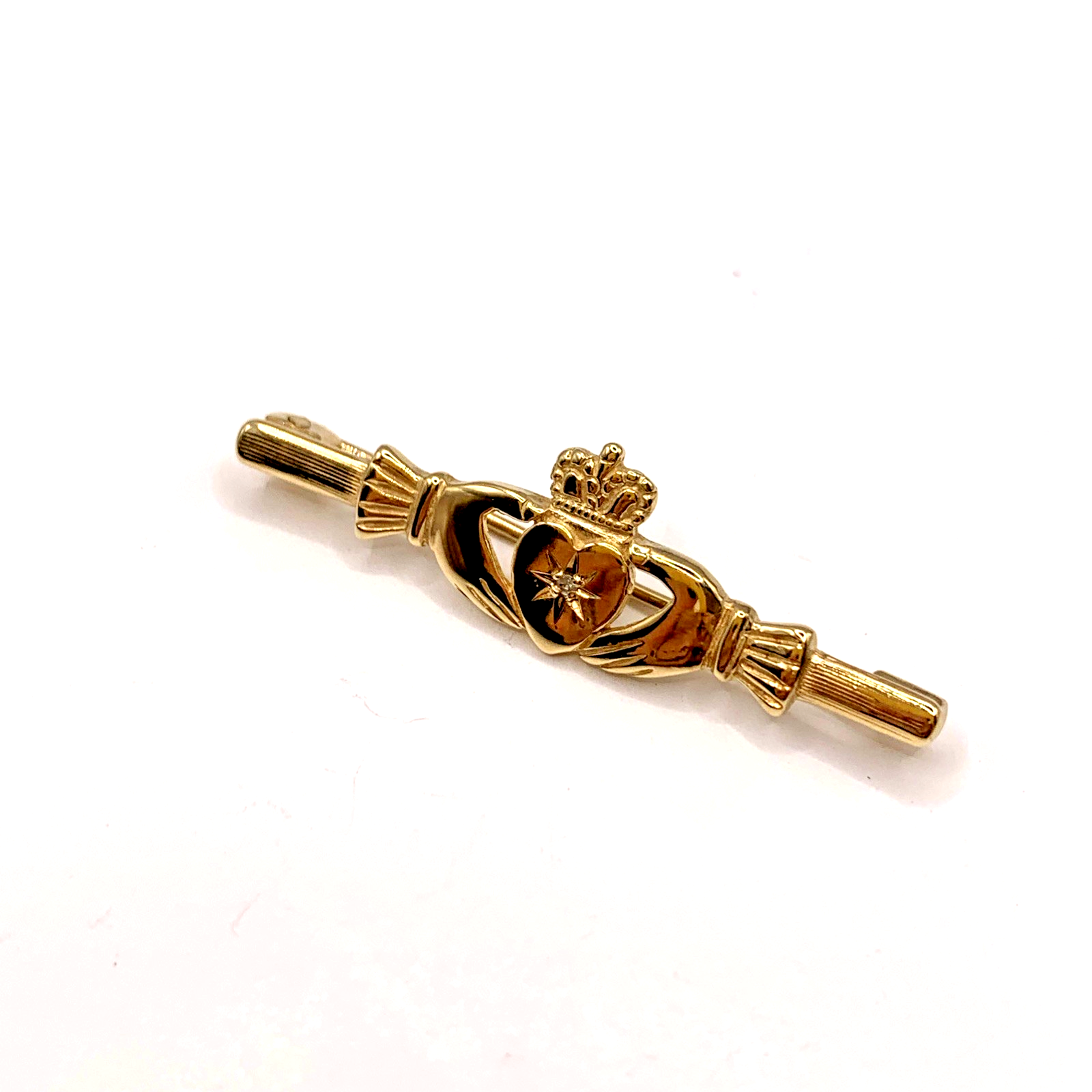 A timeless gold Irish claddagh brooch featuring a petite flush set diamond. Safety pin back.