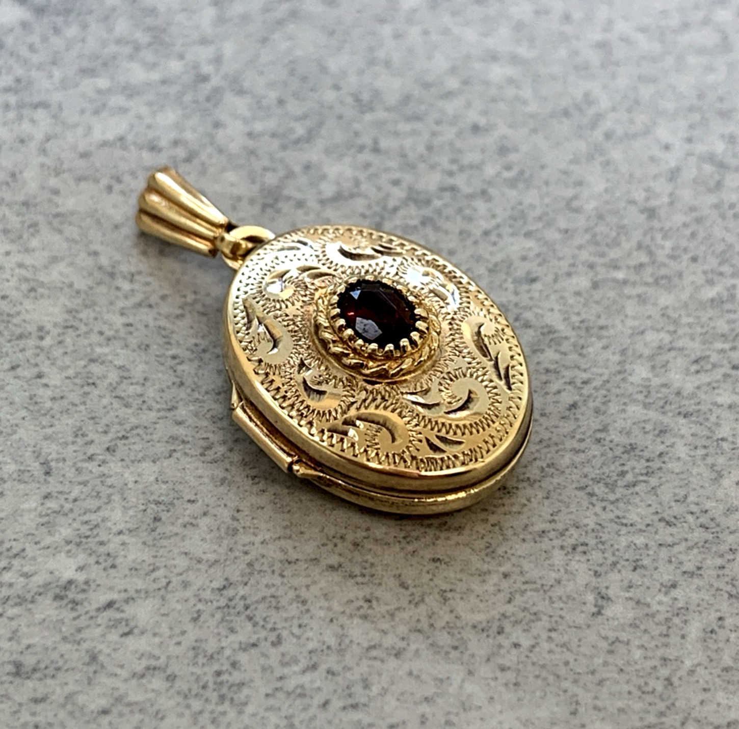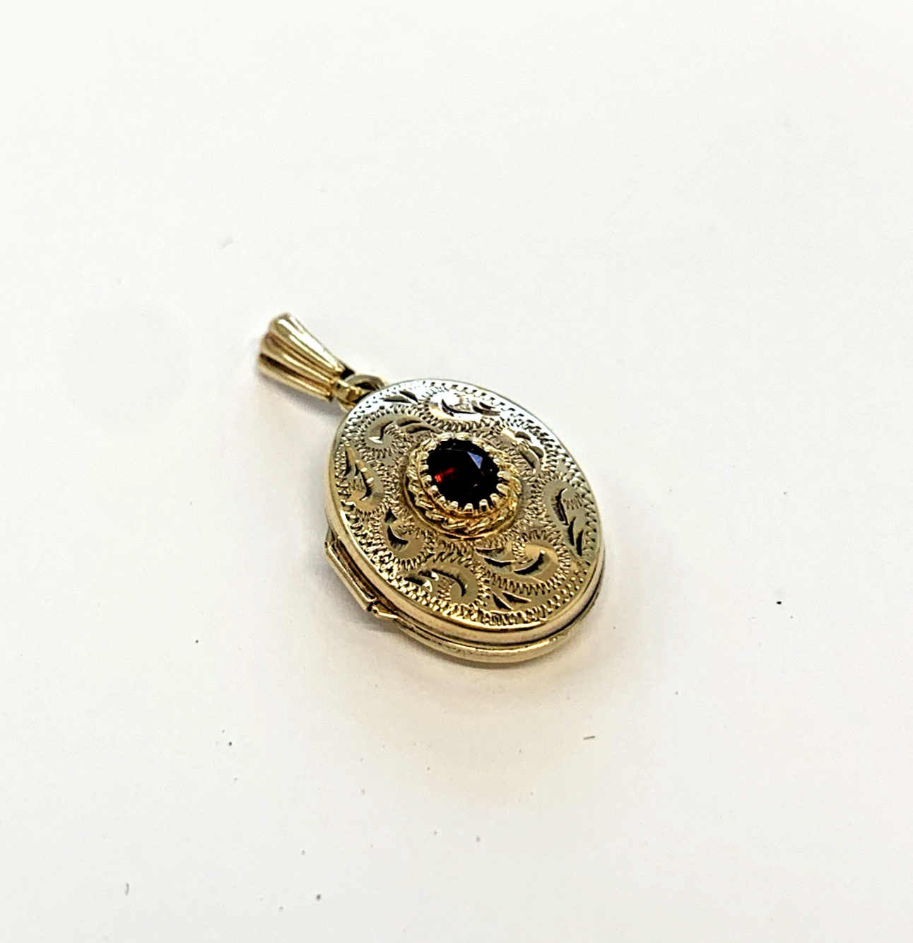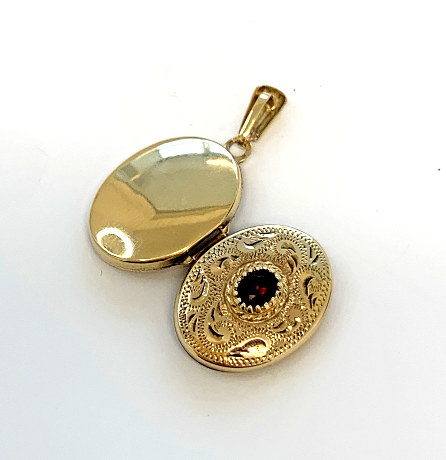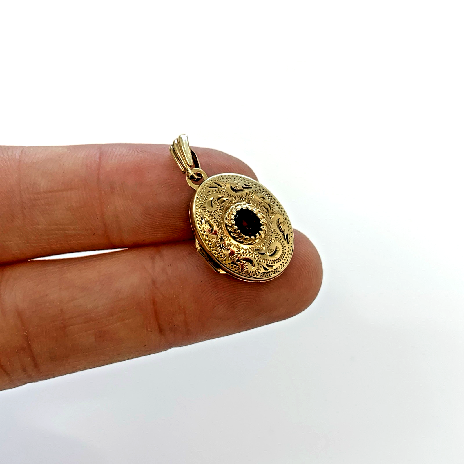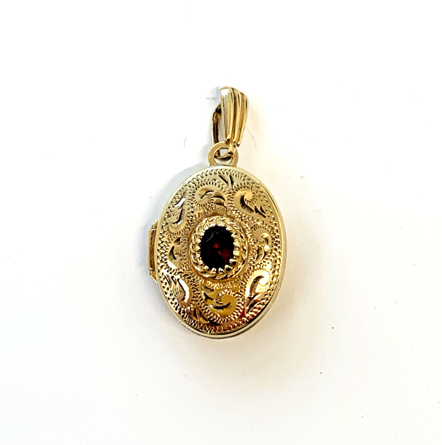 A gorgeous gold oval locket pendant showcasing a bezel set solitaire garnet accented by a rope edge and baroque style patterns.