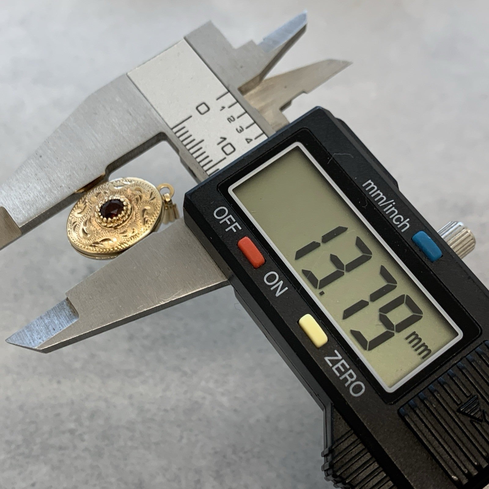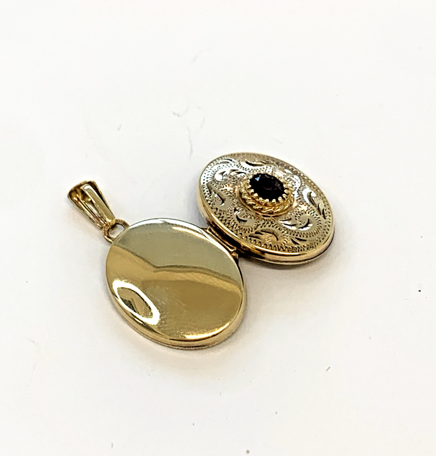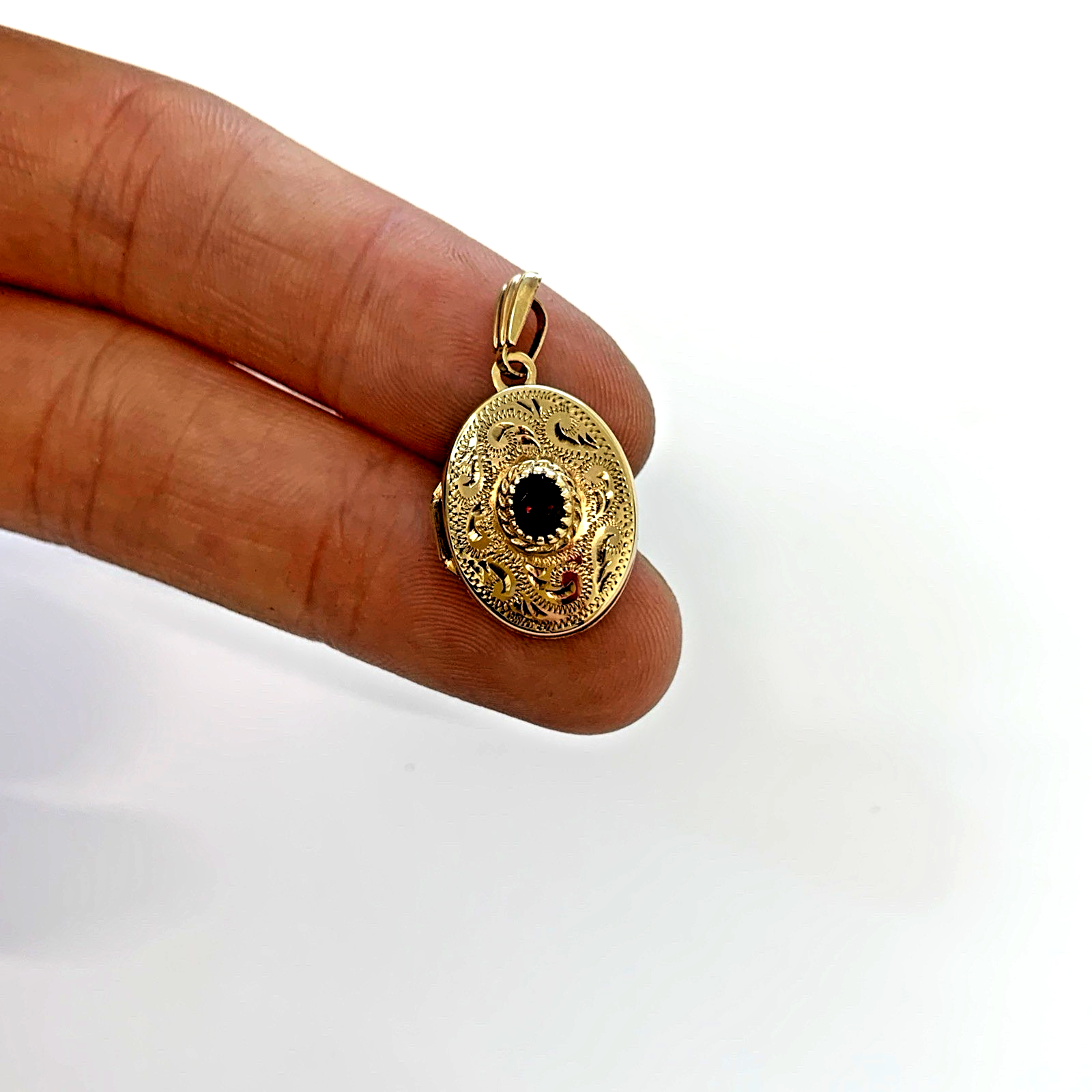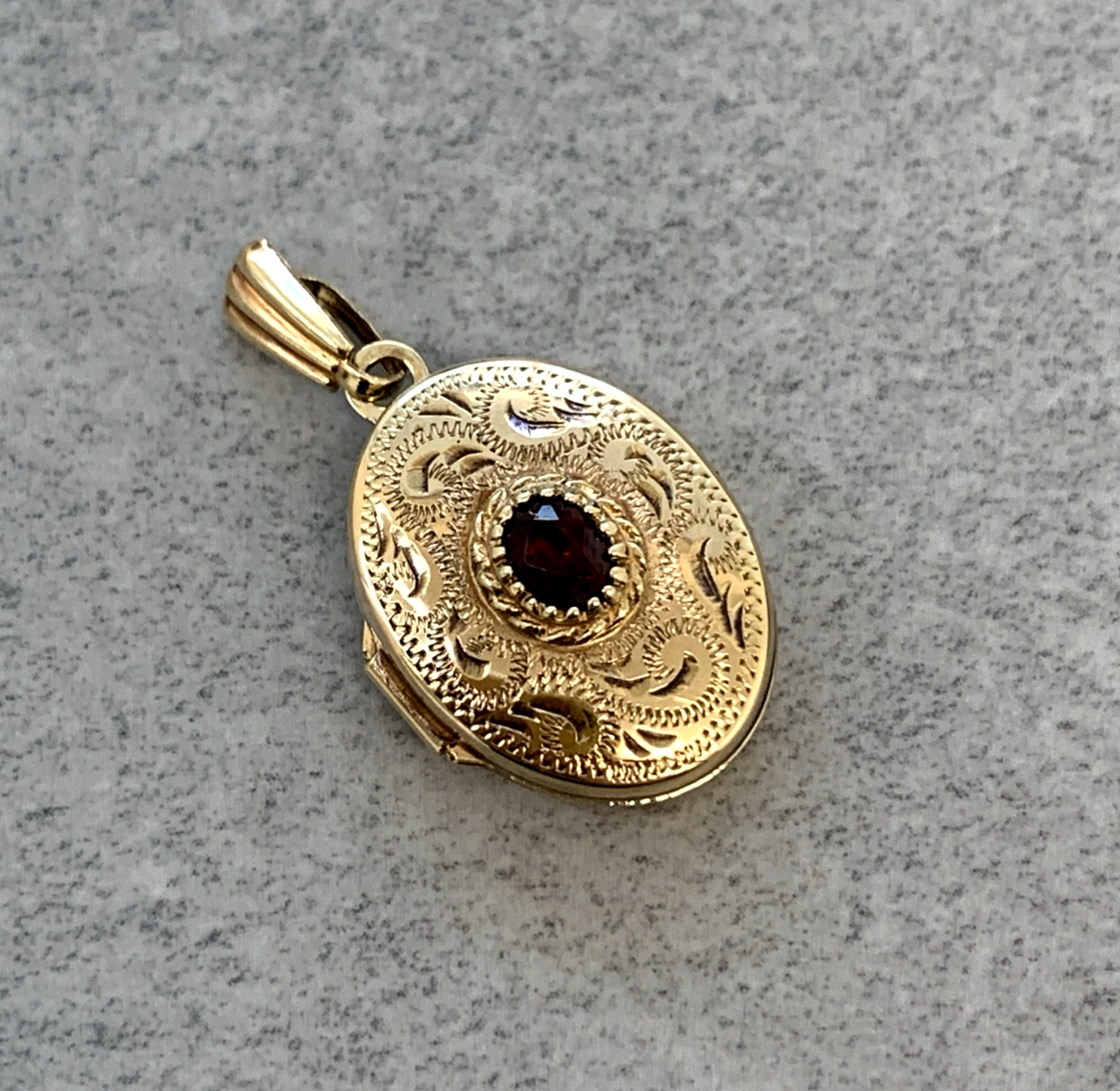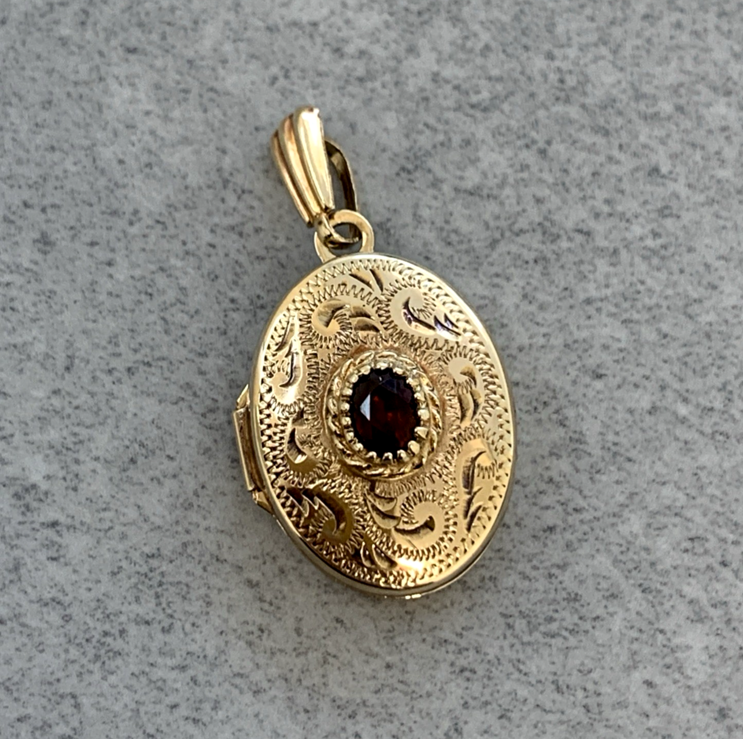 A gorgeous gold oval locket pendant showcasing a bezel set solitaire garnet accented by a rope edge and baroque style patterns.