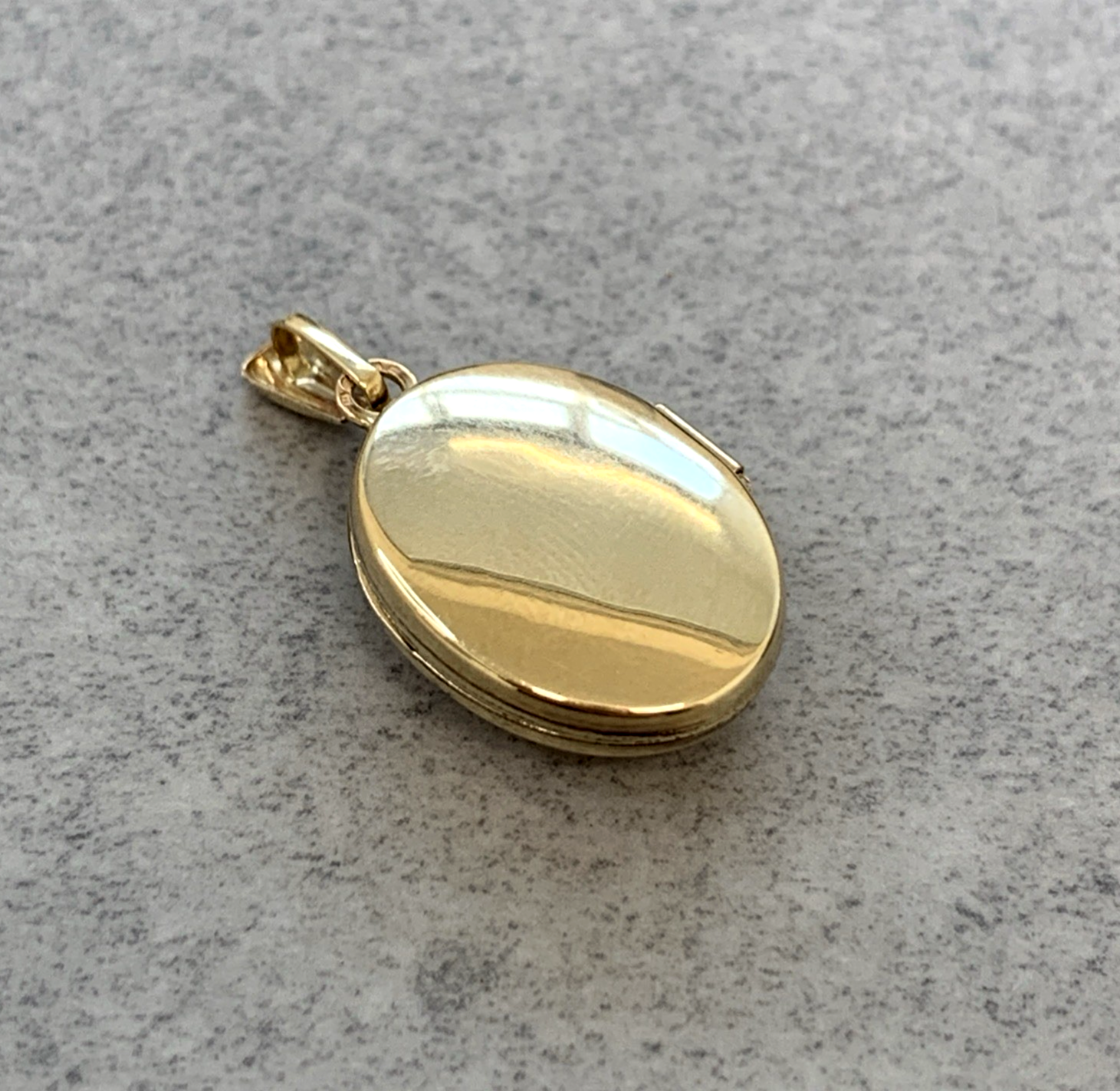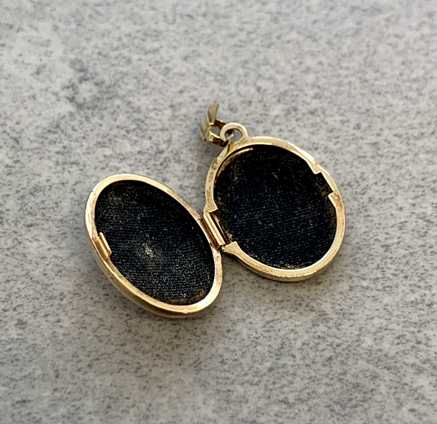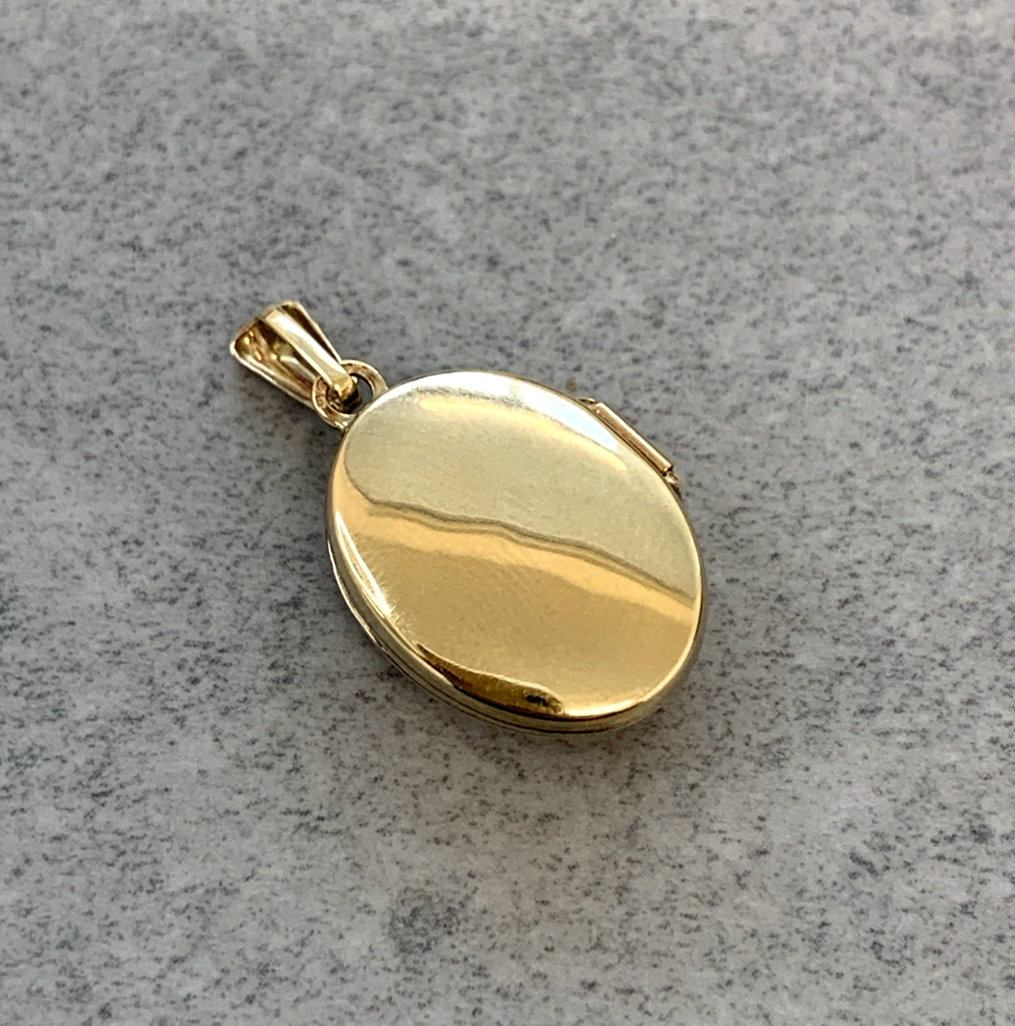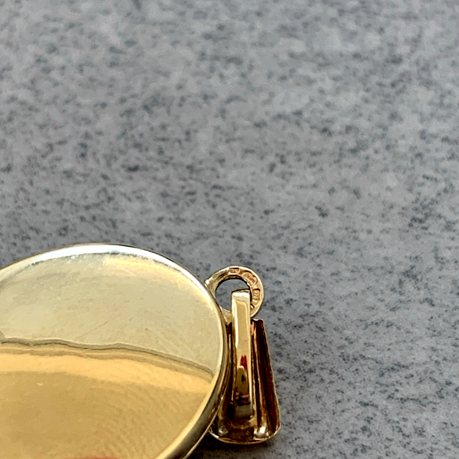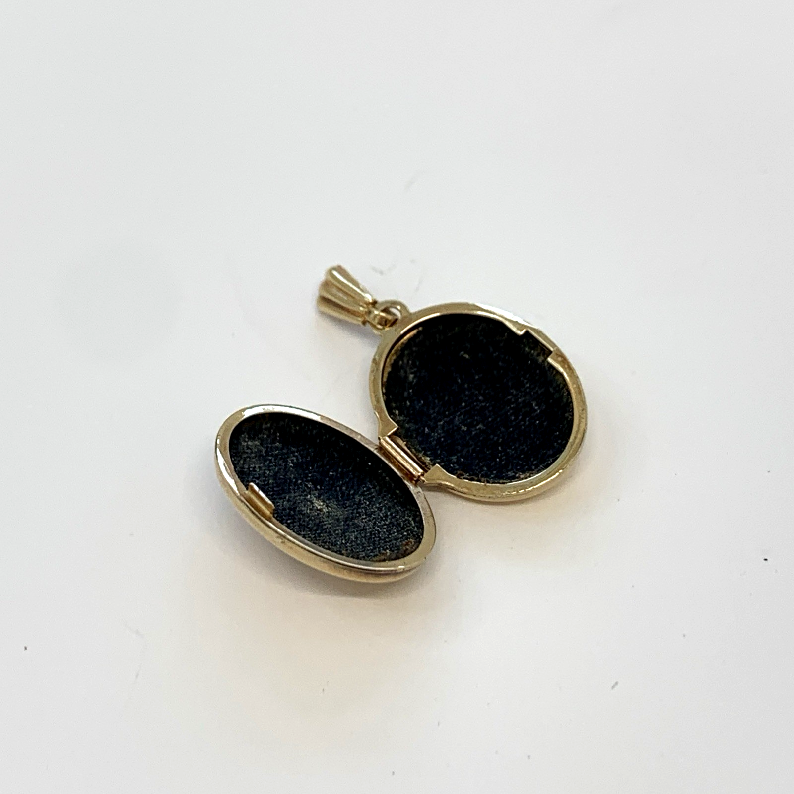 A gorgeous gold oval locket pendant showcasing a bezel set solitaire garnet accented by a rope edge and baroque style patterns.
