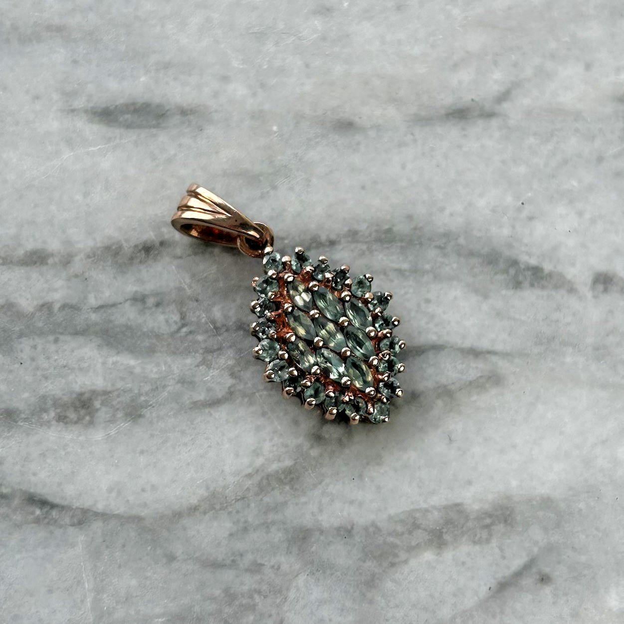 A stunning rose gold pendant featuring a collection of both marquise and round cut green spinel gemstones.