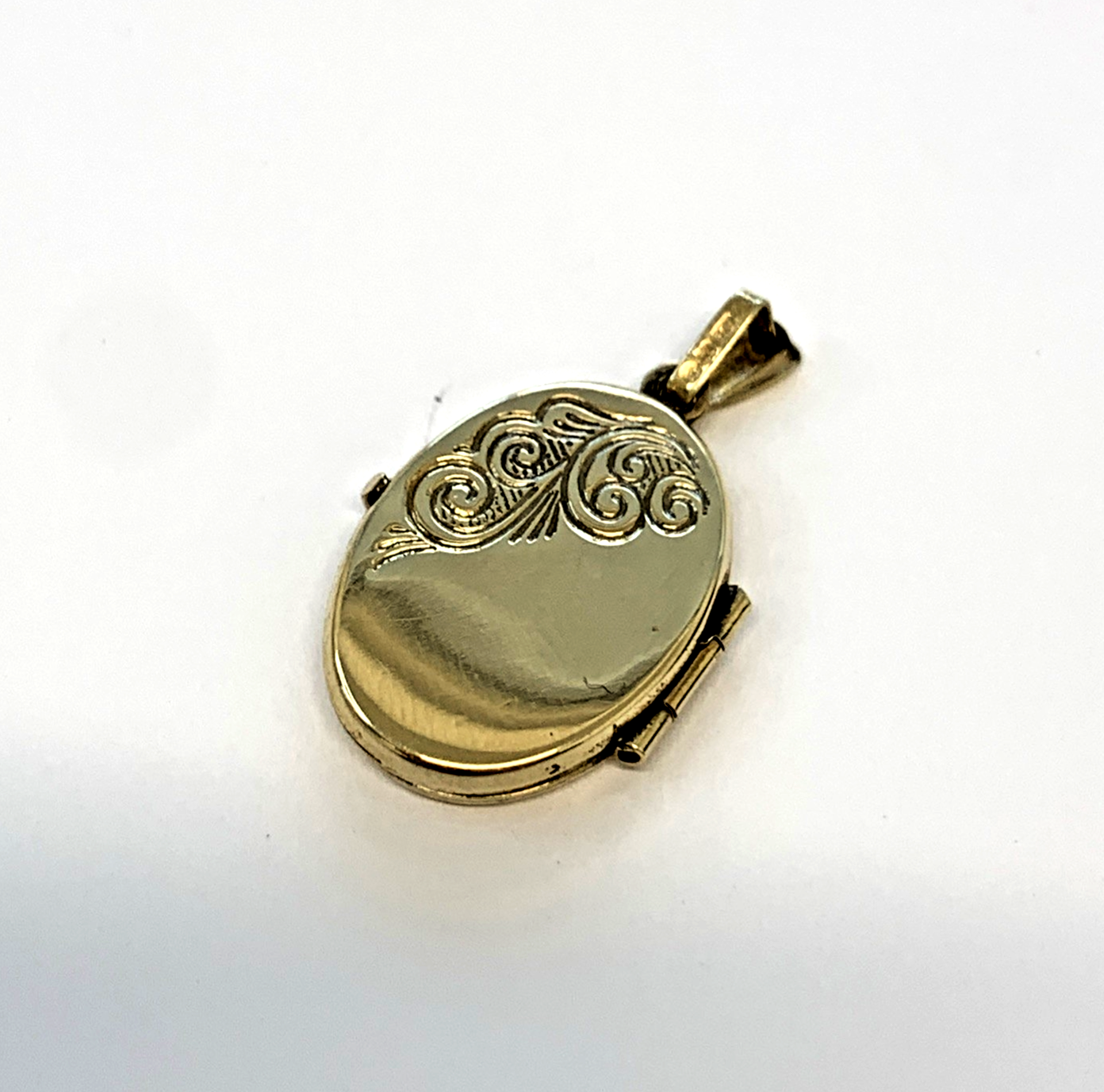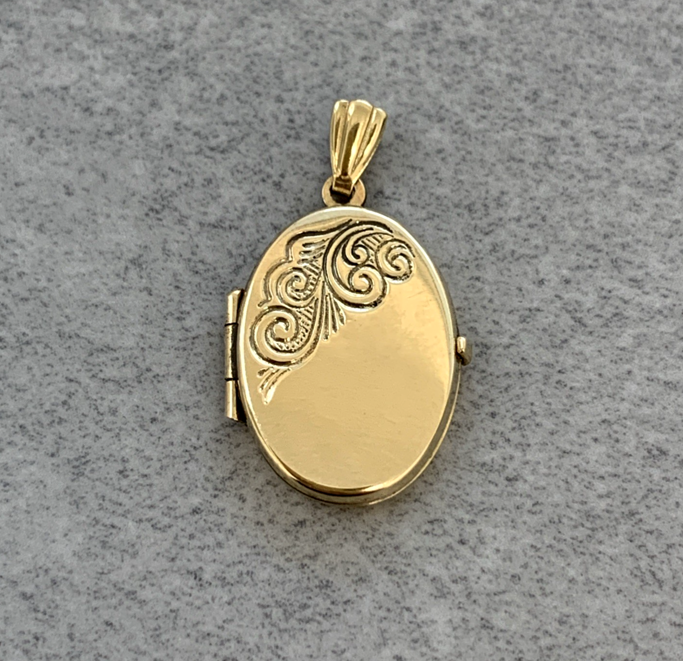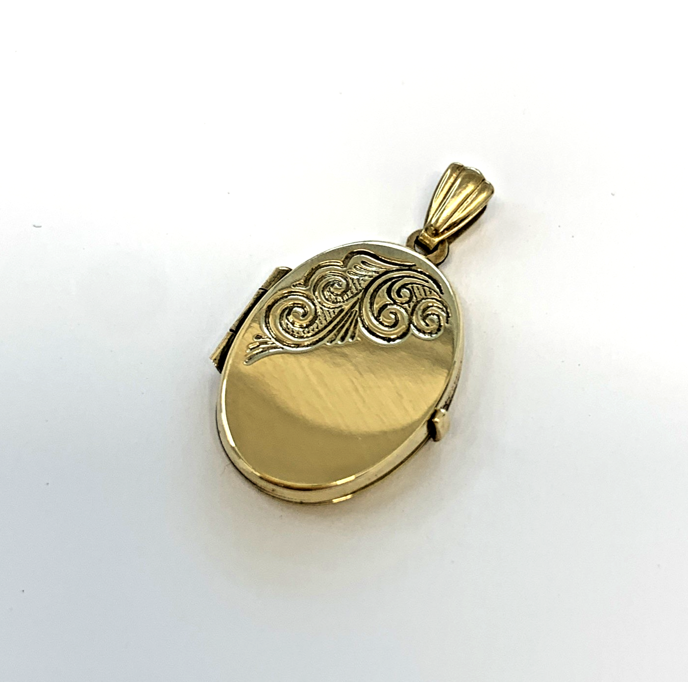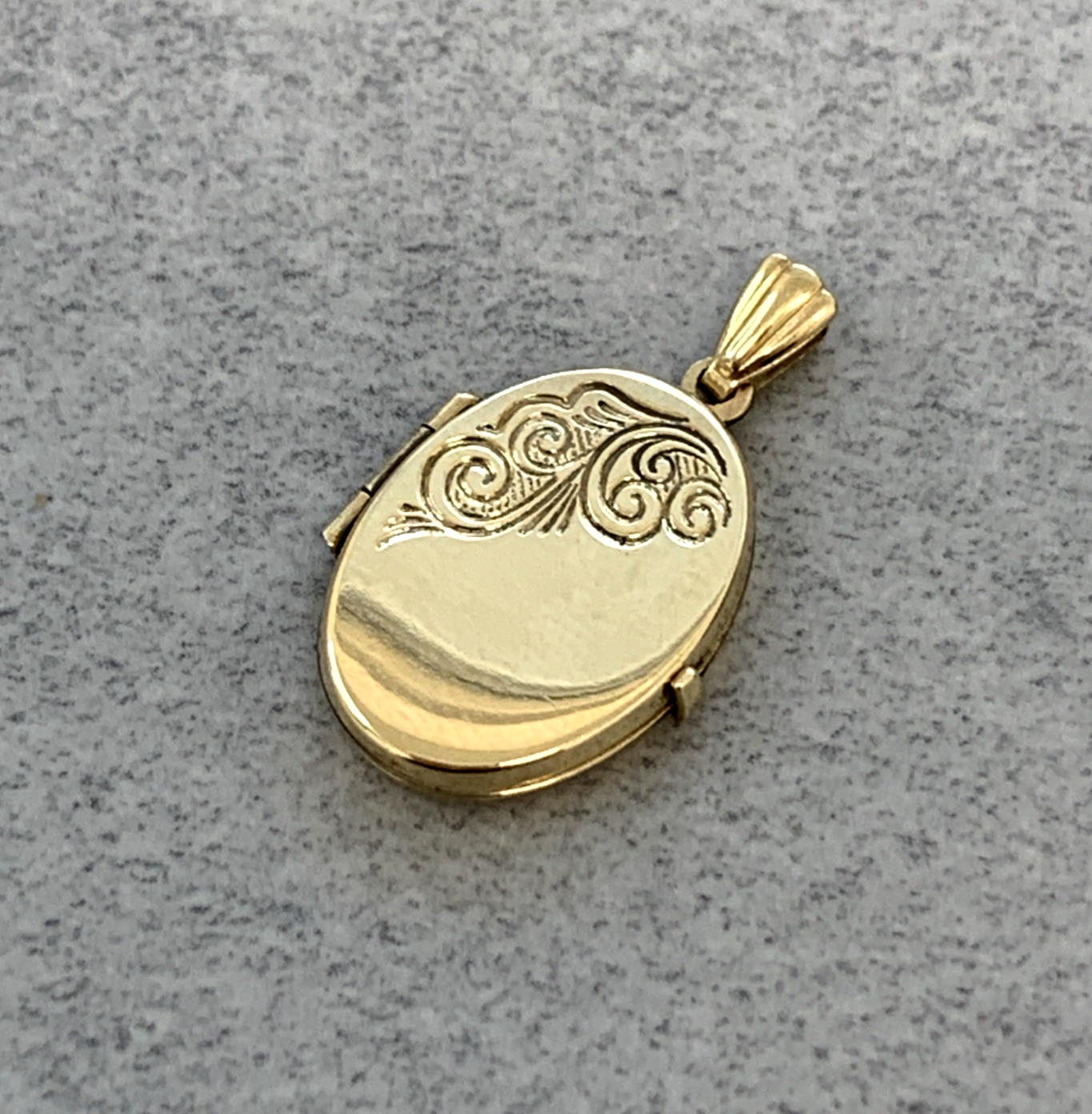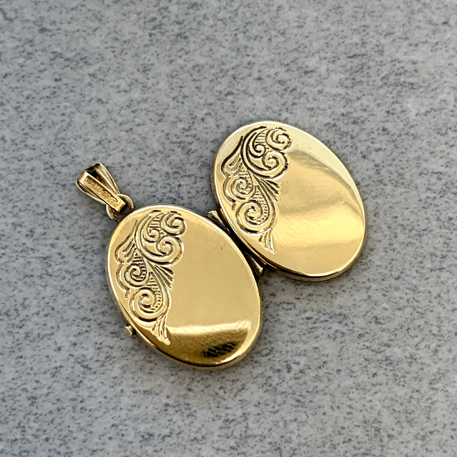 A beautiful petite oval shaped gold locket pendant featuring engraved patterns on both sides.